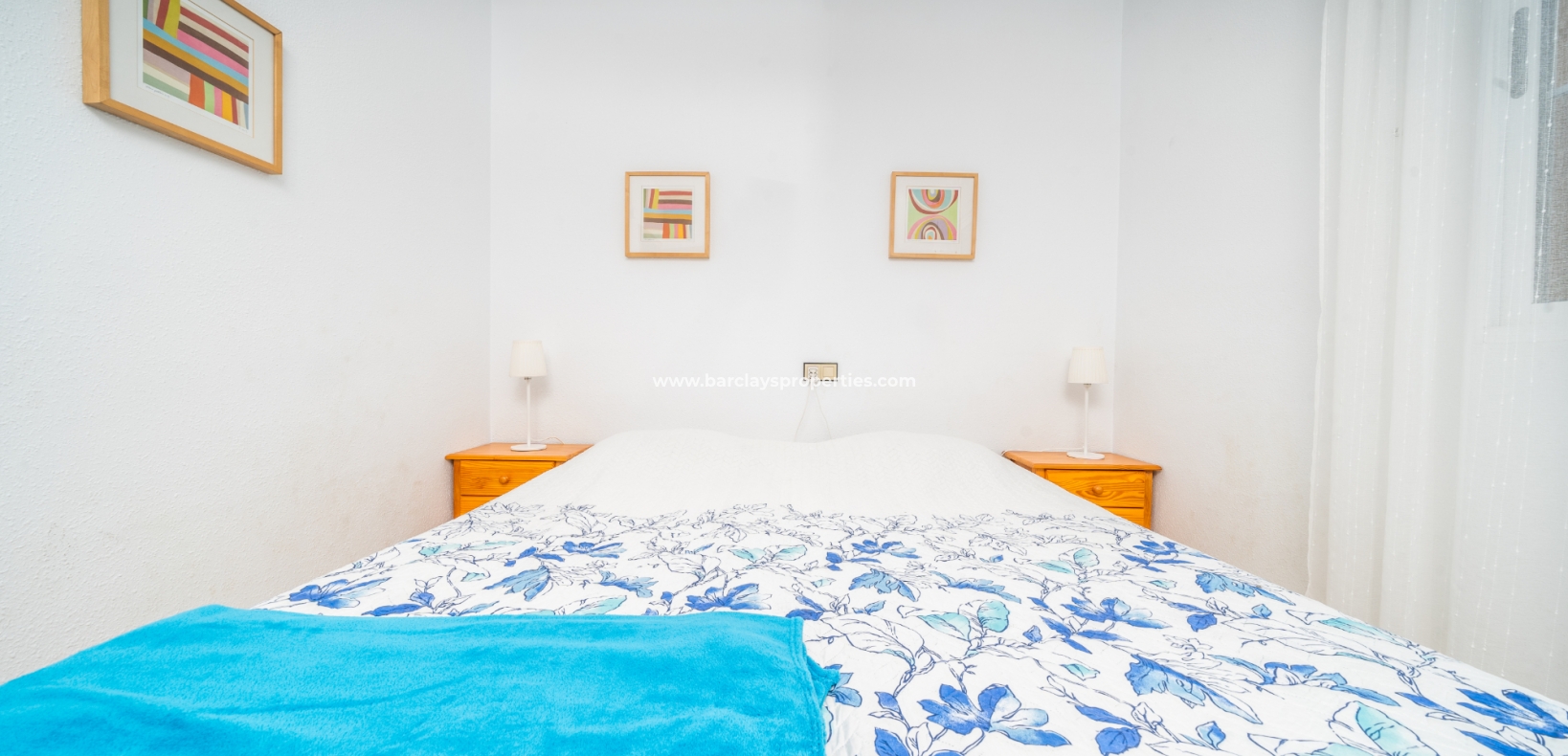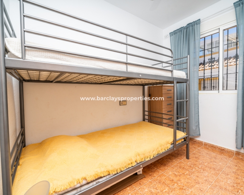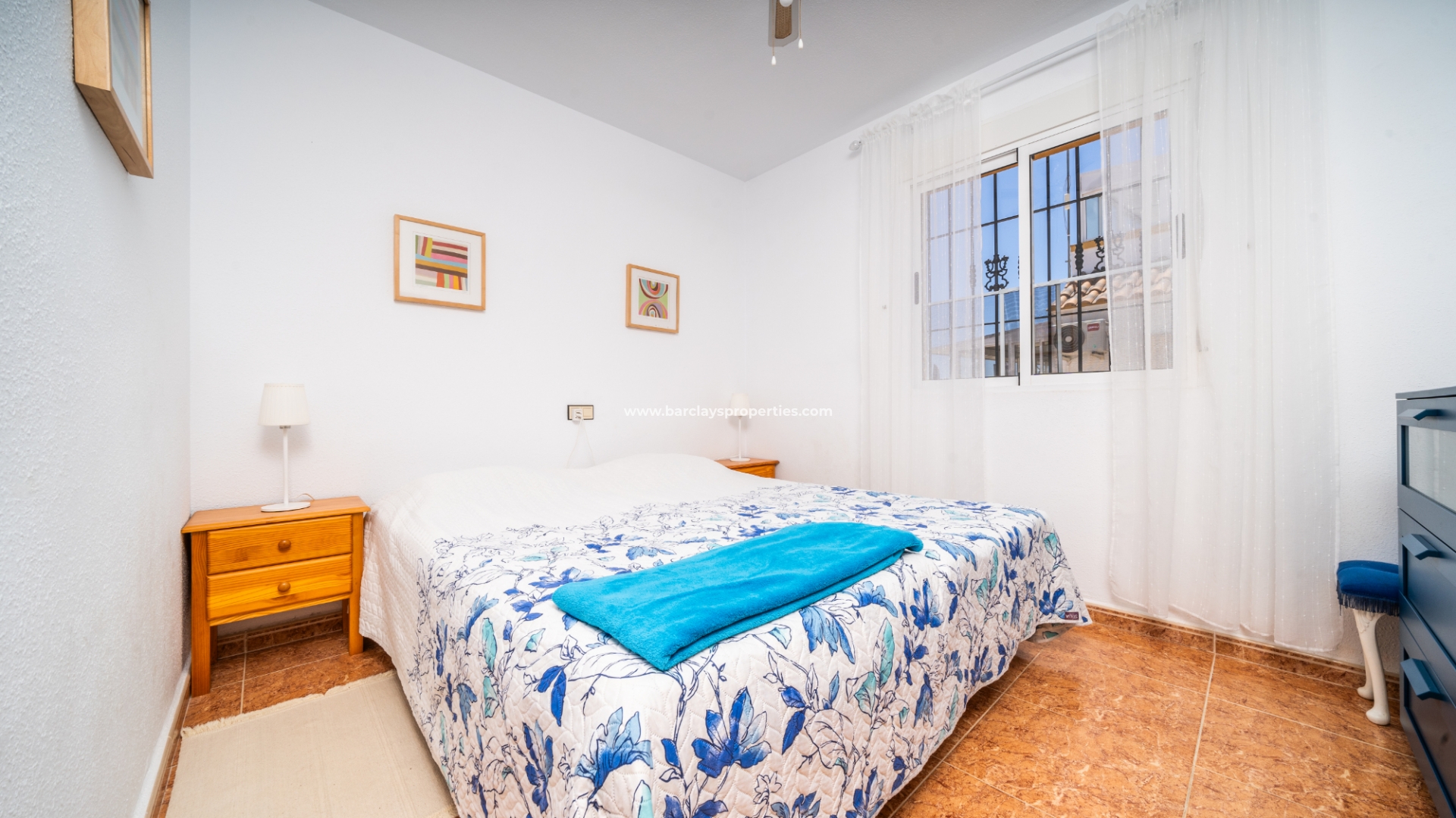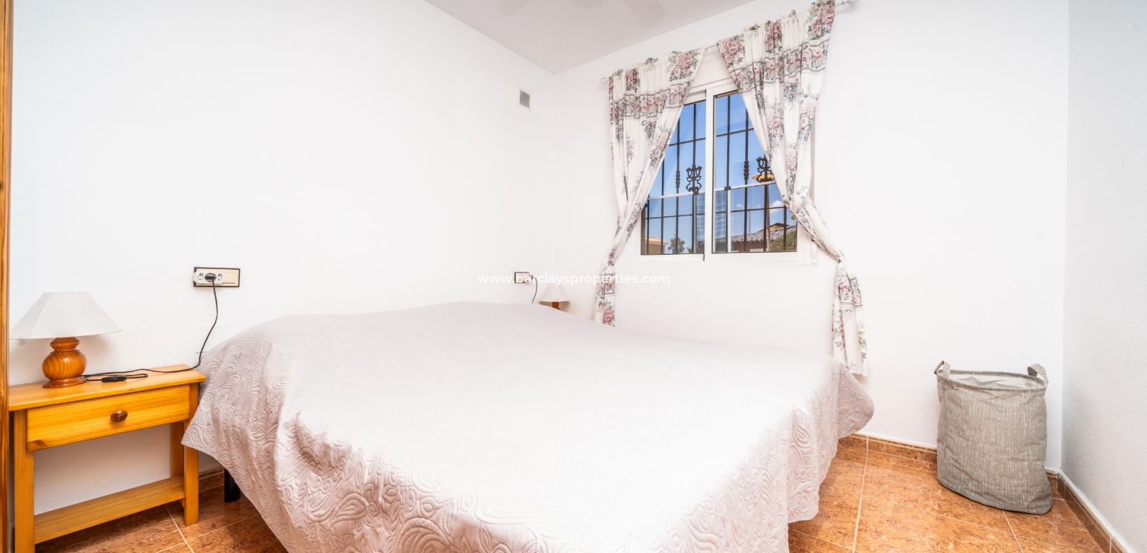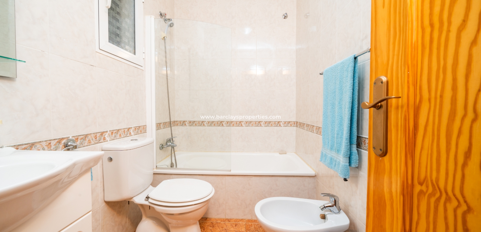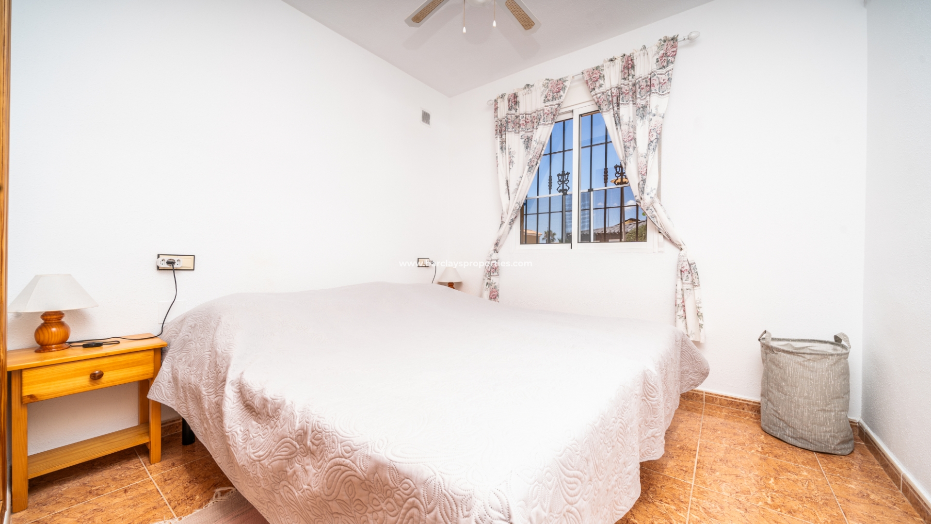 De eerste slaapkamer is een ruime tweepersoonskamer met ingebouwde kasten en een plafondventilator. De tweede slaapkamer heeft ook ingebouwde kasten, terwijl de derde slaapkamer een andere tweepersoonskamer is met een plafondventilator. De familiebadkamer is goed uitgerust met een volwaardig bad, WC, bidet en wastafel.