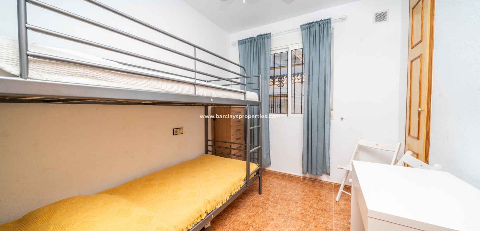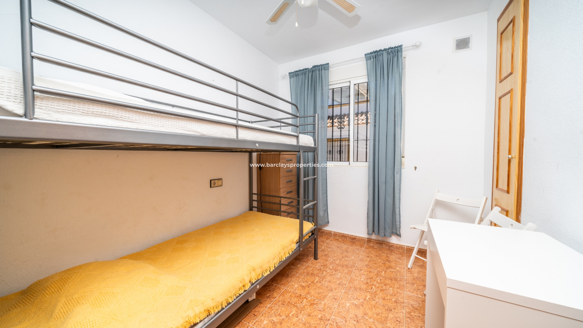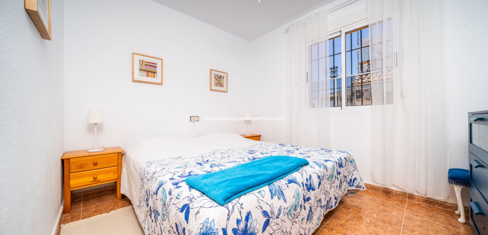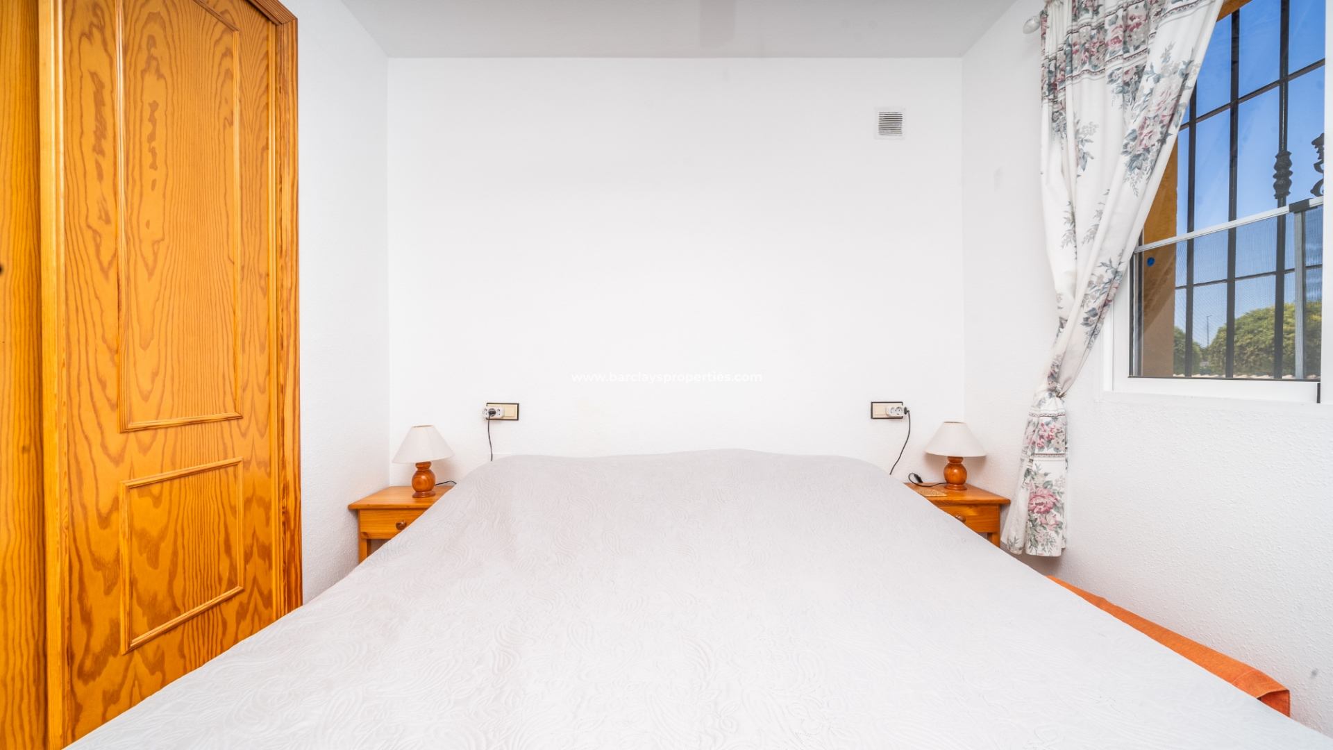 De eerste slaapkamer is een ruime tweepersoonskamer met ingebouwde kasten en een plafondventilator. De tweede slaapkamer heeft ook ingebouwde kasten, terwijl de derde slaapkamer een andere tweepersoonskamer is met een plafondventilator. De familiebadkamer is goed uitgerust met een volwaardig bad, WC, bidet en wastafel.