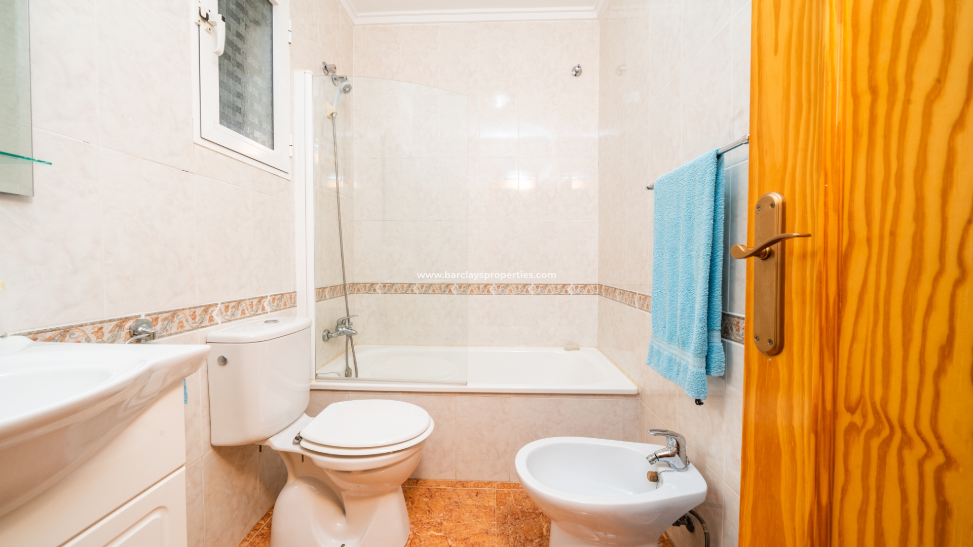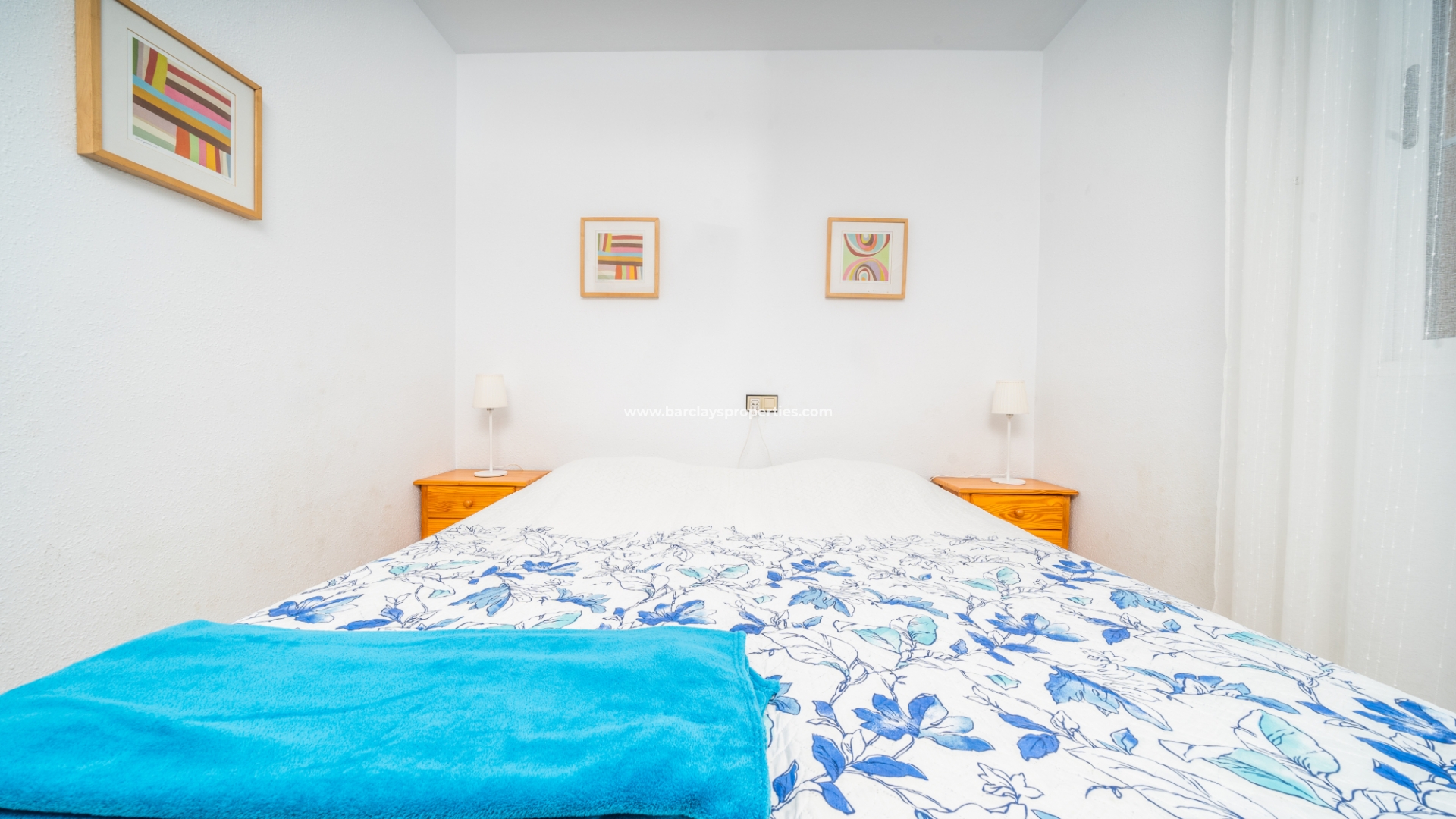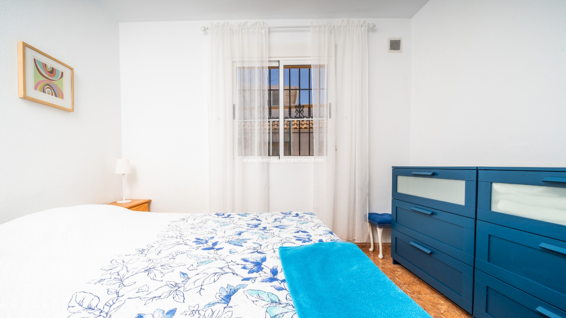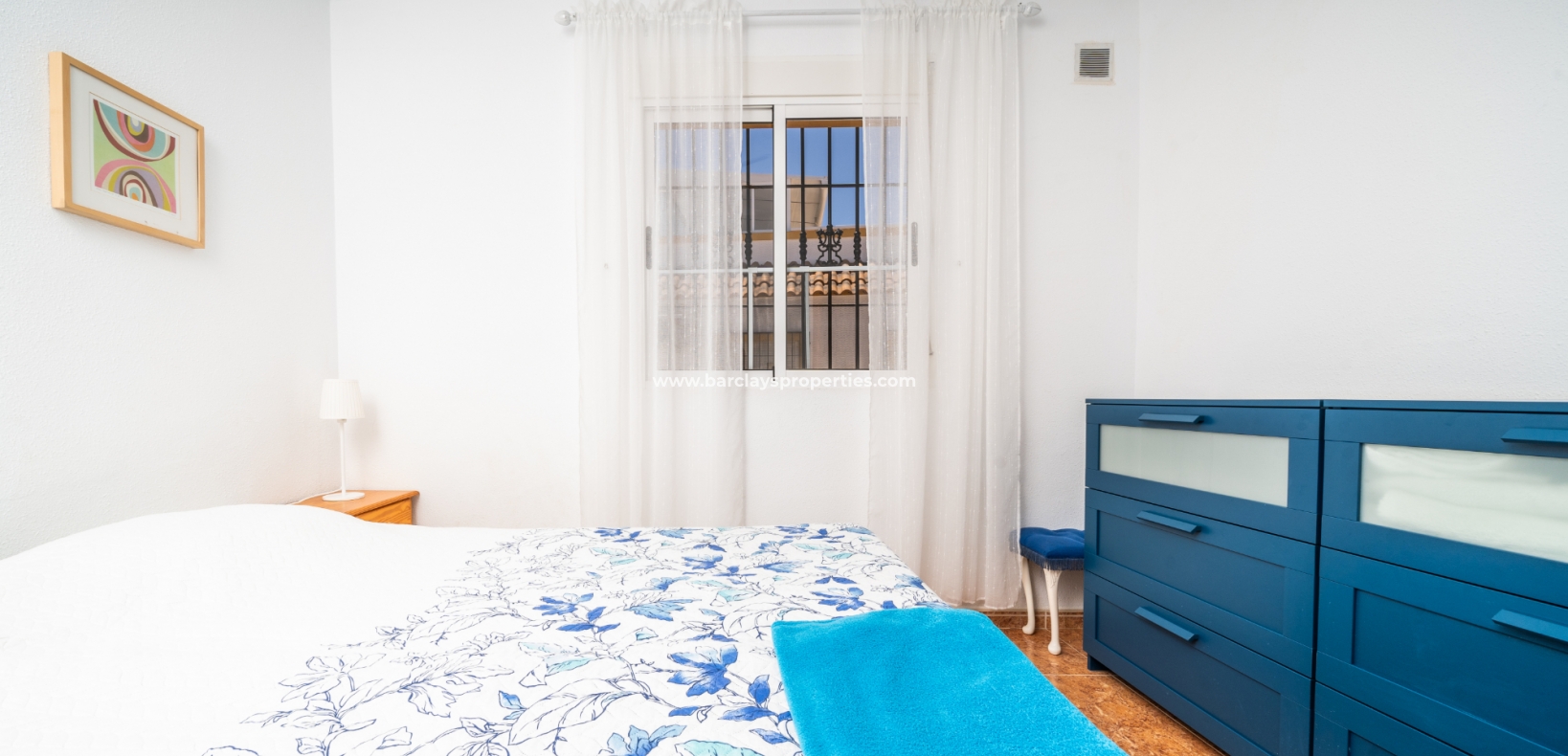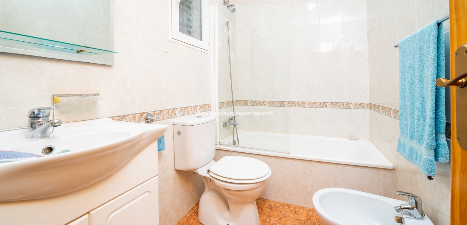 De eerste slaapkamer is een ruime tweepersoonskamer met ingebouwde kasten en een plafondventilator. De tweede slaapkamer heeft ook ingebouwde kasten, terwijl de derde slaapkamer een andere tweepersoonskamer is met een plafondventilator. De familiebadkamer is goed uitgerust met een volwaardig bad, WC, bidet en wastafel.