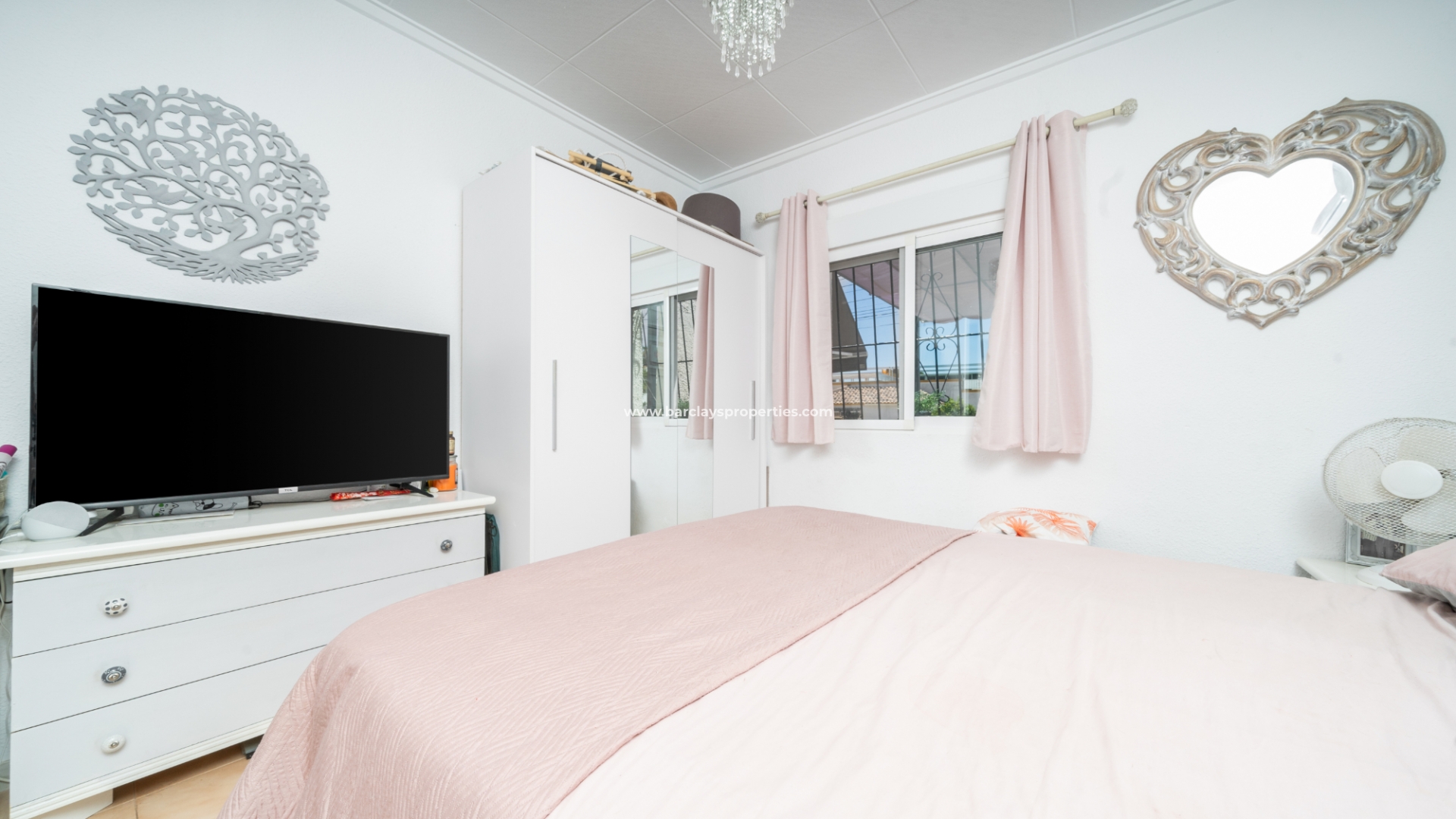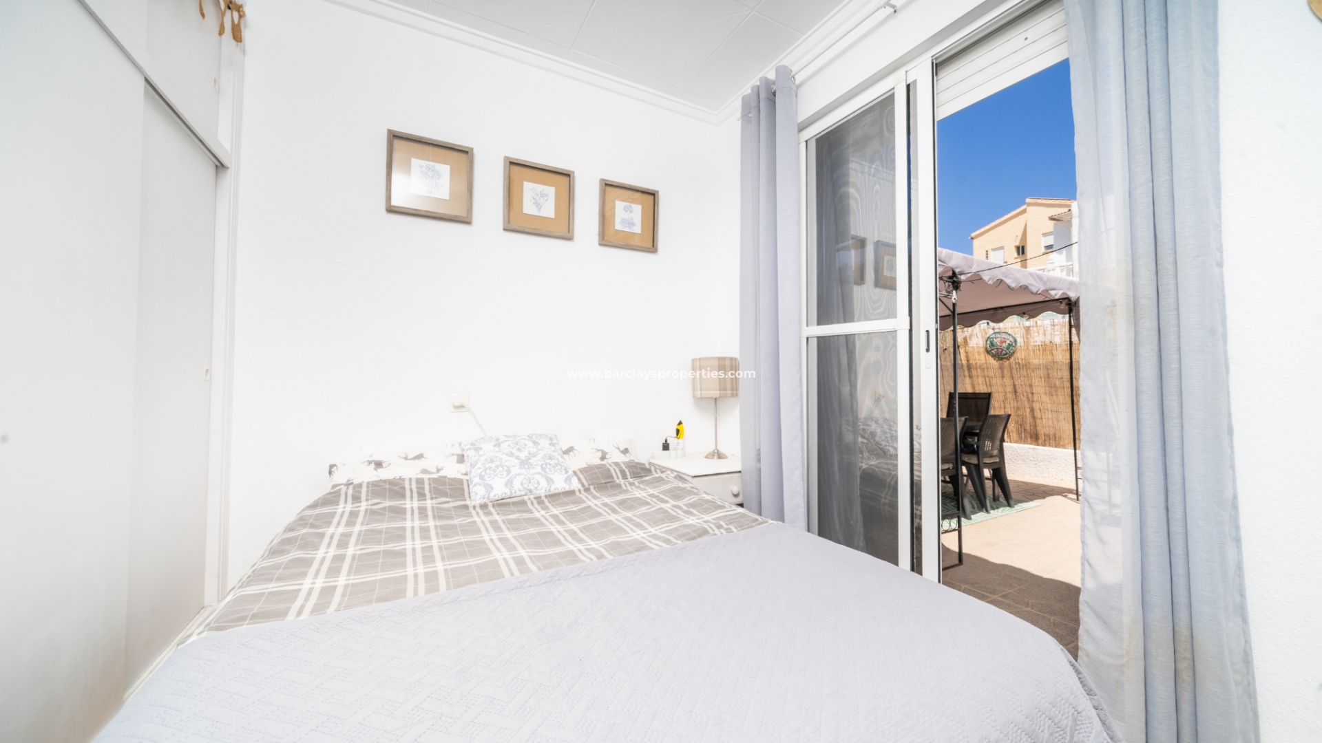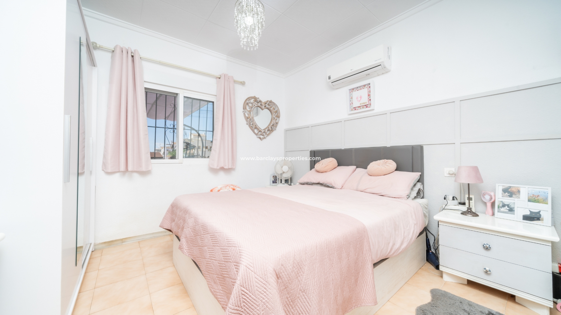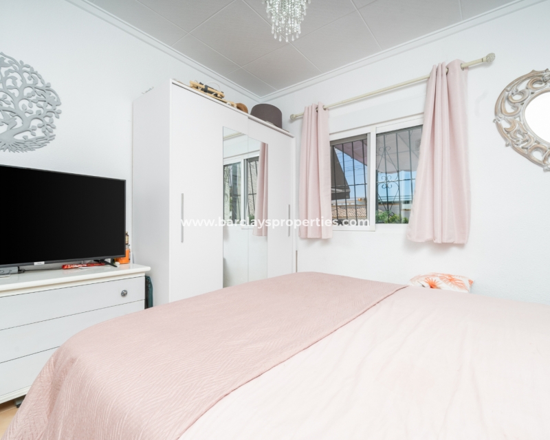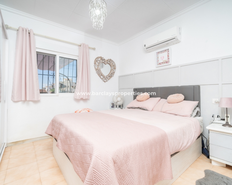 De ruime tweepersoonsslaapkamer heeft een ingebouwde kast en airconditioning, en biedt een comfortabele toevluchtsoord. Een andere tweepersoonsslaapkamer heeft een ingebouwde kast en openslaande deuren naar de achtertuin en het zwembad, wat zorgt voor veel natuurlijk licht en gemakkelijke toegang tot buiten. De eigentijdse badkamer beschikt over een inloopdouche, WC en een wastafelmeubel met gootsteen, wat een stijlvolle en functionele ruimte biedt.