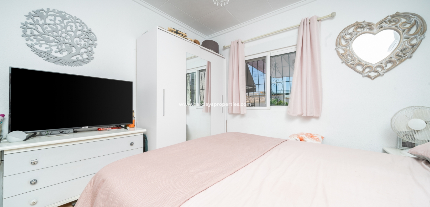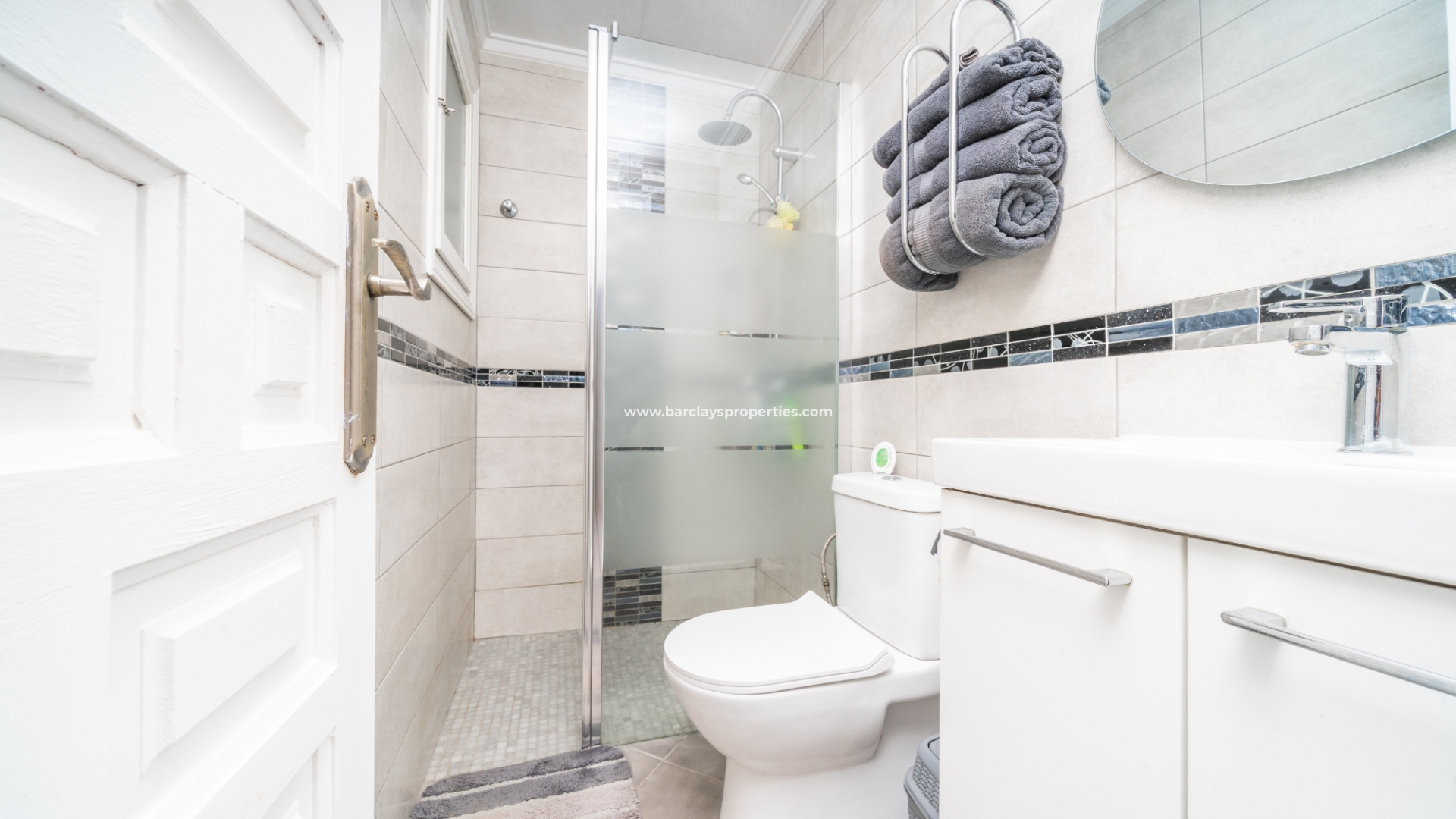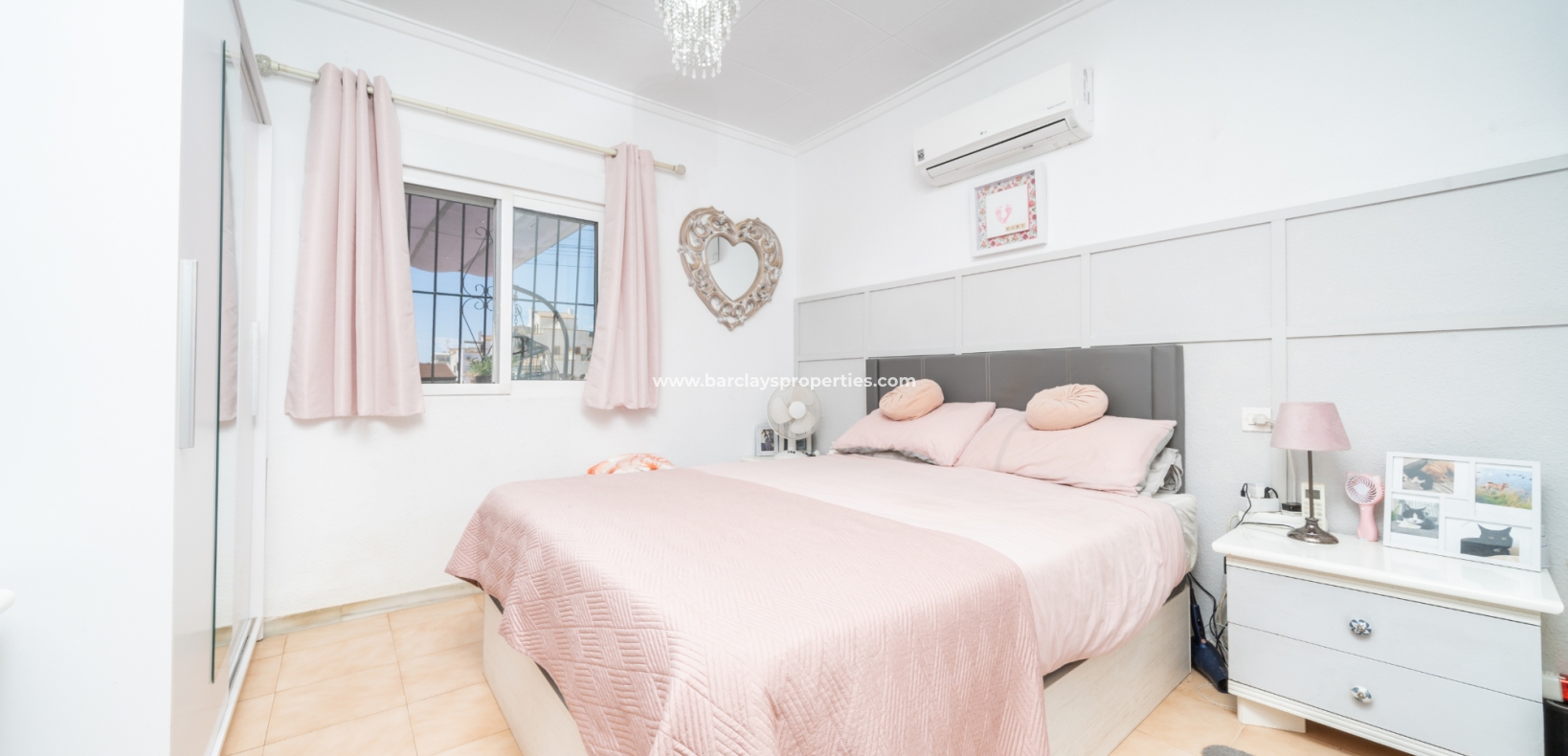 De ruime tweepersoonsslaapkamer heeft een ingebouwde kast en airconditioning, en biedt een comfortabele toevluchtsoord. Een andere tweepersoonsslaapkamer heeft een ingebouwde kast en openslaande deuren naar de achtertuin en het zwembad, wat zorgt voor veel natuurlijk licht en gemakkelijke toegang tot buiten. De eigentijdse badkamer beschikt over een inloopdouche, WC en een wastafelmeubel met gootsteen, wat een stijlvolle en functionele ruimte biedt.
