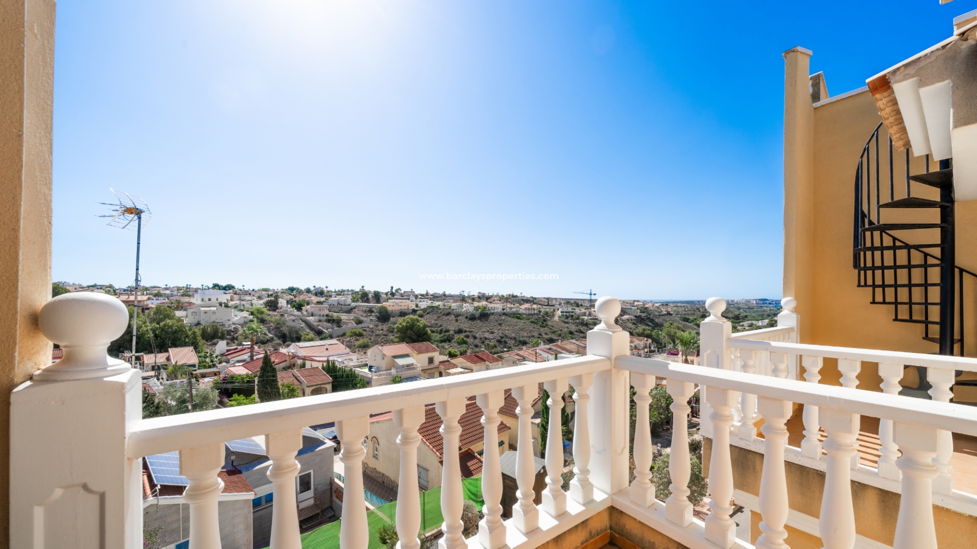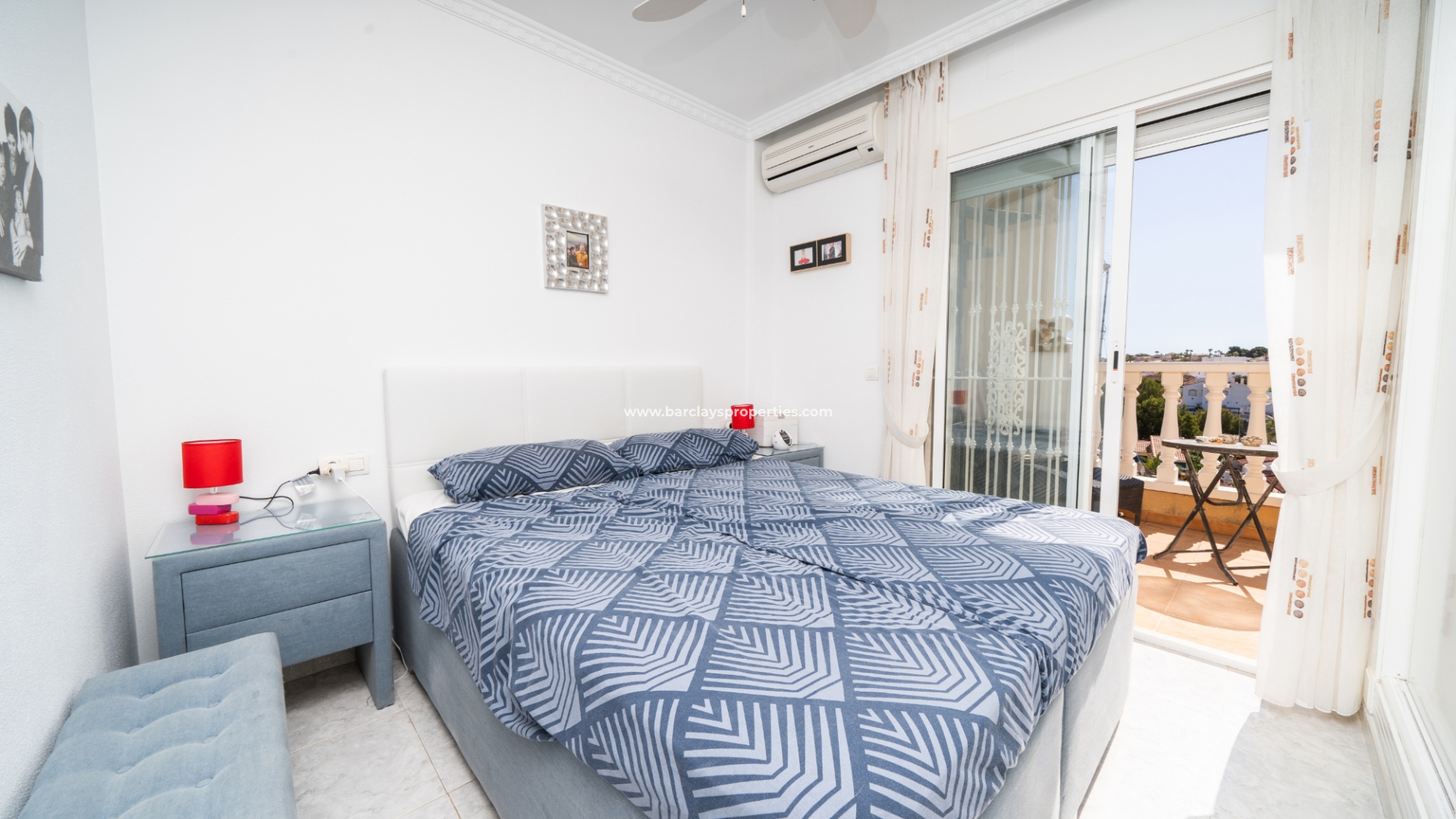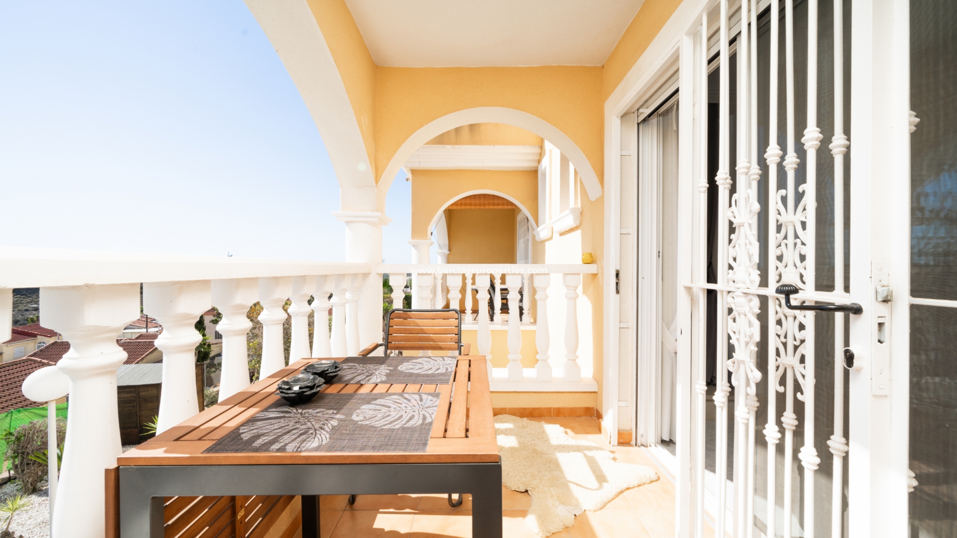 Op de bovenverdieping is de badkamer uitgerust met een bad, toilet, bidet en een wastafelmeubel. De eerste slaapkamer heeft een plafondventilator, ingebouwde kast en airconditioning. De tweede slaapkamer is een tweepersoonskamer met ingebouwde kasten, airconditioning en plafondventilator en heeft openslaande deuren naar een balkon met prachtig uitzicht.