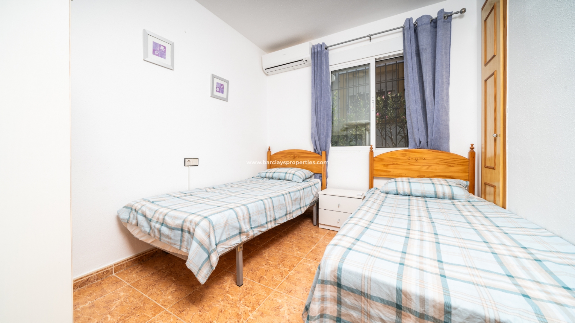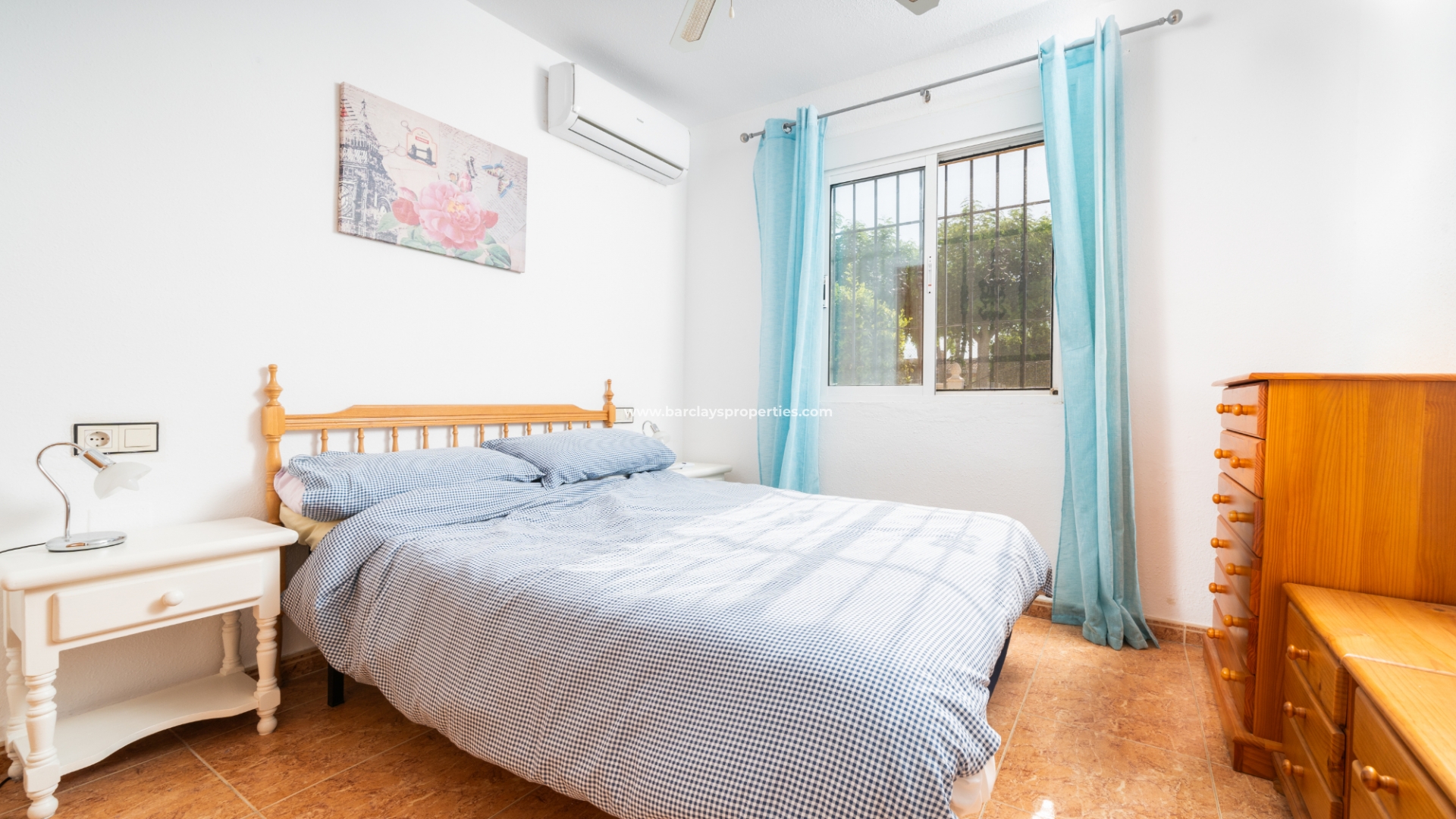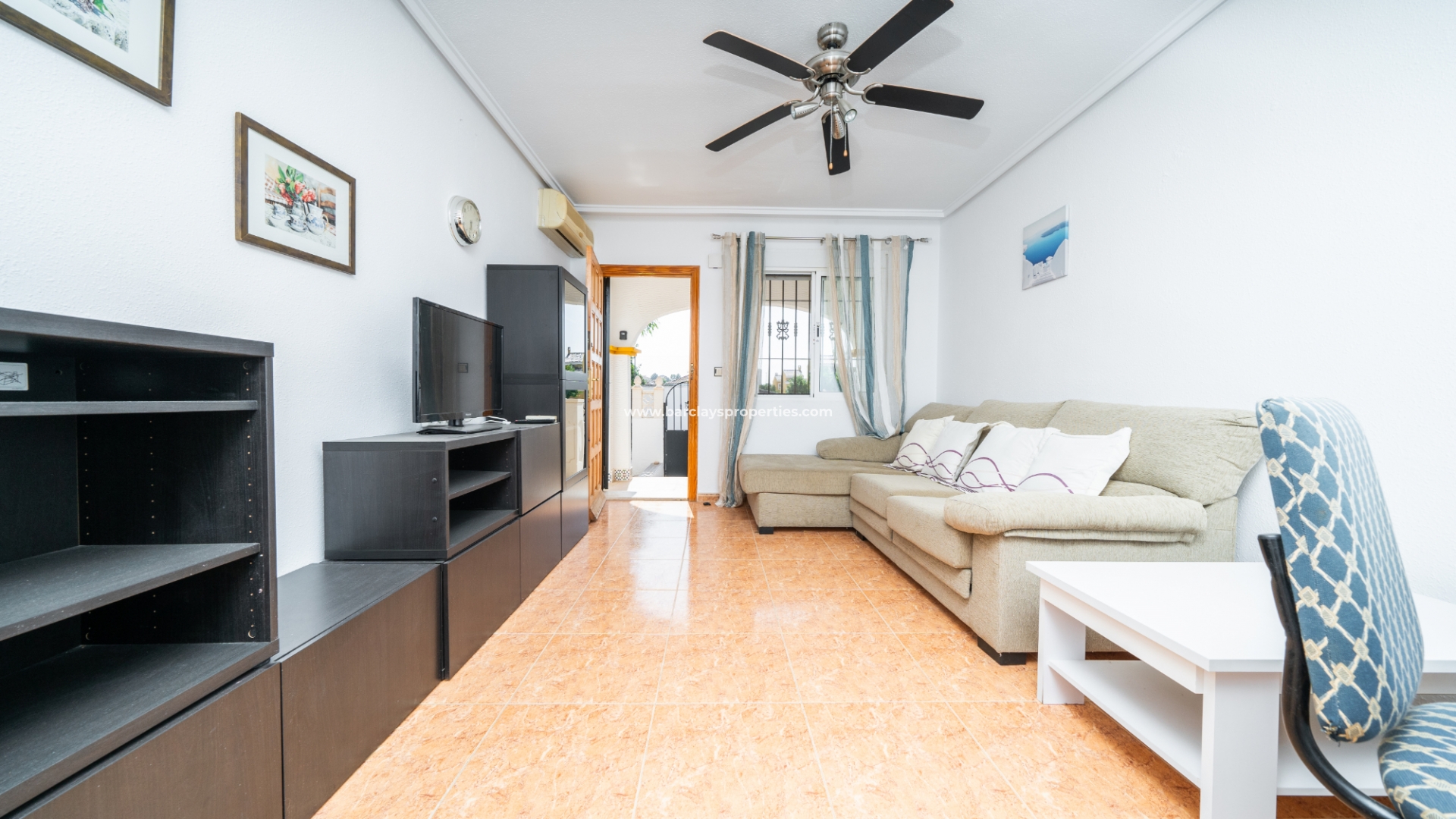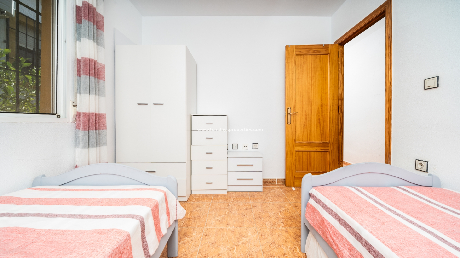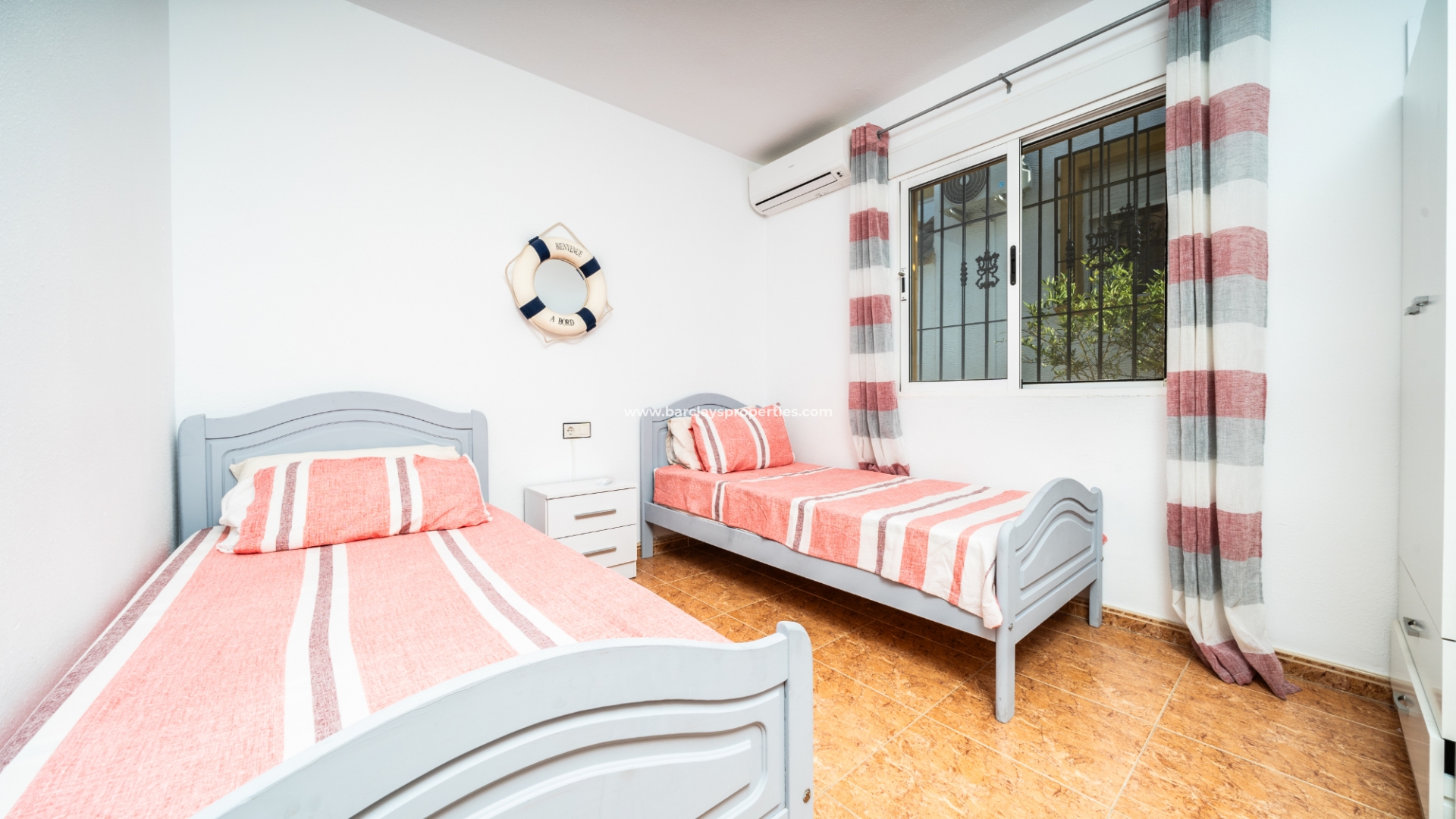 De woning beschikt over een privéparkeerplaats en een zitgedeelte in de tuin dat leidt naar een charmante overdekte veranda met zitgedeelte, ideaal voor buitenleven, compleet met een zonnescherm dat schaduw biedt op zonnige dagen. Binnenin is de lichte en uitnodigende woonkamer met toegewezen eetgedeelte uitgerust met airconditioning en een plafondventilator, wat comfort het hele jaar door garandeert. De master slaapkamer heeft een tweepersoonsbed, een ingebouwde kast voor voldoende opbergruimte, airconditioning en een plafondventilator. De tweede slaapkamer, ontworpen met twee eenpersoonsbedden, is voorzien van airconditioning om de ruimte koel en aangenaam te houden, evenals een enkele ingebouwde kast. De derde slaapkamer biedt ook plaats aan twee eenpersoonsbedden en is voorzien van airconditioning, waardoor het perfect is voor gasten of gezinsleden.