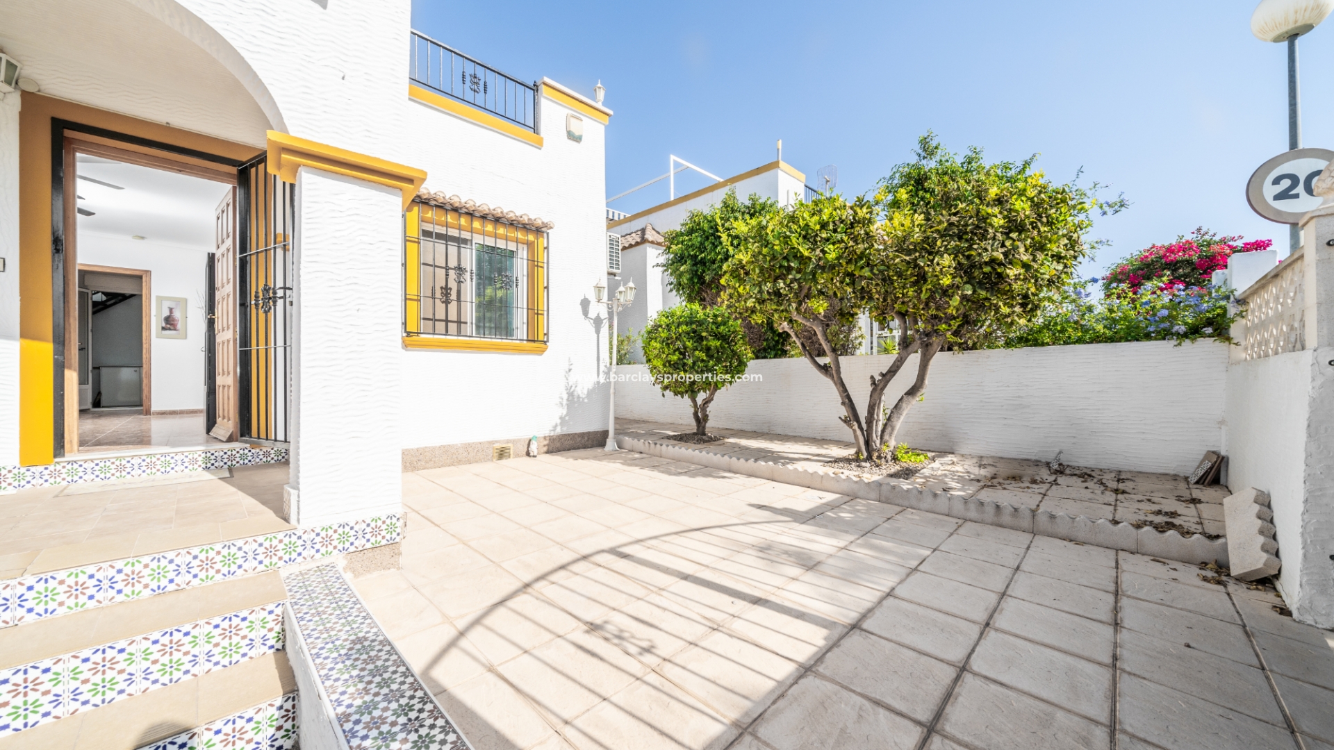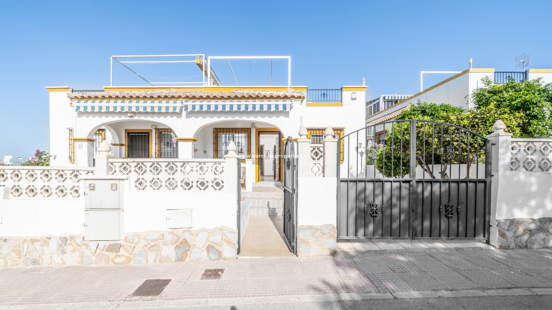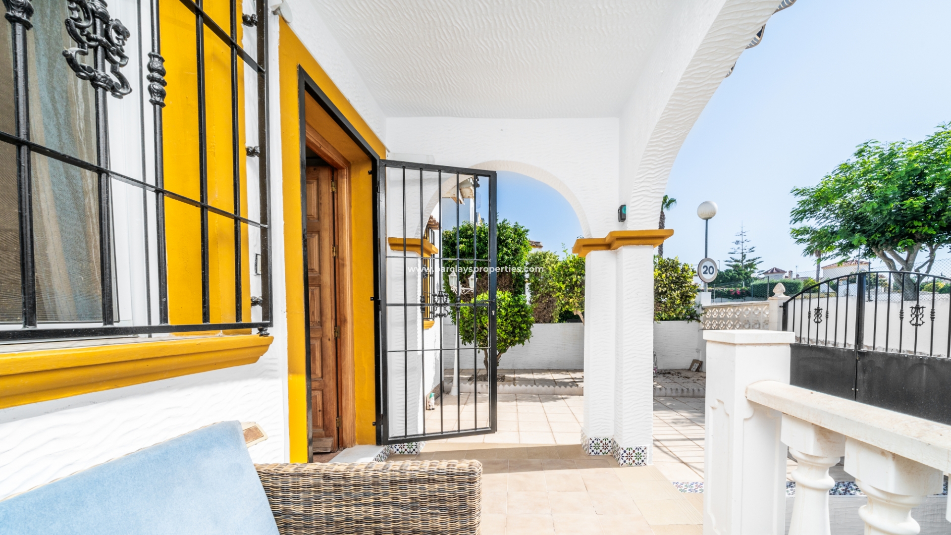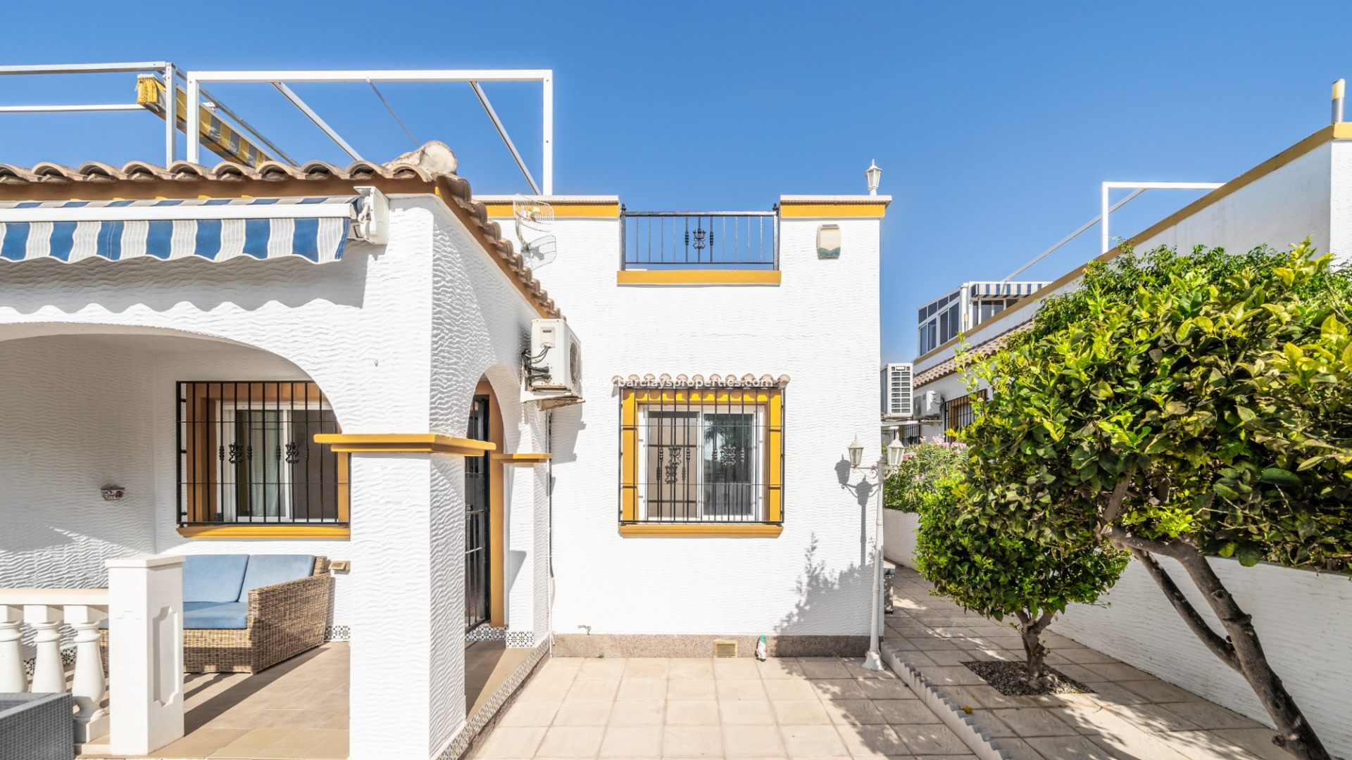 De woning beschikt over een privéparkeerplaats en een zitgedeelte in de tuin dat leidt naar een charmante overdekte veranda met zitgedeelte, ideaal voor buitenleven, compleet met een zonnescherm dat schaduw biedt op zonnige dagen. Binnenin is de lichte en uitnodigende woonkamer met toegewezen eetgedeelte uitgerust met airconditioning en een plafondventilator, wat comfort het hele jaar door garandeert. De master slaapkamer heeft een tweepersoonsbed, een ingebouwde kast voor voldoende opbergruimte, airconditioning en een plafondventilator. De tweede slaapkamer, ontworpen met twee eenpersoonsbedden, is voorzien van airconditioning om de ruimte koel en aangenaam te houden, evenals een enkele ingebouwde kast. De derde slaapkamer biedt ook plaats aan twee eenpersoonsbedden en is voorzien van airconditioning, waardoor het perfect is voor gasten of gezinsleden.