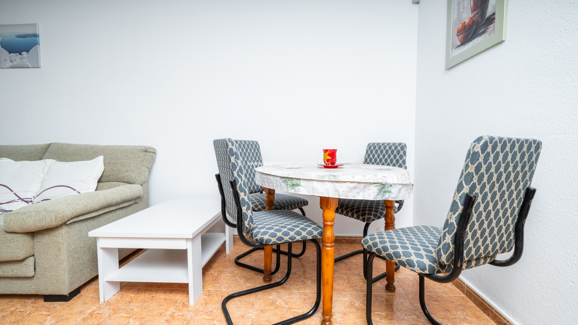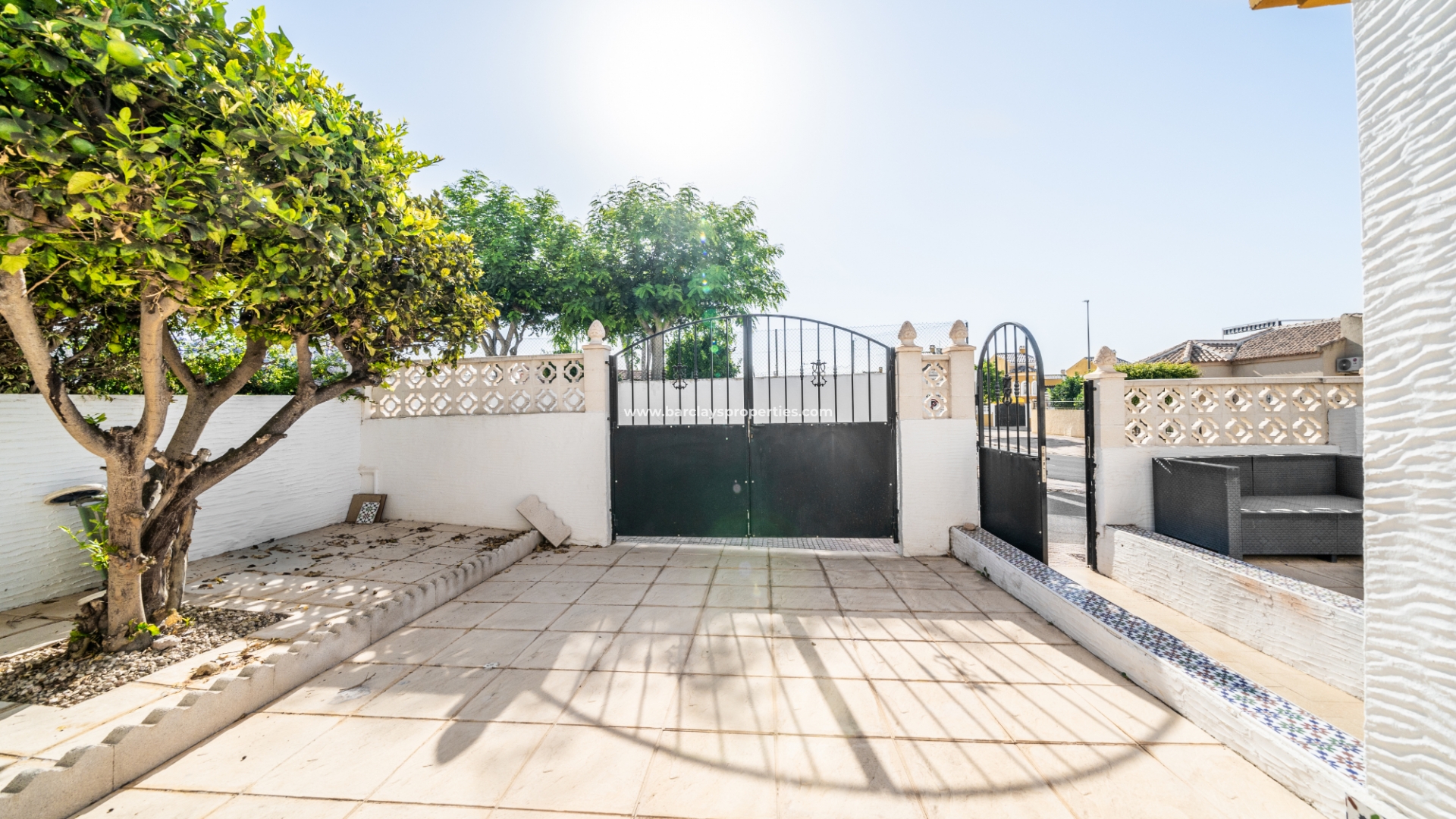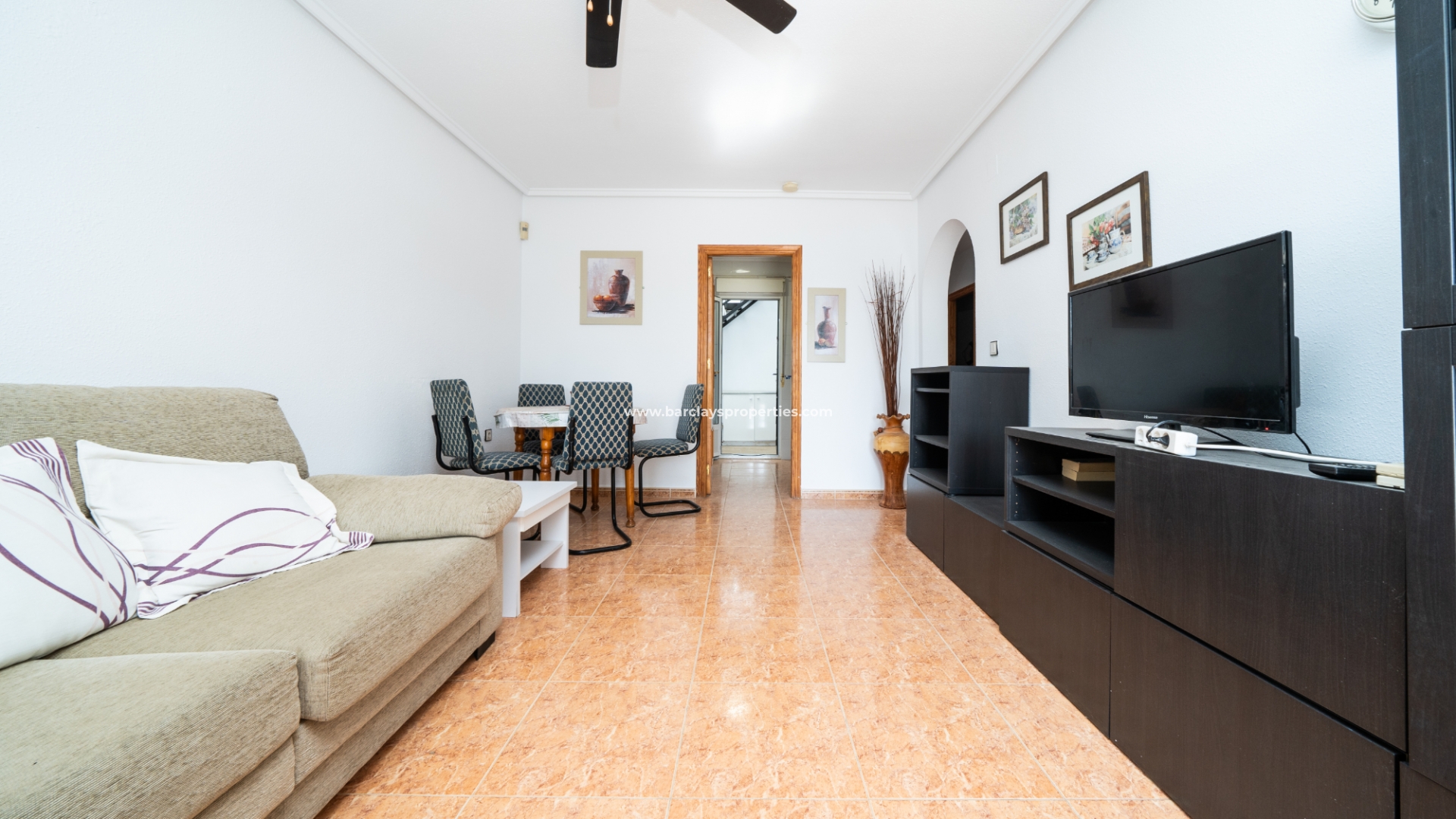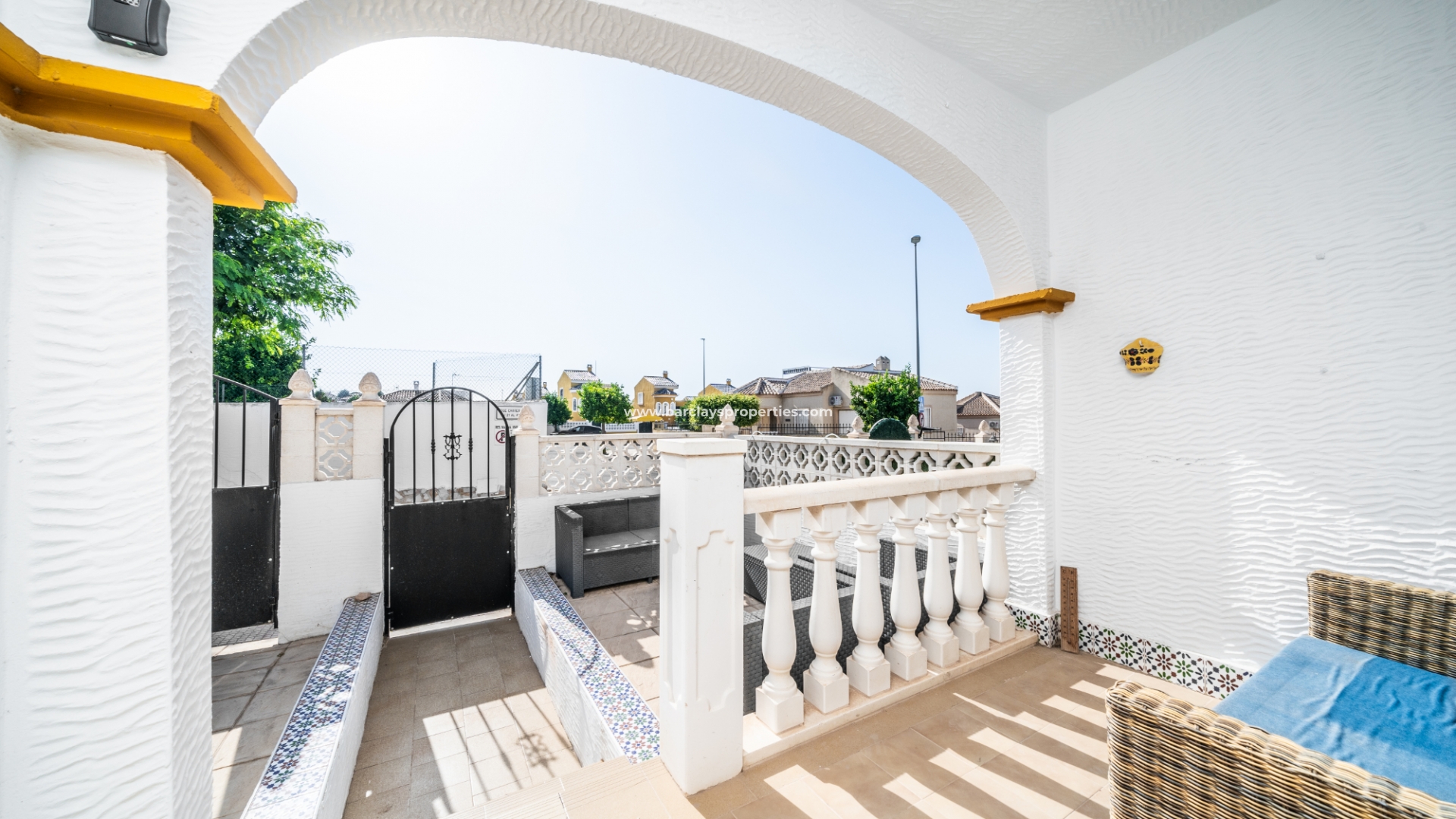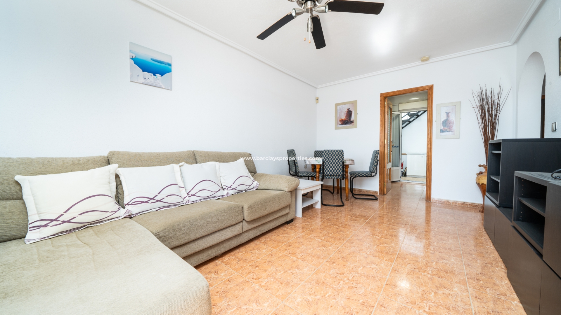 De woning beschikt over een privéparkeerplaats en een zitgedeelte in de tuin dat leidt naar een charmante overdekte veranda met zitgedeelte, ideaal voor buitenleven, compleet met een zonnescherm dat schaduw biedt op zonnige dagen. Binnenin is de lichte en uitnodigende woonkamer met toegewezen eetgedeelte uitgerust met airconditioning en een plafondventilator, wat comfort het hele jaar door garandeert. De master slaapkamer heeft een tweepersoonsbed, een ingebouwde kast voor voldoende opbergruimte, airconditioning en een plafondventilator. De tweede slaapkamer, ontworpen met twee eenpersoonsbedden, is voorzien van airconditioning om de ruimte koel en aangenaam te houden, evenals een enkele ingebouwde kast. De derde slaapkamer biedt ook plaats aan twee eenpersoonsbedden en is voorzien van airconditioning, waardoor het perfect is voor gasten of gezinsleden.