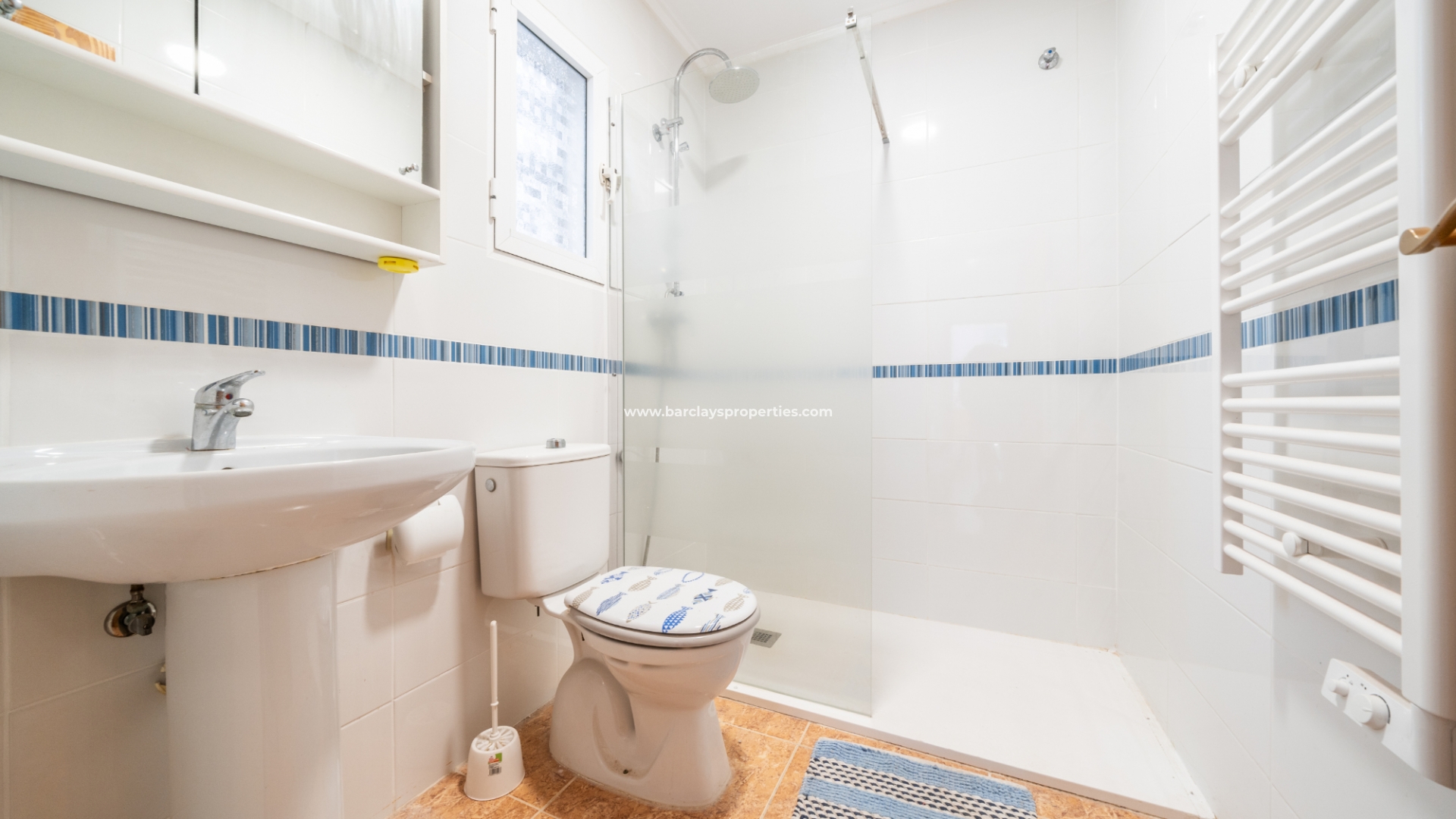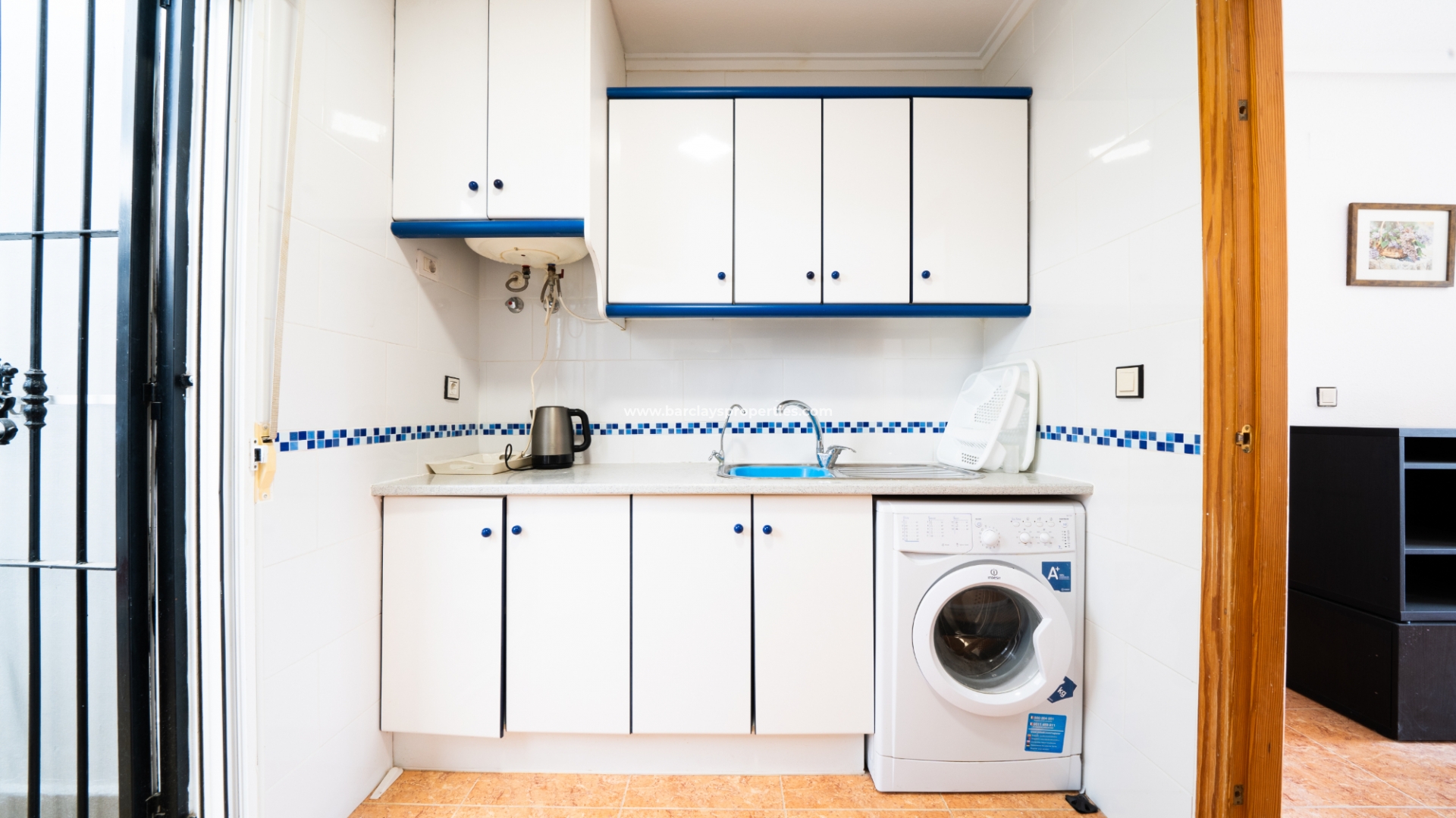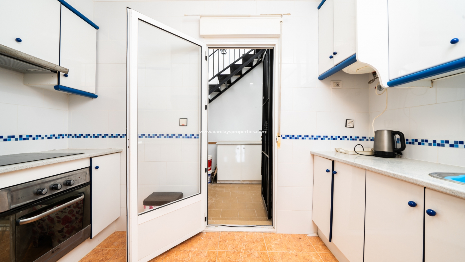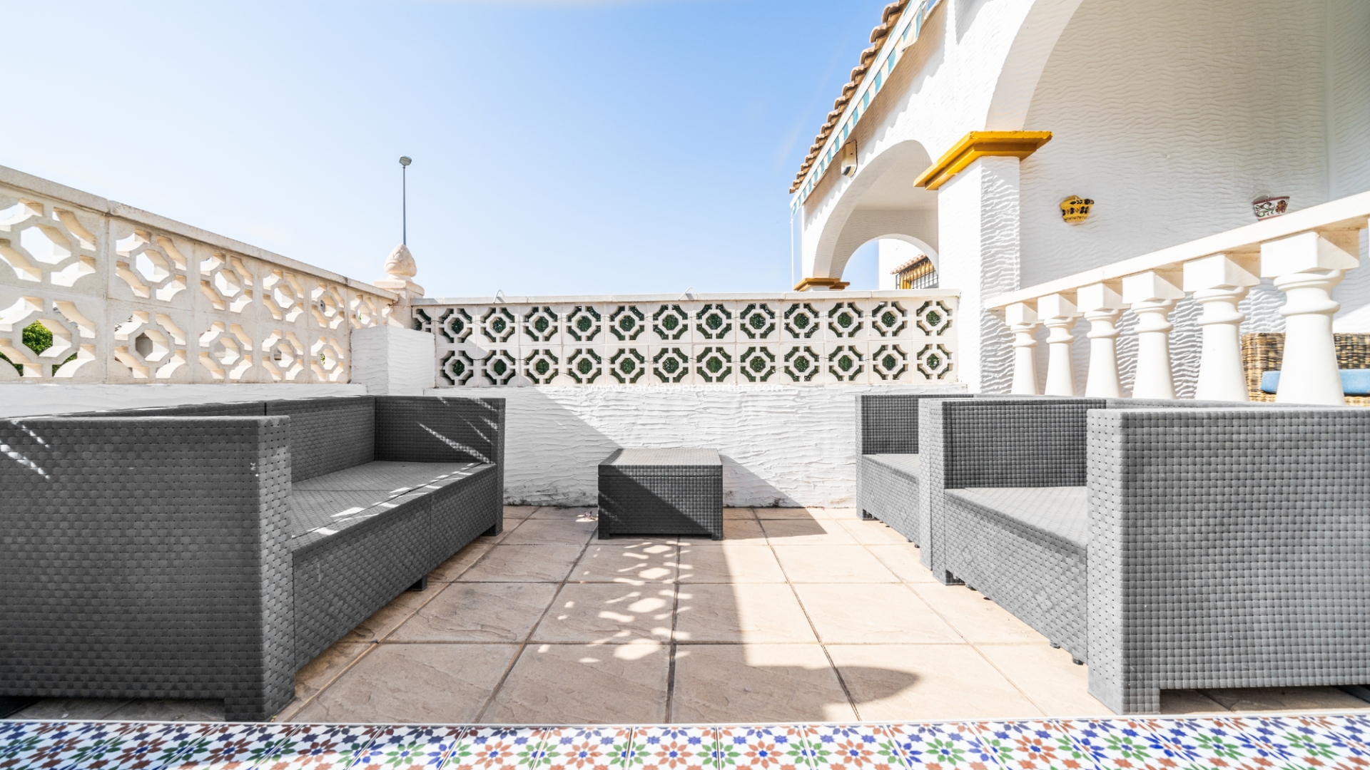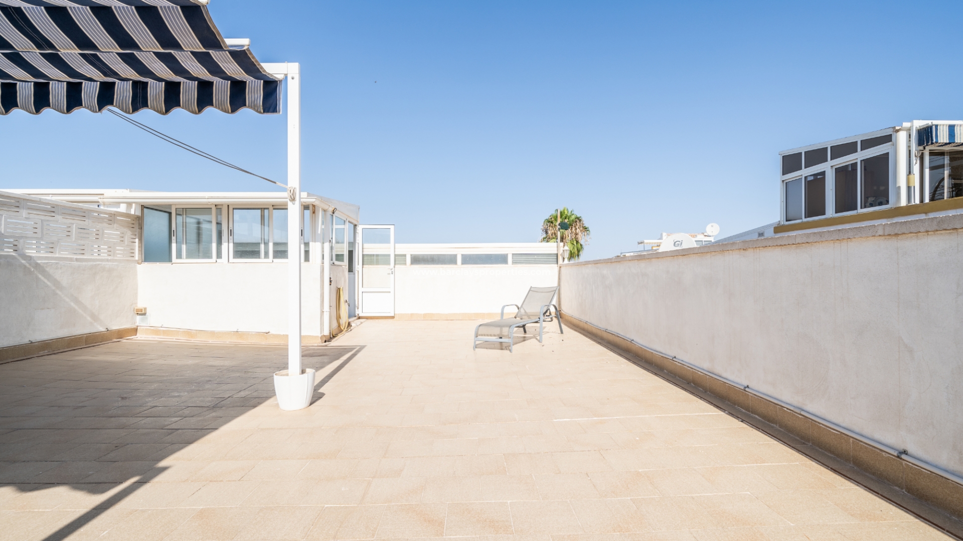 De eigentijdse gerenoveerde badkamer is functioneel en stijlvol, met een inloopdouche, toilet en extra douche. De goed uitgeruste onafhankelijke elektrische keuken is toegankelijk vanuit de woonkamer en heeft een deur die leidt naar een bijkeuken/interieurpatio. Vanaf hier leidt een trap naar het ruime solarium.