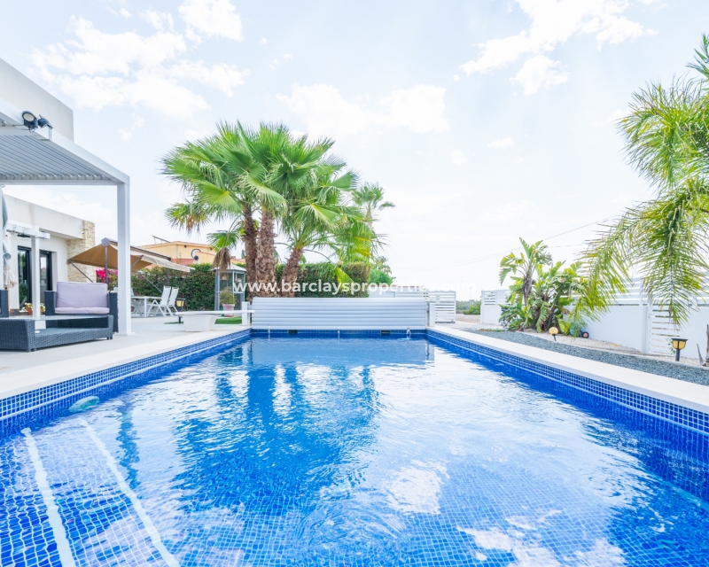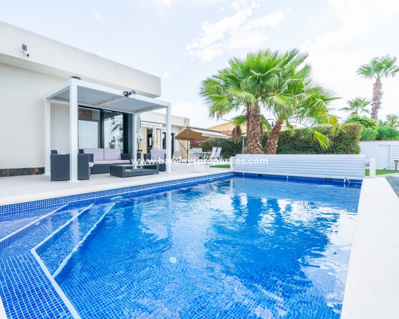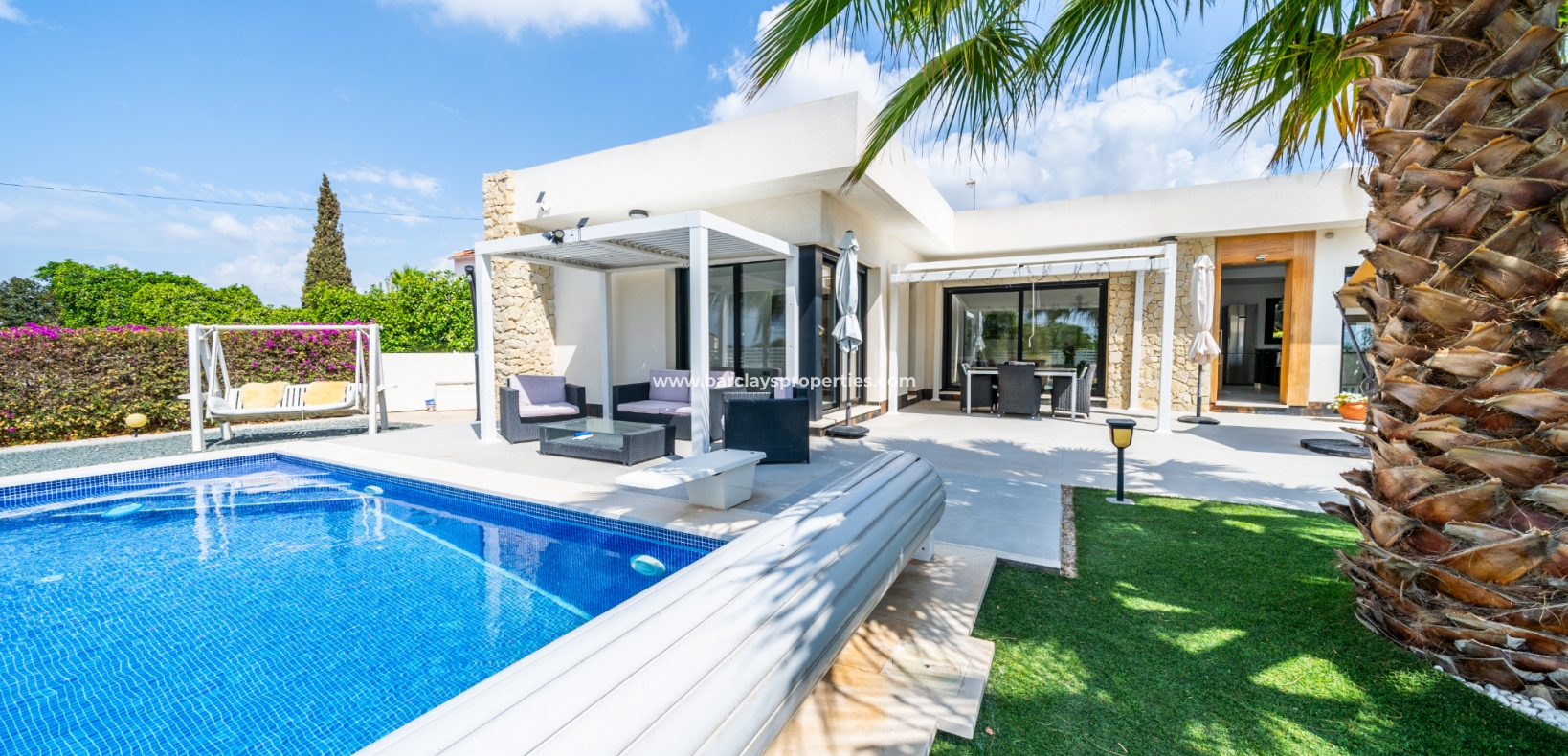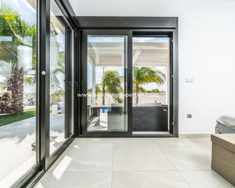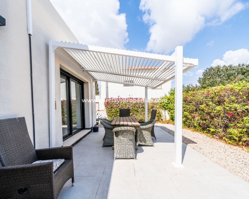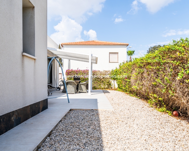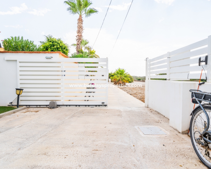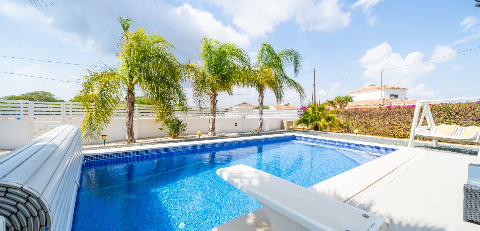 Met trots presenteren wij deze stijlvolle, verbluffende vrijstaande villa die het gemak biedt van wonen op één niveau, met drie ruime tweepersoonsslaapkamers en twee badkamers, gelegen in Urbanisatie La Escuera in een rustige omgeving nabij andere vrijstaande woningen, naast urbanisatie La Marina waar een breed scala aan voorzieningen te vinden is, op slechts een paar minuten rijden. Voor strandliefhebbers ➡️ een autorit van 5 minuten brengt u naar de gouden, met de blauwe vlag bekroonde stranden van “Playas de La Marina”.