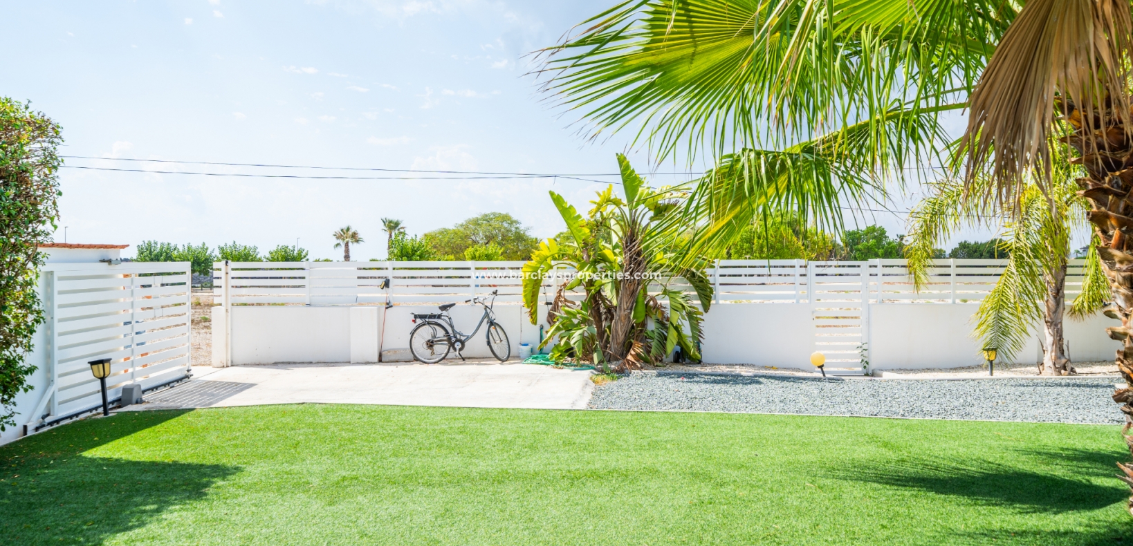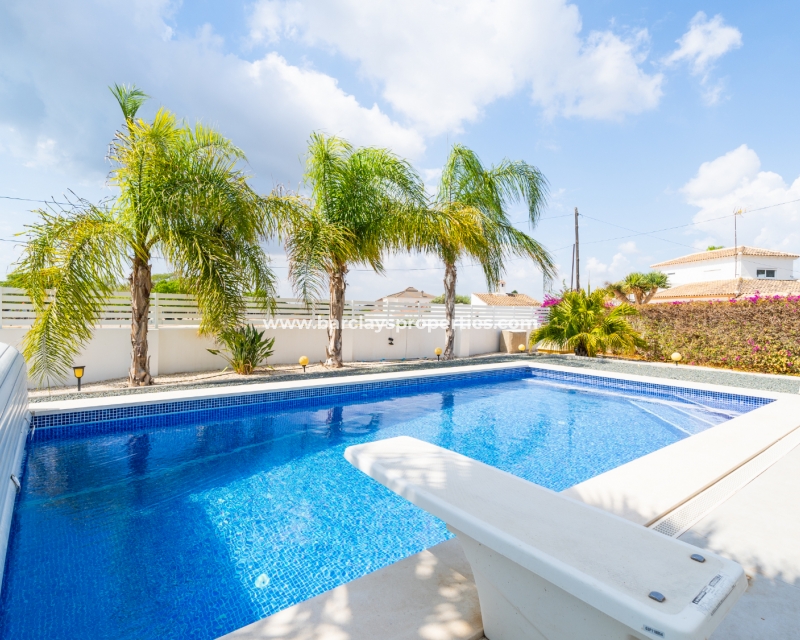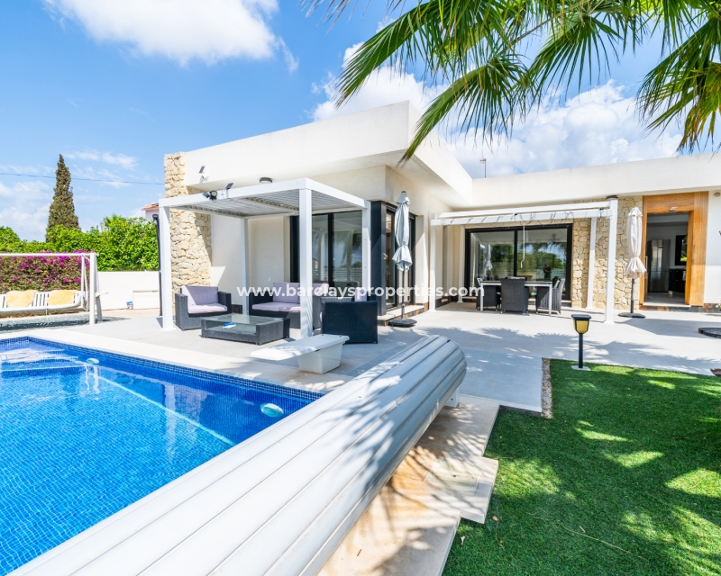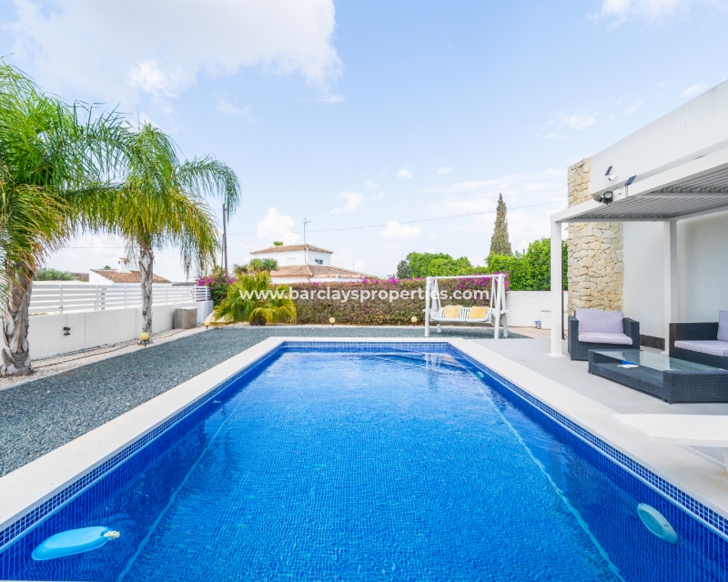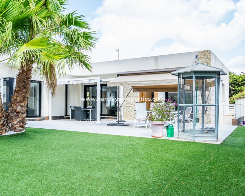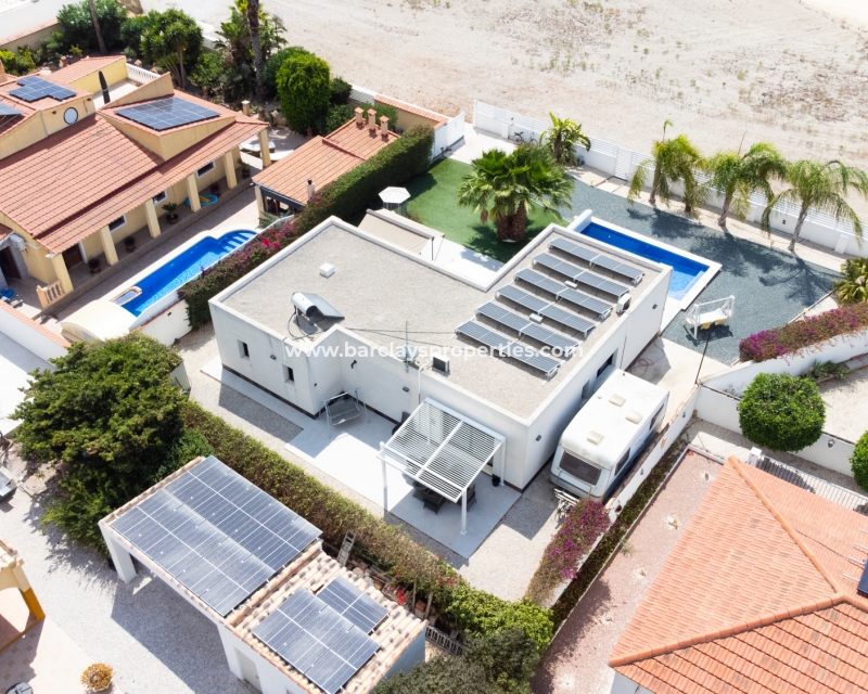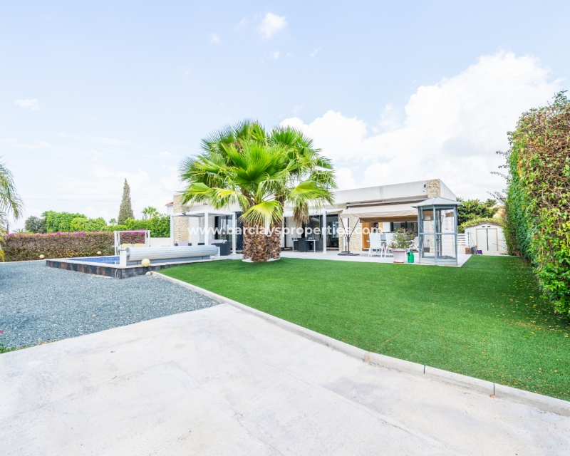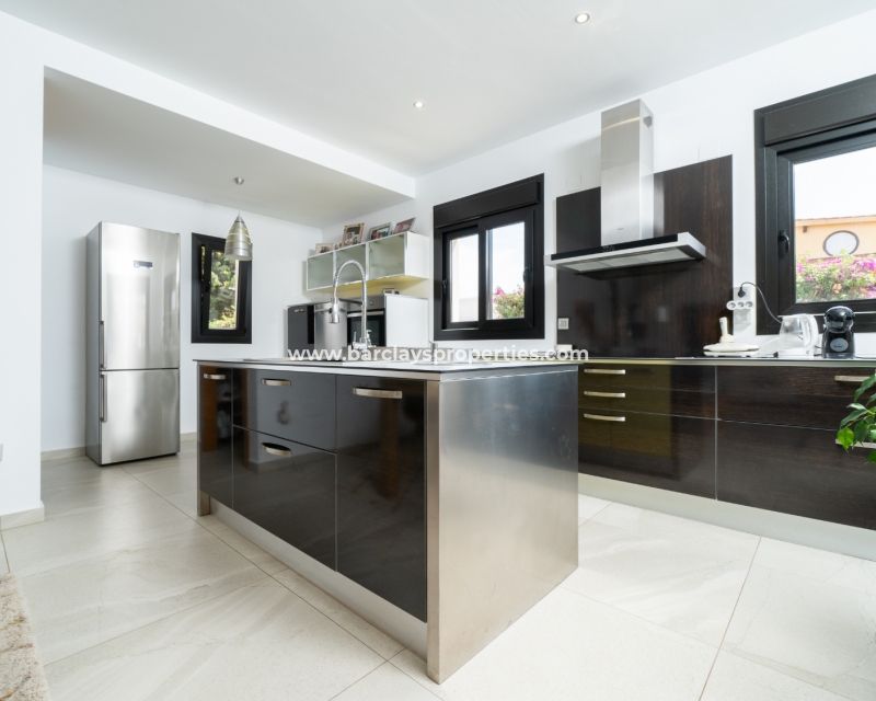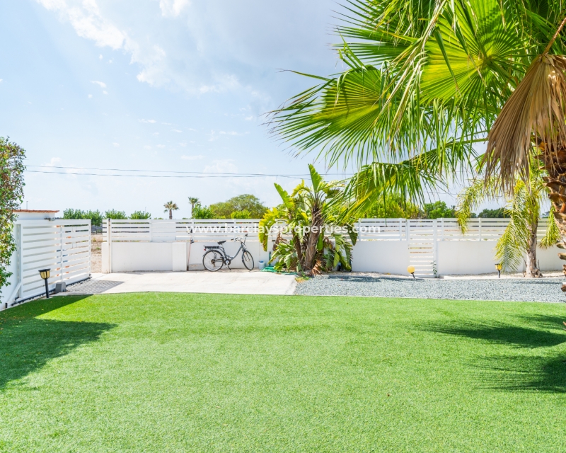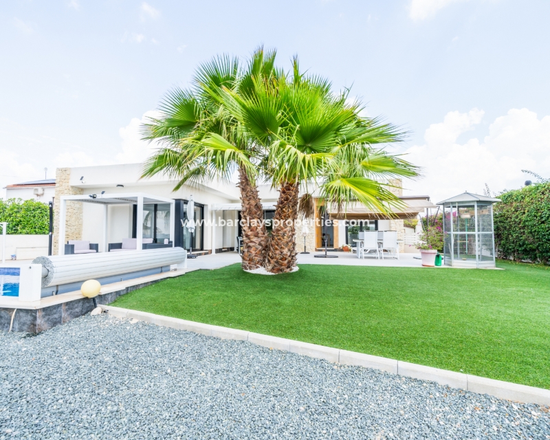 Met trots presenteren wij deze stijlvolle, verbluffende vrijstaande villa die het gemak biedt van wonen op één niveau, met drie ruime tweepersoonsslaapkamers en twee badkamers, gelegen in Urbanisatie La Escuera in een rustige omgeving nabij andere vrijstaande woningen, naast urbanisatie La Marina waar een breed scala aan voorzieningen te vinden is, op slechts een paar minuten rijden. Voor strandliefhebbers ➡️ een autorit van 5 minuten brengt u naar de gouden, met de blauwe vlag bekroonde stranden van “Playas de La Marina”.