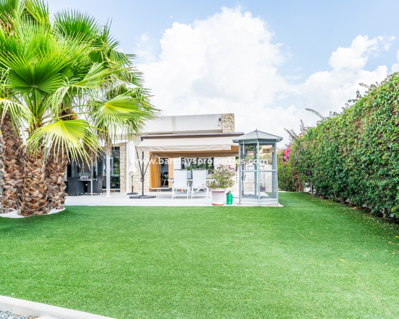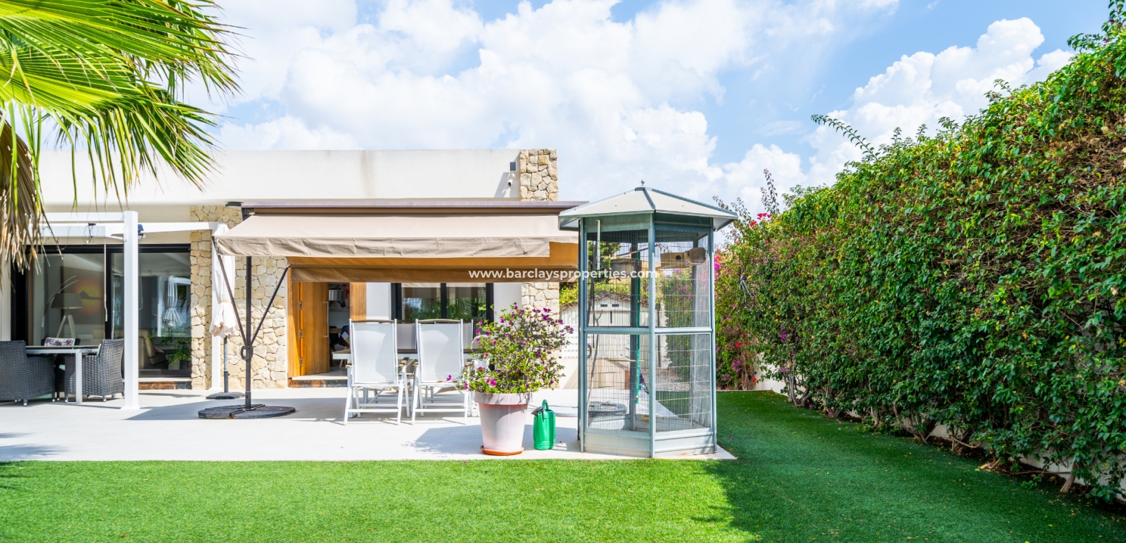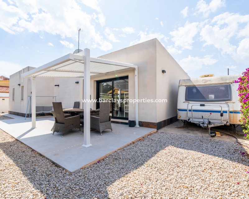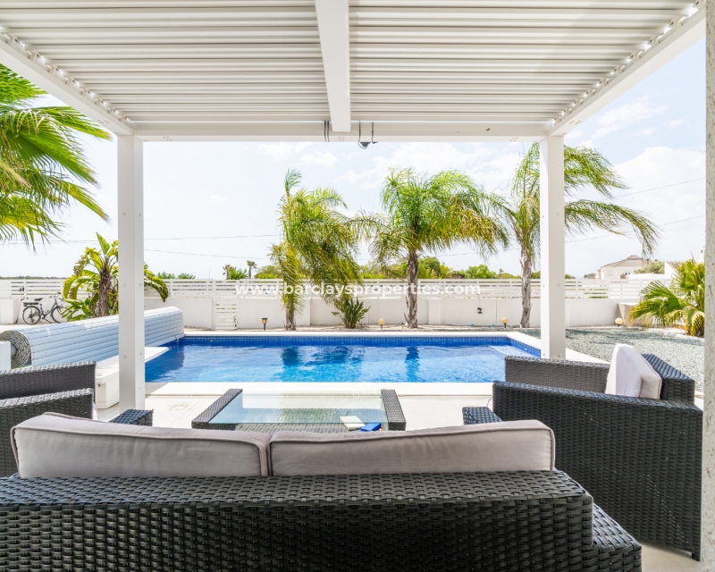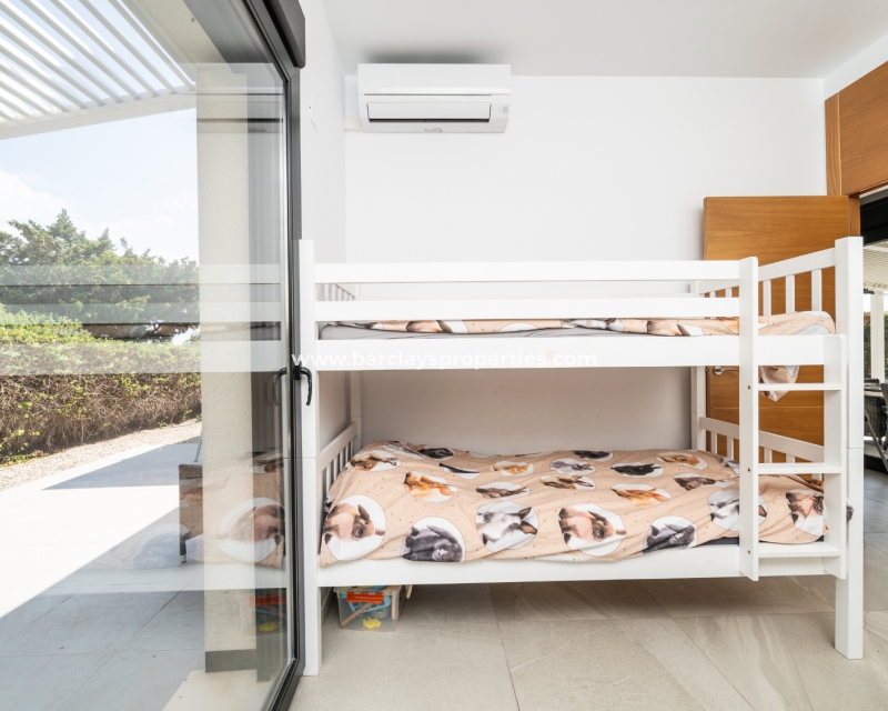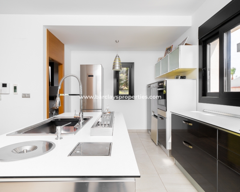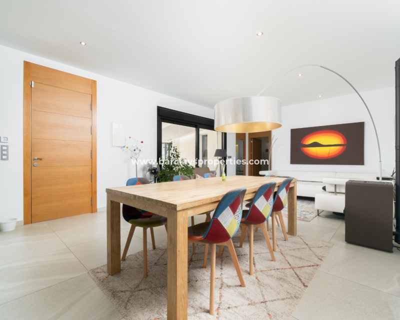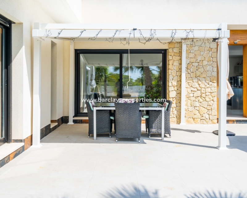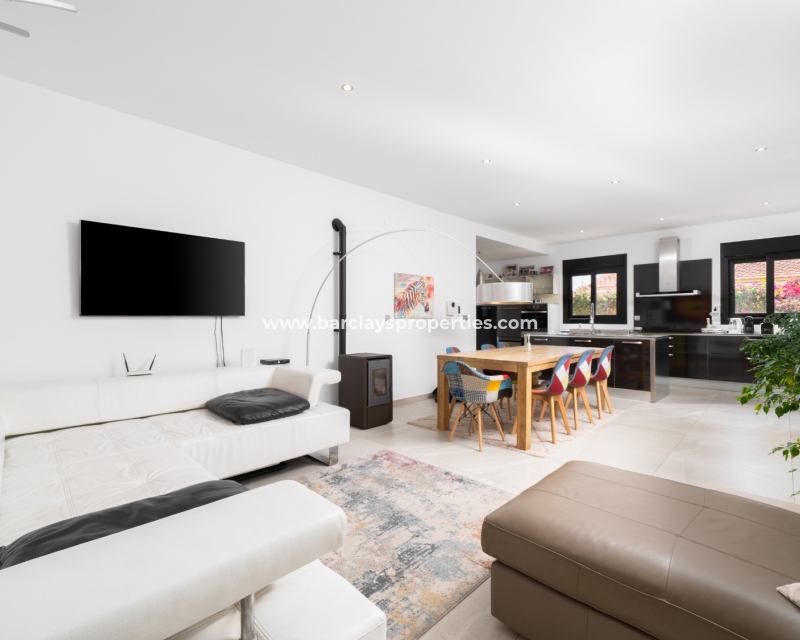 Met trots presenteren wij deze stijlvolle, verbluffende vrijstaande villa die het gemak biedt van wonen op één niveau, met drie ruime tweepersoonsslaapkamers en twee badkamers, gelegen in Urbanisatie La Escuera in een rustige omgeving nabij andere vrijstaande woningen, naast urbanisatie La Marina waar een breed scala aan voorzieningen te vinden is, op slechts een paar minuten rijden. Voor strandliefhebbers ➡️ een autorit van 5 minuten brengt u naar de gouden, met de blauwe vlag bekroonde stranden van “Playas de La Marina”.