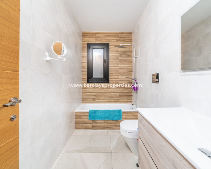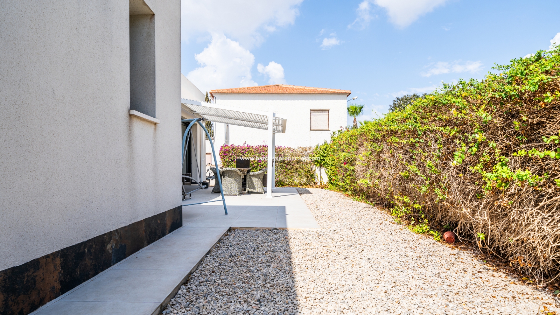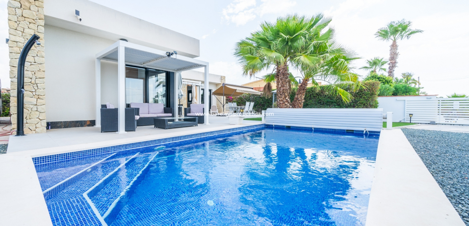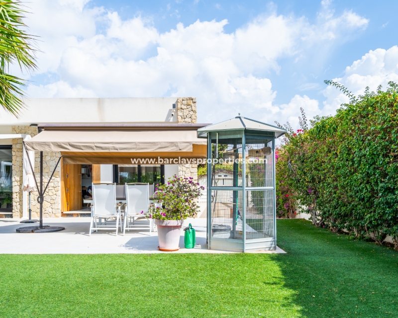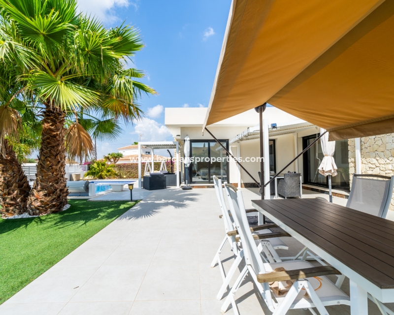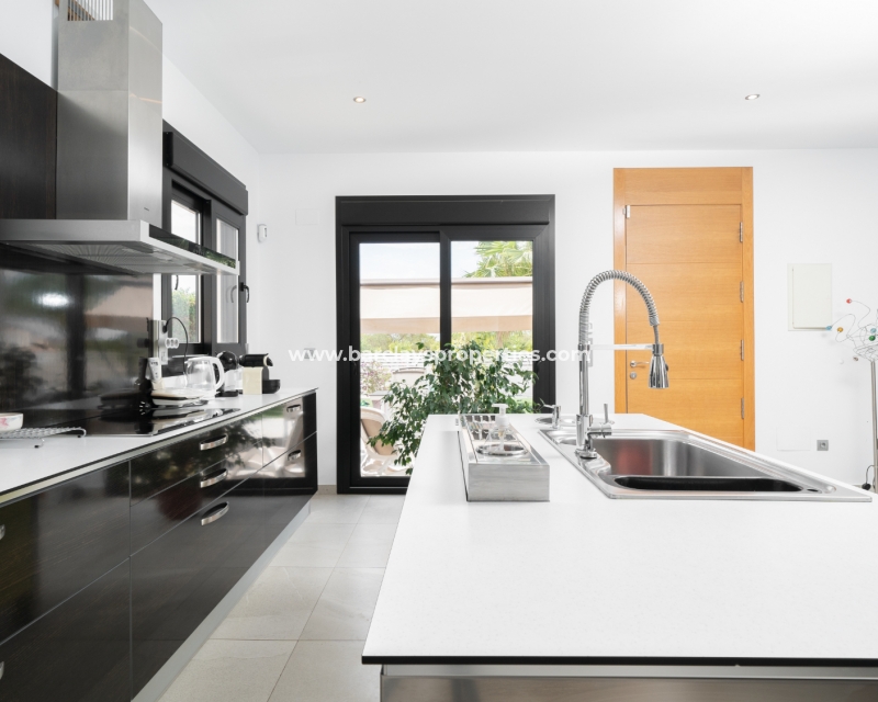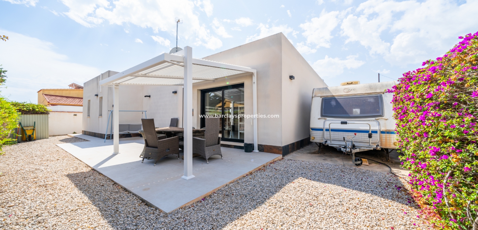 Met trots presenteren wij deze stijlvolle, verbluffende vrijstaande villa die het gemak biedt van wonen op één niveau, met drie ruime tweepersoonsslaapkamers en twee badkamers, gelegen in Urbanisatie La Escuera in een rustige omgeving nabij andere vrijstaande woningen, naast urbanisatie La Marina waar een breed scala aan voorzieningen te vinden is, op slechts een paar minuten rijden. Voor strandliefhebbers ➡️ een autorit van 5 minuten brengt u naar de gouden, met de blauwe vlag bekroonde stranden van “Playas de La Marina”.
