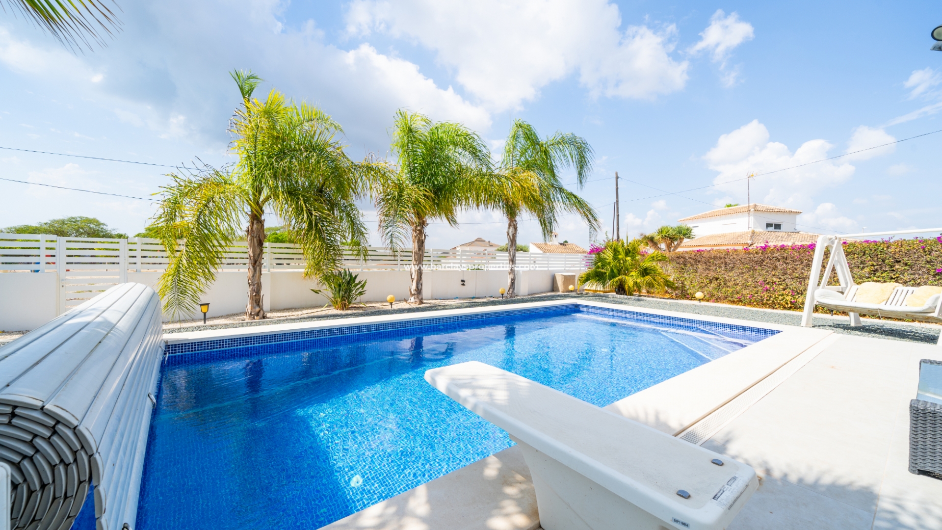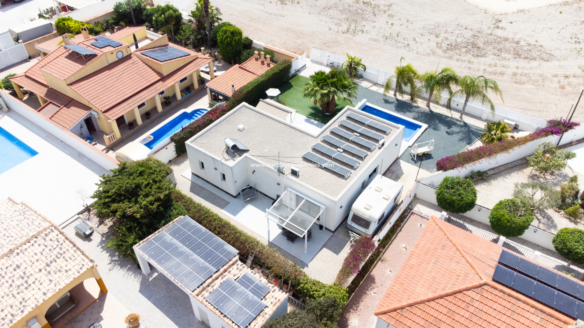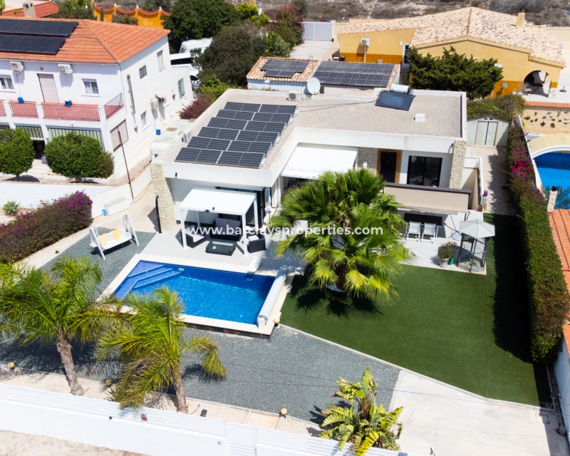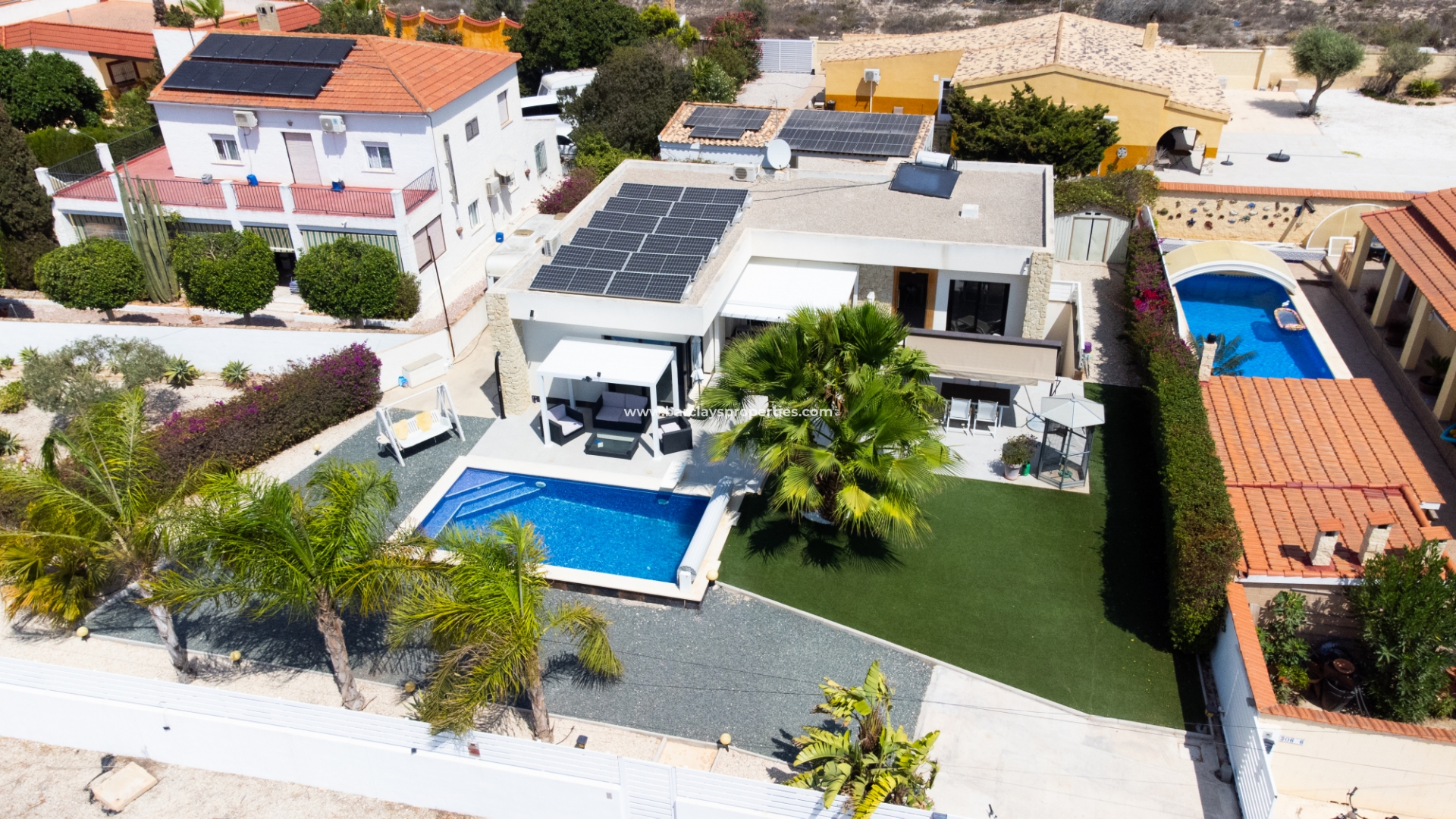 Het buitengebied is een privé-oase met schilderachtige kunstgrasgebieden en mooie palmbomen, met als kenmerk ➡️ een verwarmd zwembad en een zonovergoten, op het zuiden gelegen tuin met meerdere zitgedeeltes en een opslagruimte om al uw bezittingen veilig en droog te houden. Een elektrische poort beveiligt de oprit, wat zowel comfort als privacy biedt. De villa is doordacht uitgerust met een alarmsysteem, elektrische rolluiken en zonnepanelen om de veiligheid en energie-efficiëntie te verbeteren. Daarnaast biedt de onderbouw, die momenteel dienst doet als opslagruimte, de mogelijkheid om omgevormd te worden tot extra leefruimte.