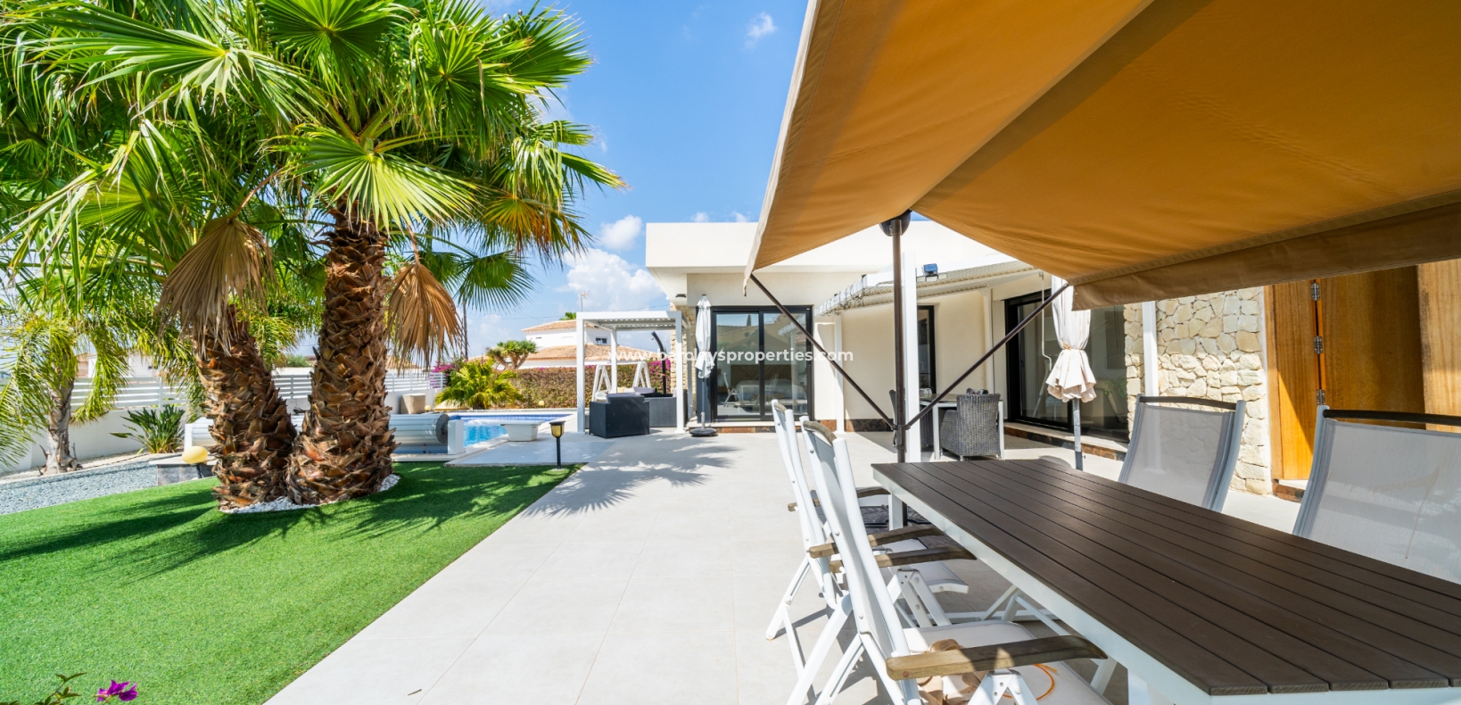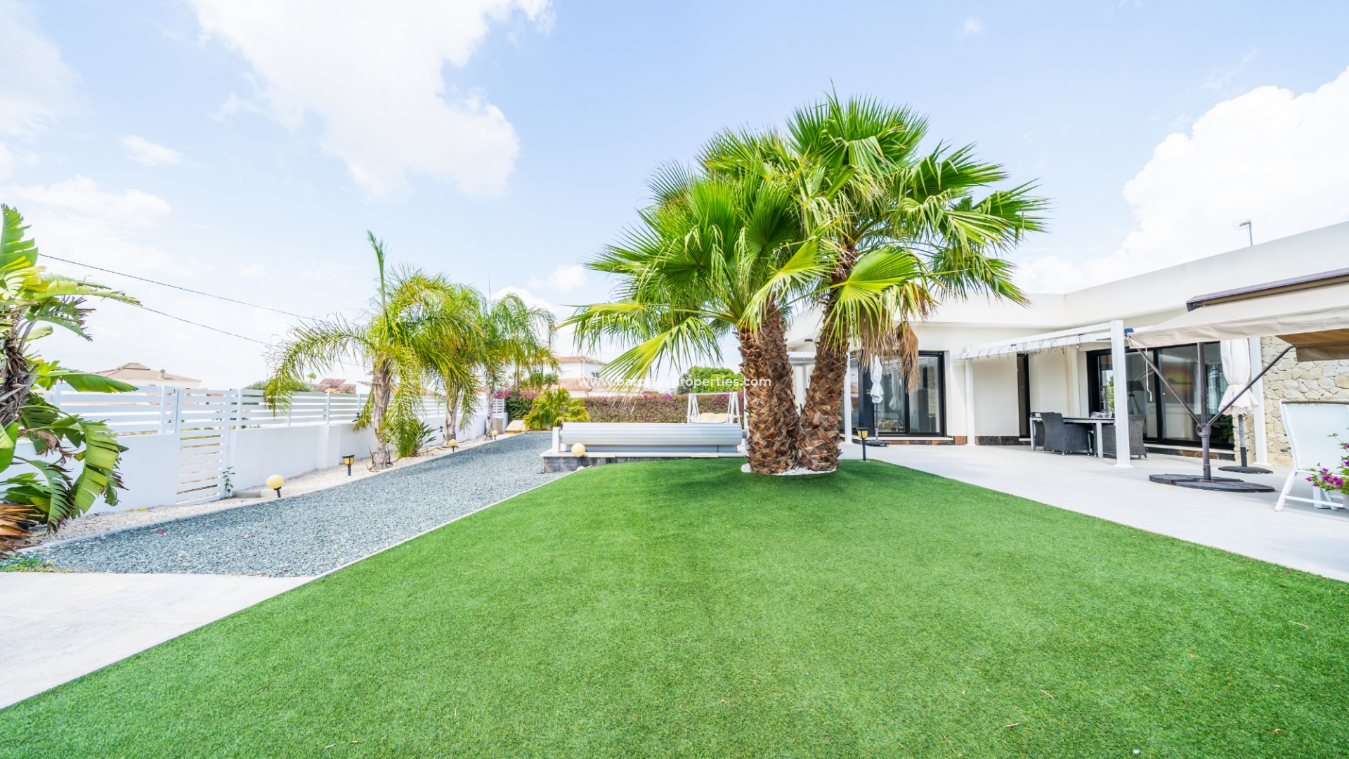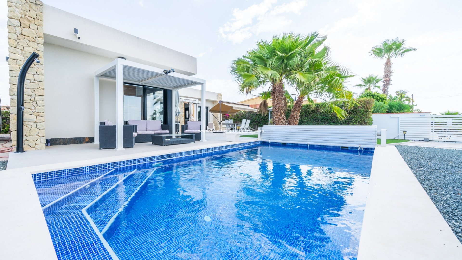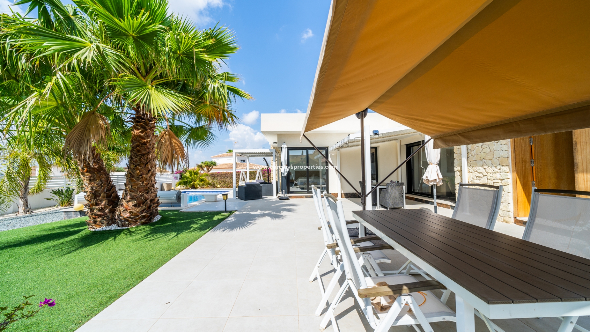 Het buitengebied is een privé-oase met schilderachtige kunstgrasgebieden en mooie palmbomen, met als kenmerk ➡️ een verwarmd zwembad en een zonovergoten, op het zuiden gelegen tuin met meerdere zitgedeeltes en een opslagruimte om al uw bezittingen veilig en droog te houden. Een elektrische poort beveiligt de oprit, wat zowel comfort als privacy biedt. De villa is doordacht uitgerust met een alarmsysteem, elektrische rolluiken en zonnepanelen om de veiligheid en energie-efficiëntie te verbeteren. Daarnaast biedt de onderbouw, die momenteel dienst doet als opslagruimte, de mogelijkheid om omgevormd te worden tot extra leefruimte.