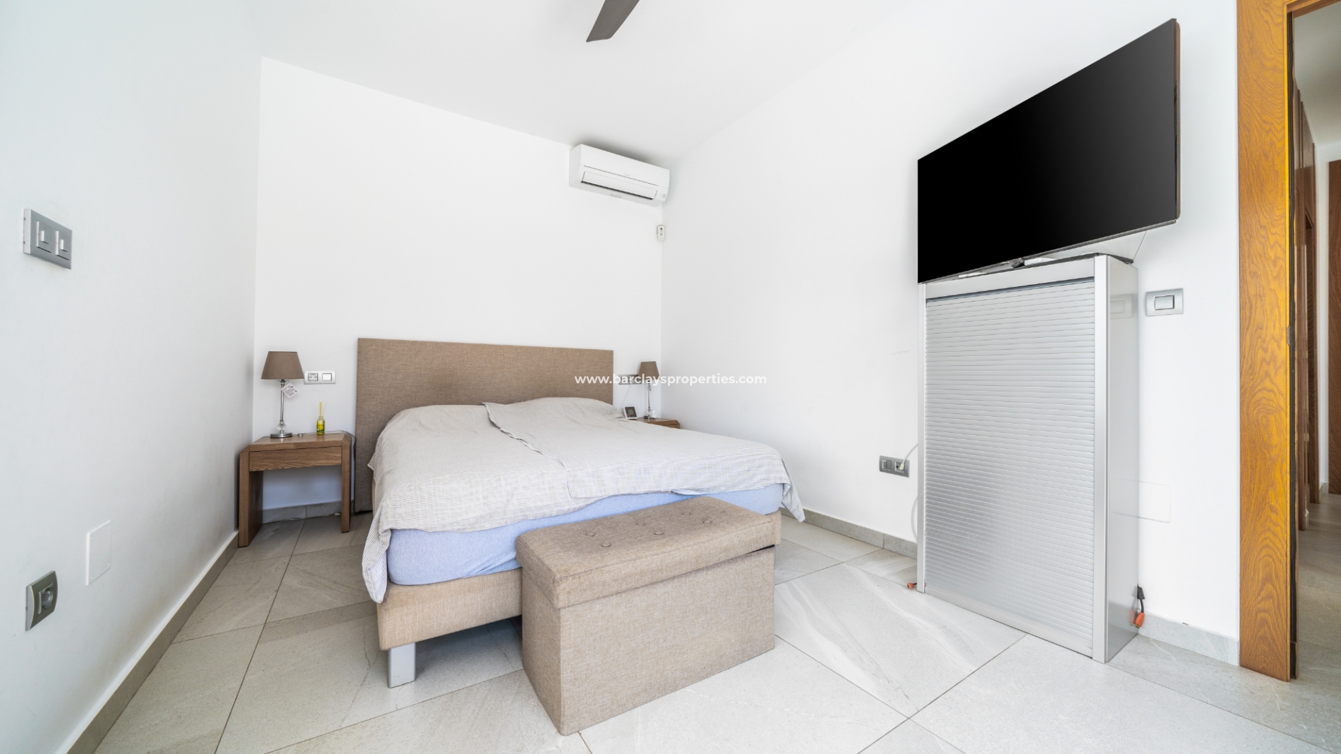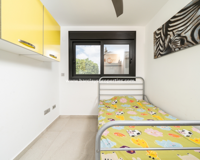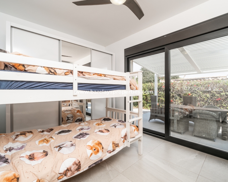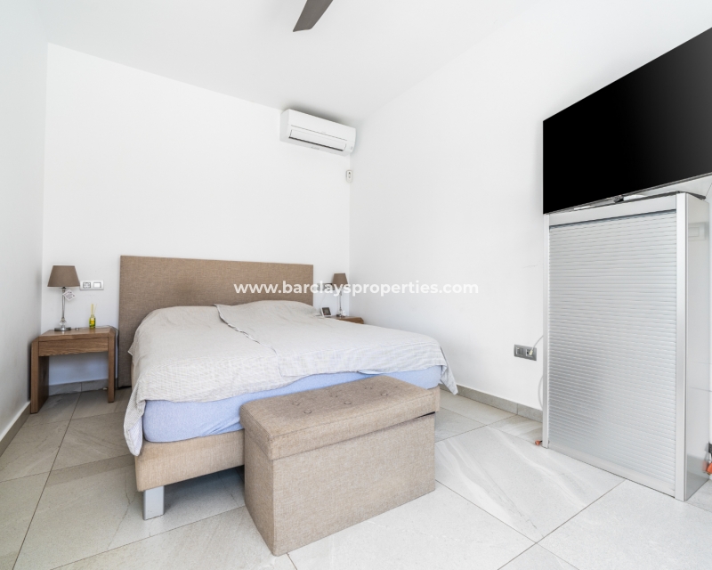 De hoofdslaapkamer en een van de andere slaapkamers zijn uitgerust met airconditioning en plafondventilatoren en beide hebben directe toegang tot de tuin voor een naadloze binnen-buiten ervaring. De derde slaapkamer is voorzien van een plafondventilator en blijft een ruime kamer. De badkamer is voorzien van moderne fittingen, waaronder een volwaardig bad, wc en wastafel/kaptafel met LED-spiegel.