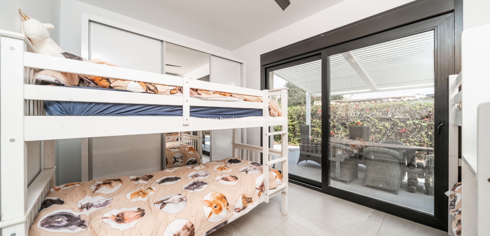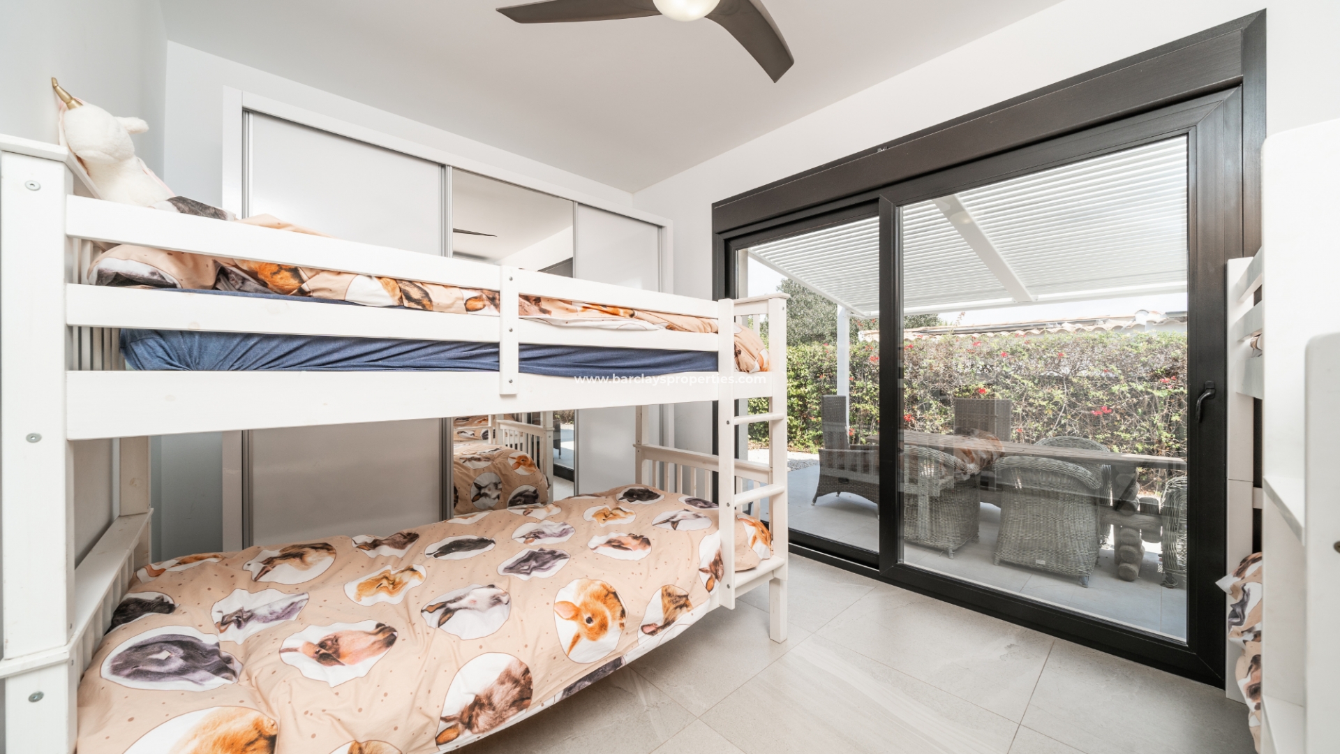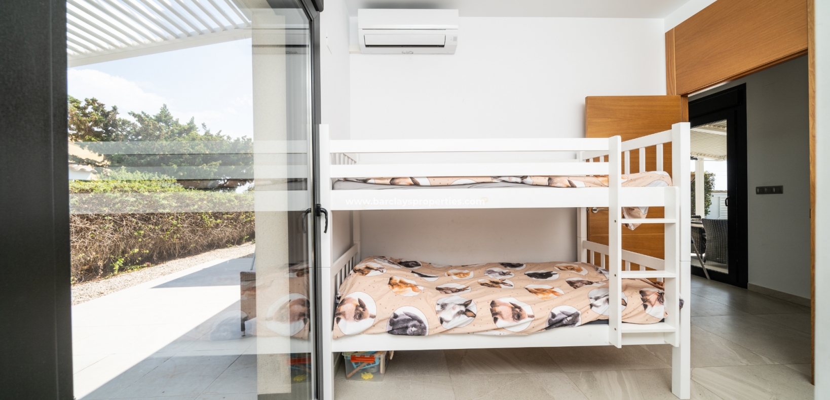 De hoofdslaapkamer en een van de andere slaapkamers zijn uitgerust met airconditioning en plafondventilatoren en beide hebben directe toegang tot de tuin voor een naadloze binnen-buiten ervaring. De derde slaapkamer is voorzien van een plafondventilator en blijft een ruime kamer. De badkamer is voorzien van moderne fittingen, waaronder een volwaardig bad, wc en wastafel/kaptafel met LED-spiegel.