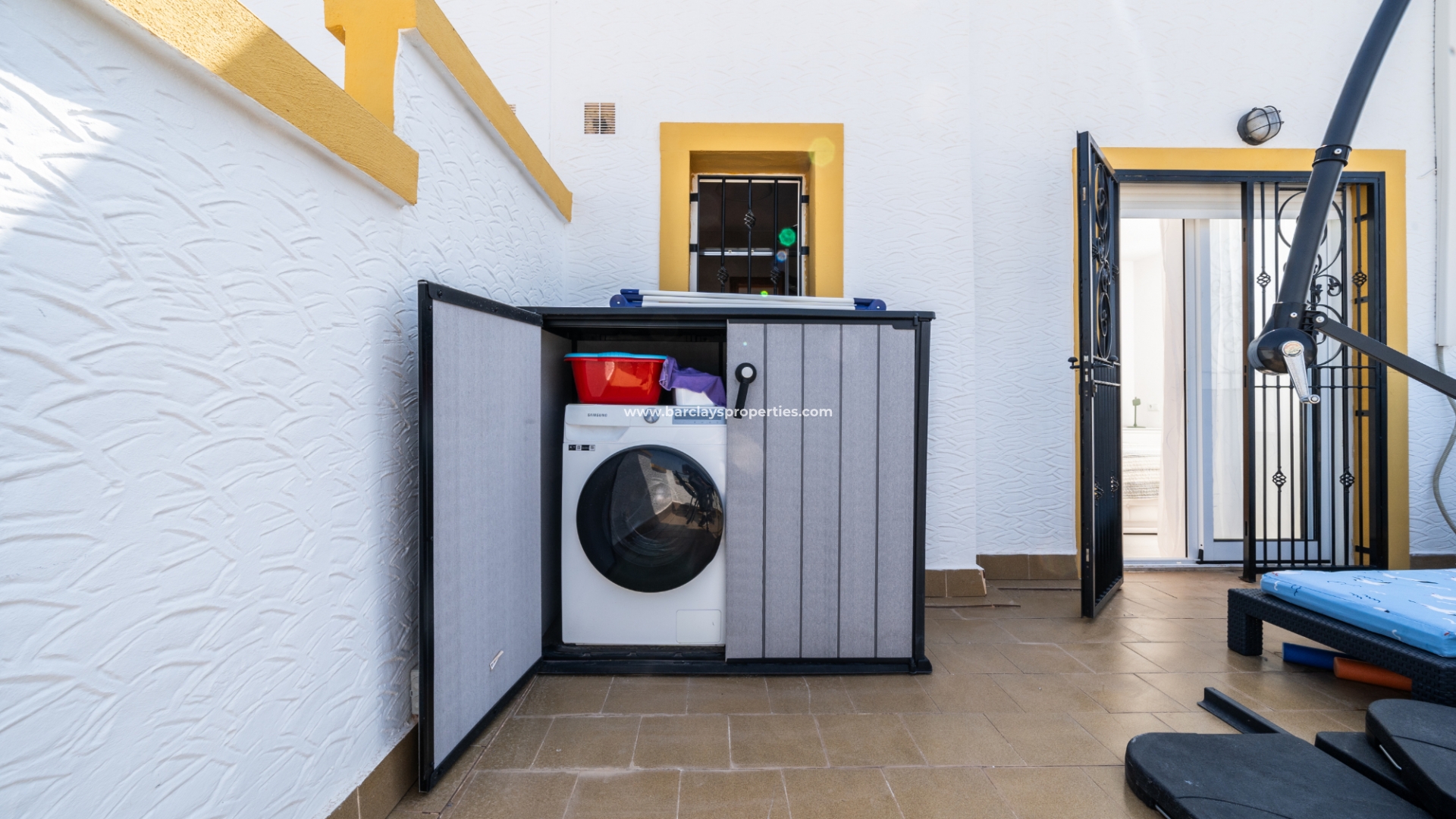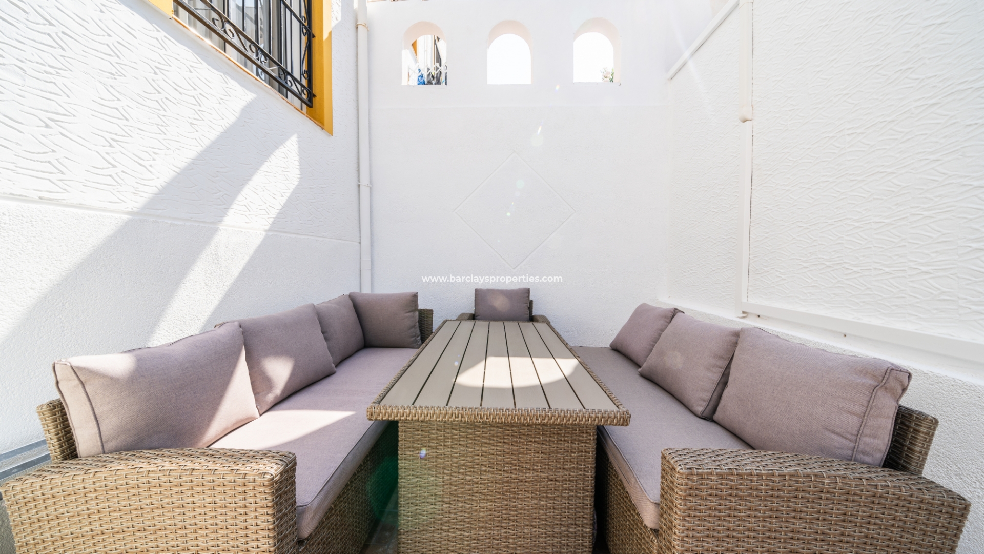 De woning beschikt over een ruime, betegelde en met grind bedekte tuin en een zitgedeelte aan de achterzijde, ideaal voor buitenmaaltijden of om te loungen. Een overdekte veranda aan de voorzijde leidt naar het interieur van de woning, dat is gemoderniseerd met nieuwe vloeren, en de woonkamer is voorzien van een slaapbank voor flexibele accommodatie.