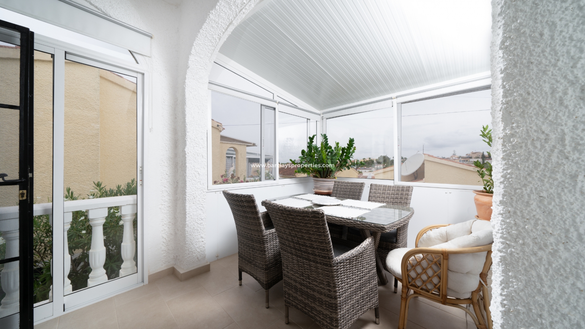 Een trap leidt naar een zonneterras met luifel perfect voor buitenrecreatie. Vanaf hier is een lichte, uitnodigende serre met eethoek toegankelijk via openslaande deuren die ons naar de binnenkant van het huis leiden. De woonkamer is opgewaardeerd met nieuwe ramen, terwijl de volledig gemoderniseerde keuken is voorzien van een nieuwe gaskookplaat, oven en afzuigkap, aangevuld met een glazen bijkeuken met directe toegang tot het zwembad.