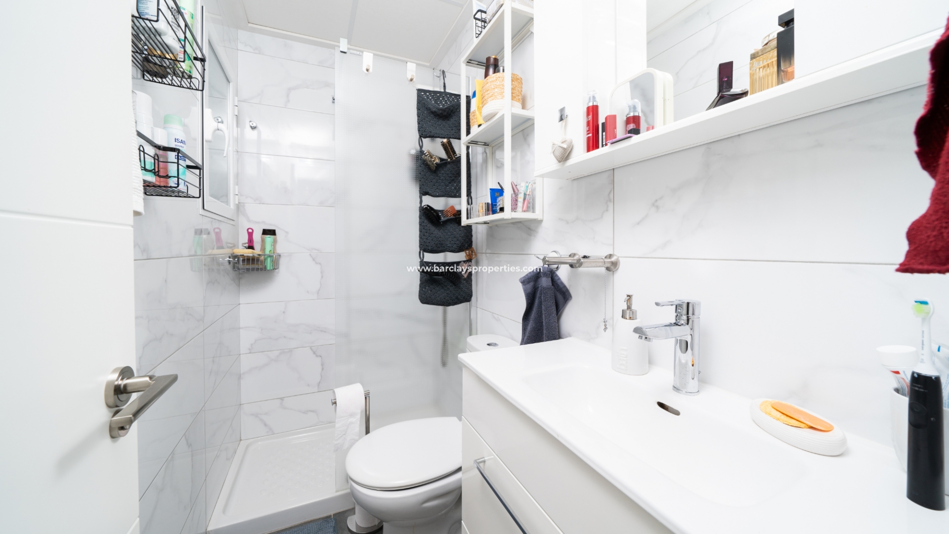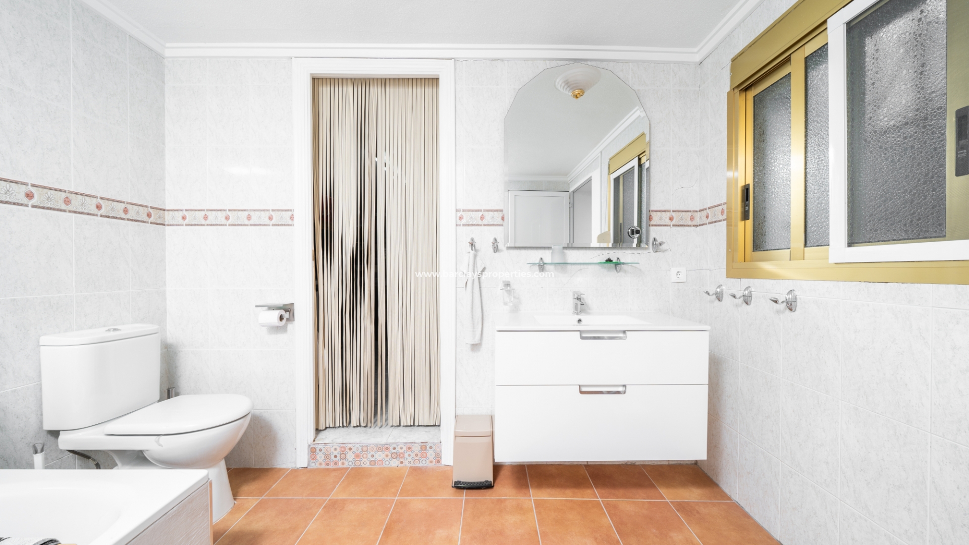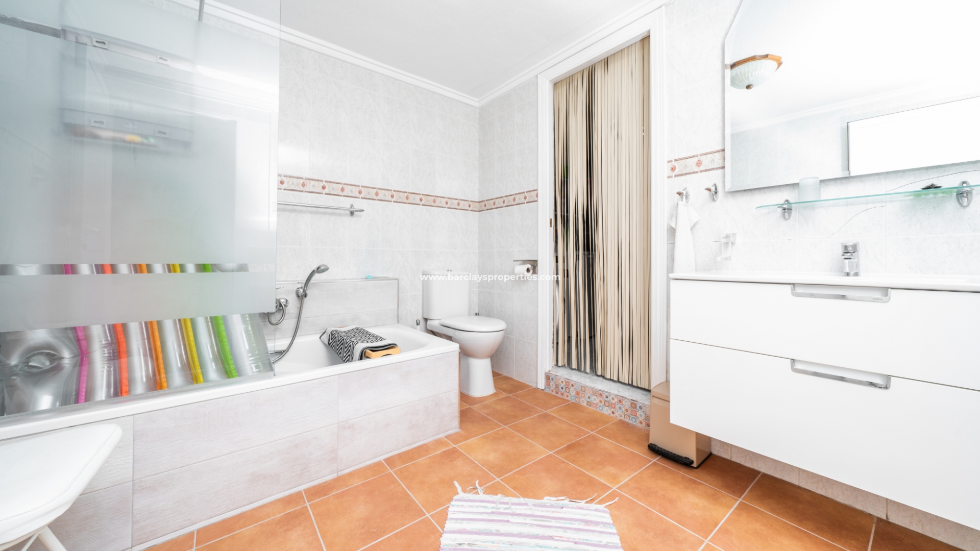Het huis heeft twee badkamers, een met een groot bad, een wastafel en een toilet (in de onderbouw) en een nieuw gerenoveerde badkamer met een douche van muur tot muur, een wastafel en een toilet.