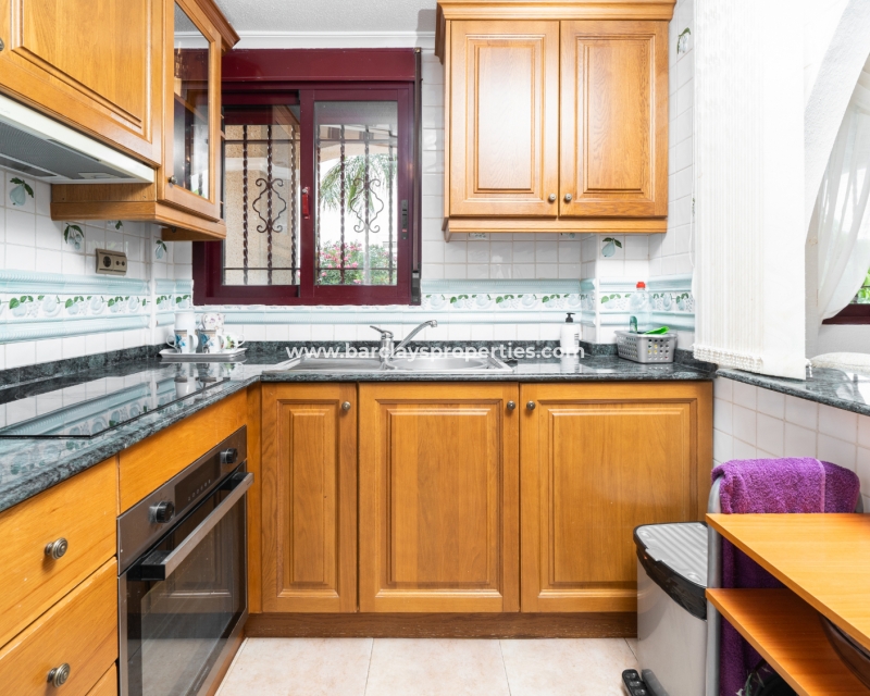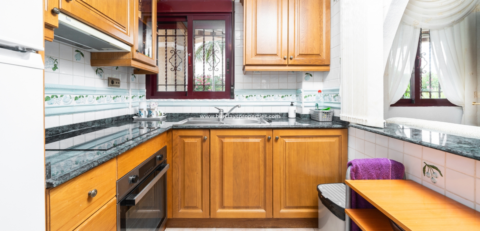 De halfopen keuken met boog is voorzien van eikenhouten kasten en moderne elektrische apparatuur, met toegang tot een handige bijkeuken en een extra deur die leidt naar het buitenzwembad.