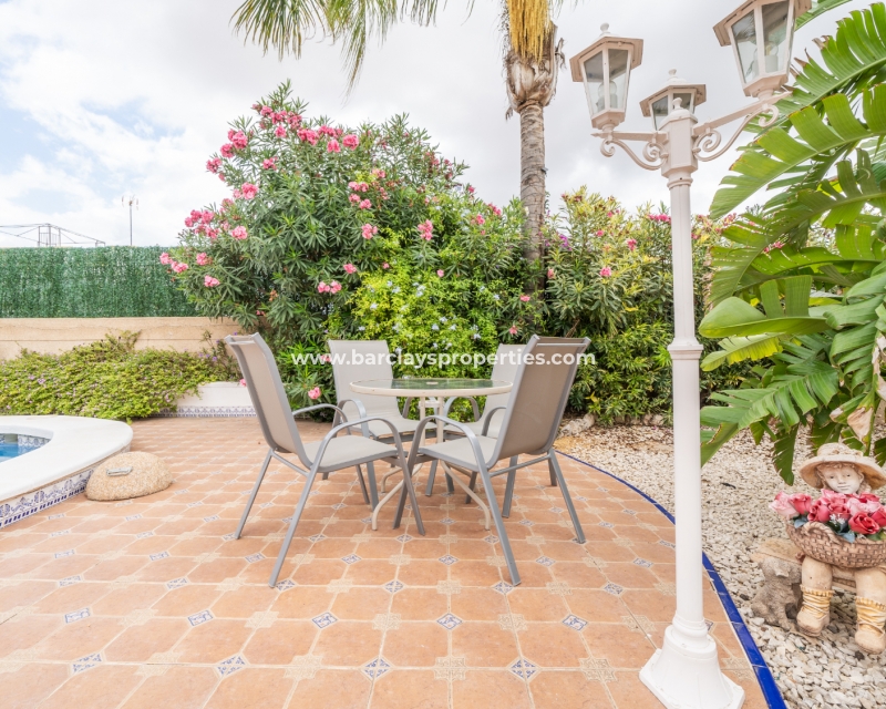 De woning, gelegen op een mooi betegeld en gegrind perceel van 528 m², beschikt over een ✅privé zwembad in niervorm met een buitendouche, omgeven door struiken, planten en bomen. Er is een charmante pergola-zithoek en een speciale barbecuezone, ideaal voor buitenentertainment. Het gebogen overdekte terras aan de voorzijde is voorzien van zonneschermen, die schaduw en comfort bieden tijdens warme middagen, met een prachtig uitzicht op de tuin en het zwembad.