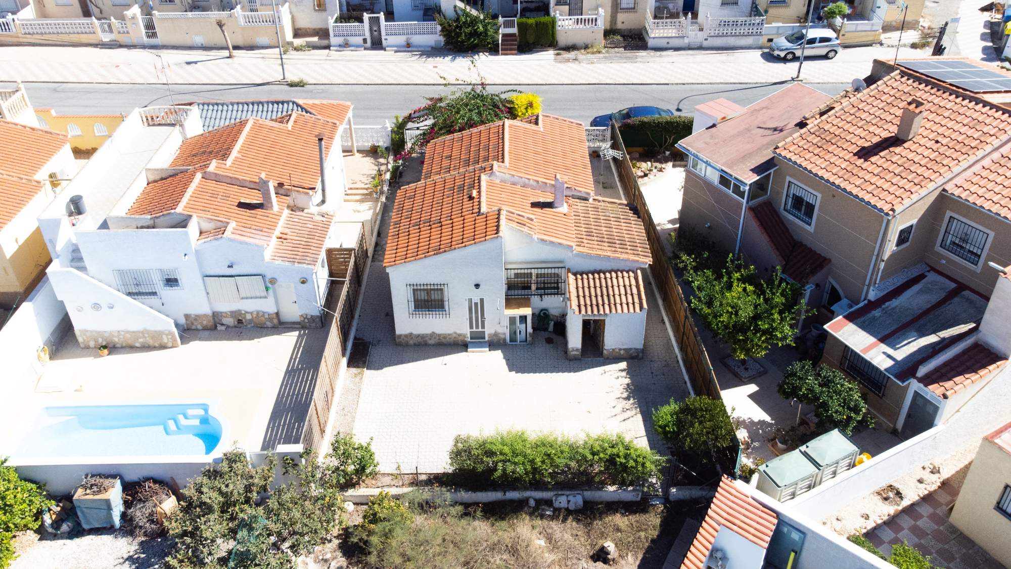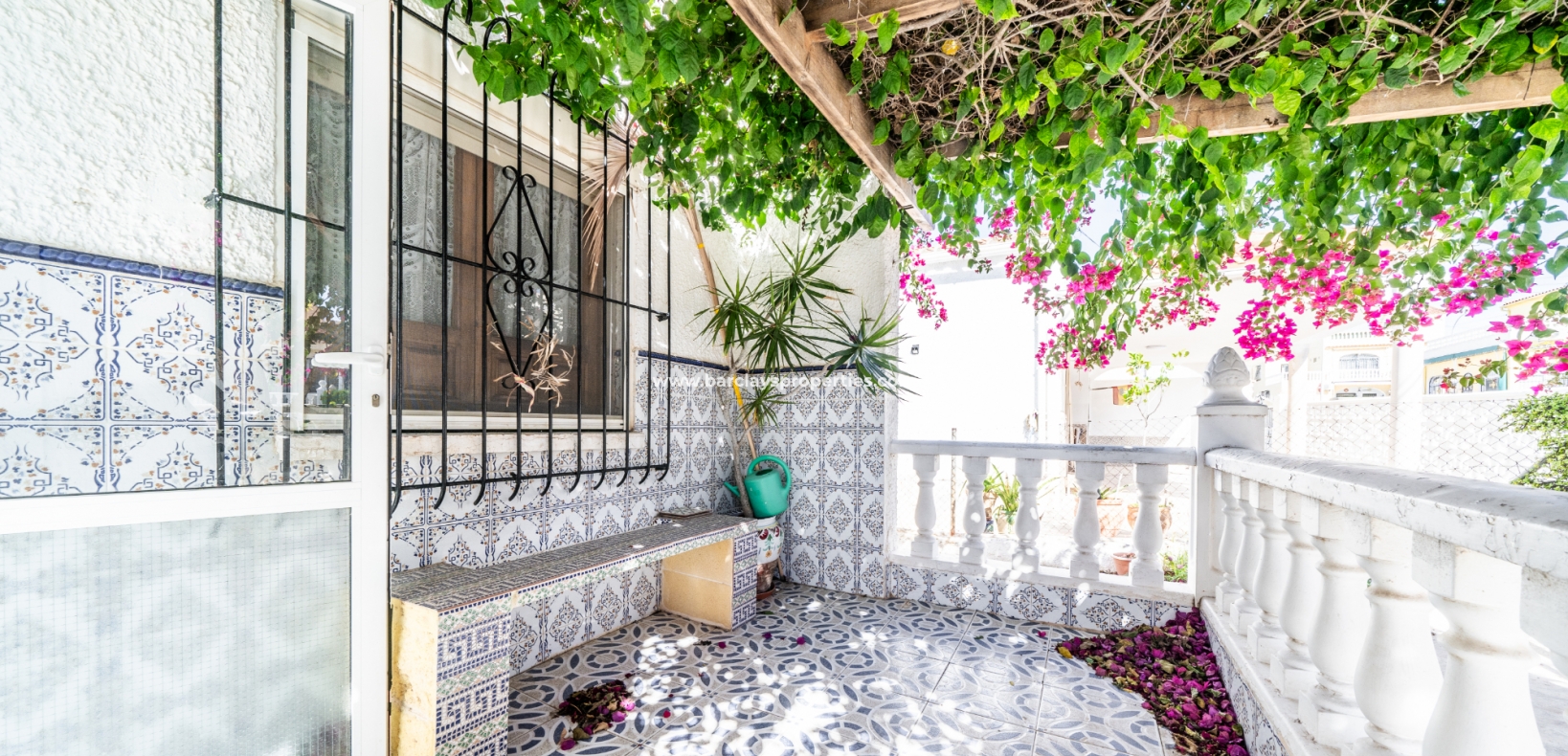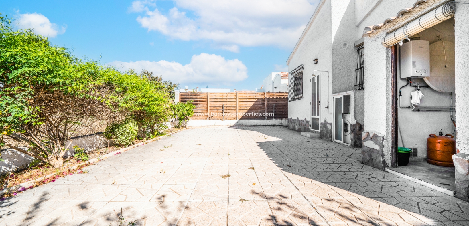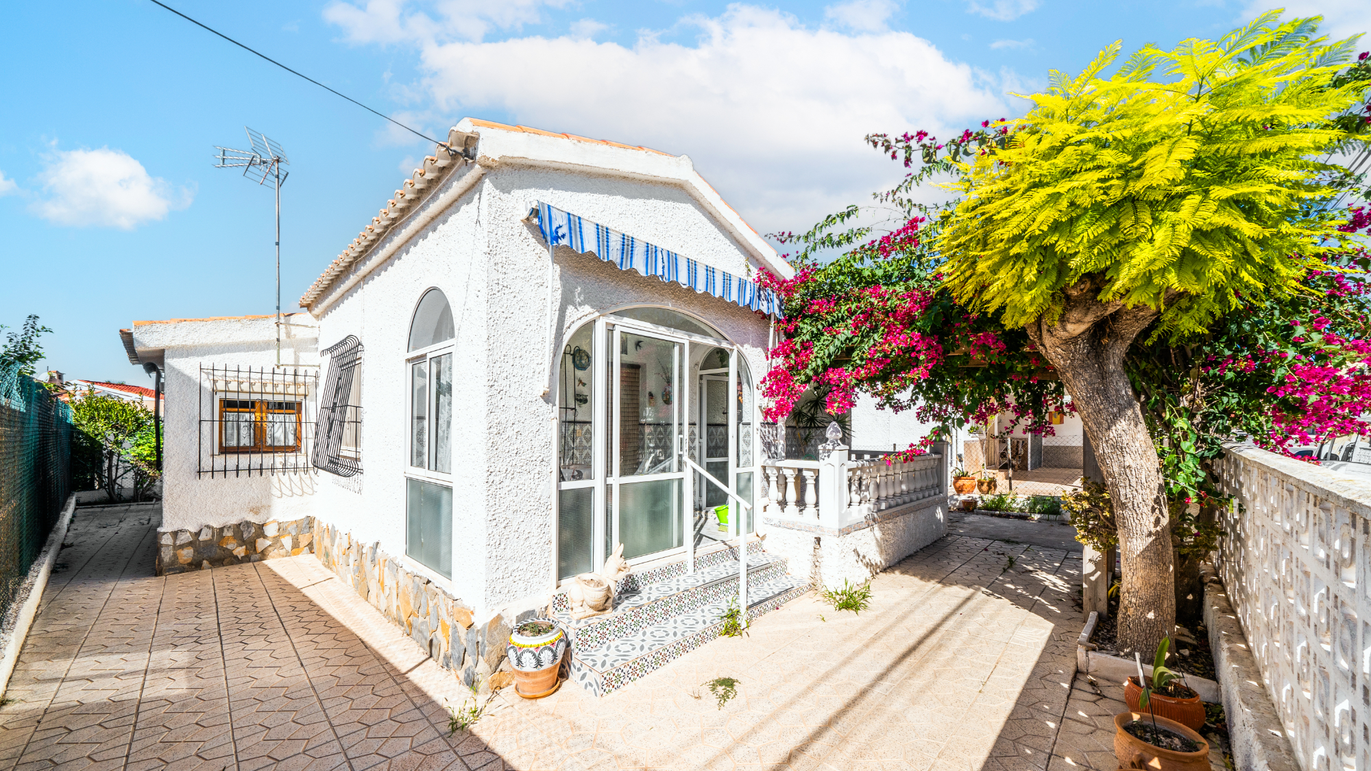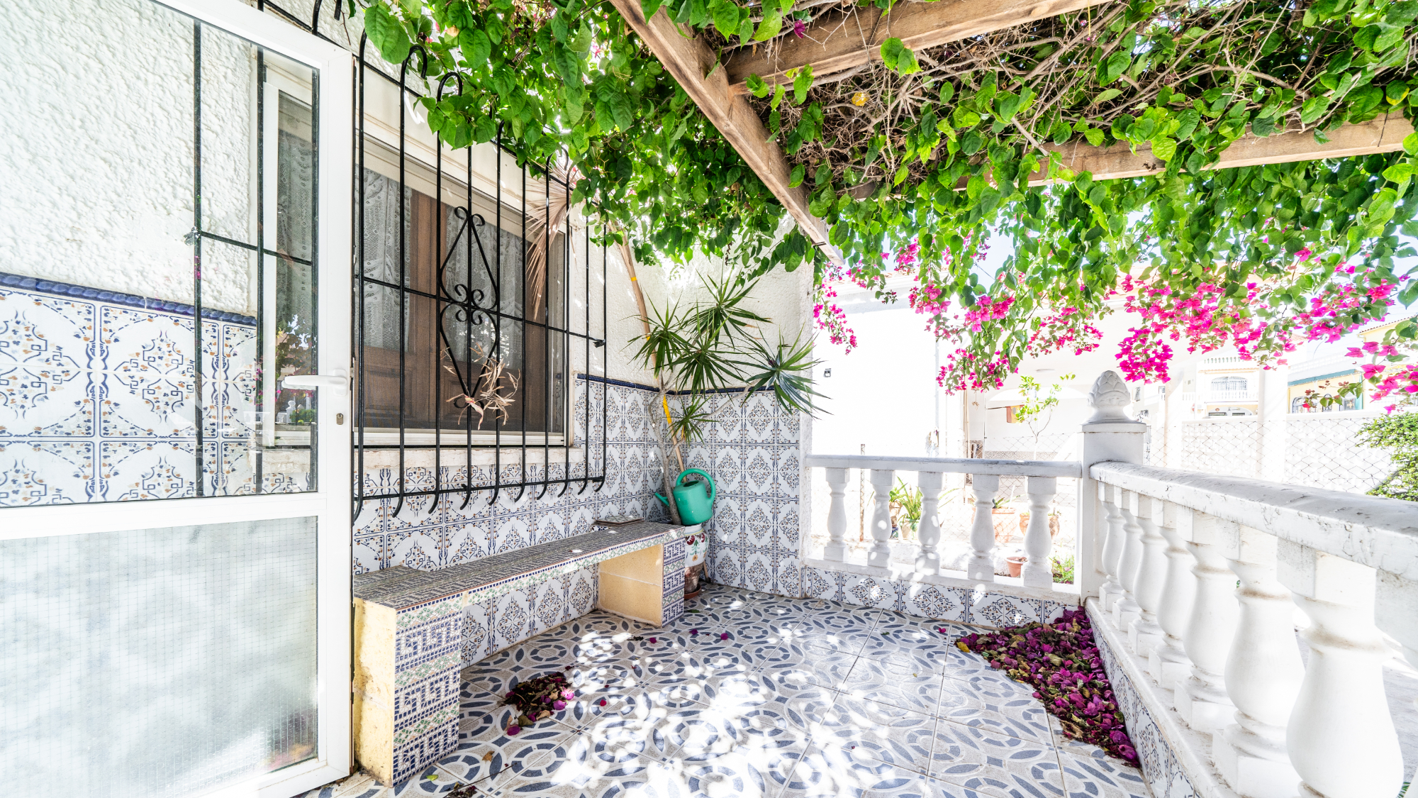 Gelegen op een volledig betegeld, vlak perceel biedt deze woning drie slaapkamers en één badkamer. De oostgerichte woning heeft een houten pergola met prachtige bougainvillea die een schaduwrijk gebied biedt en doorloopt naar het zonneterras, perfect voor ontspanning in de buitenlucht. Een parkeerplaats op eigen terrein en een buitenbergruimte zorgen voor extra functionaliteit.