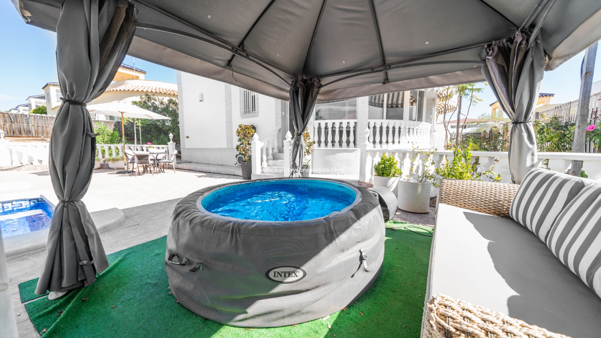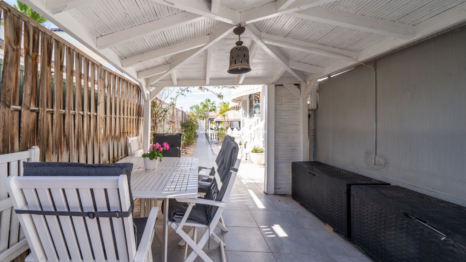 Het buitengedeelte, een ➡️ ruime tuin van 500m², is perfect om te entertainen, met een nieuwe houten pergola, barbecuegedeelte, een jacuzzi, een oprit met carport, een handige tuinschuur en ➡️ een 6 x 3 privézwembad met buitendouche en zonneterras. De woning beschikt over een ruim solarium dat toegankelijk is vanuit de bijkeuken, met nieuwe tegels, een eethoek met schaduw en een afgesloten zithoek/wintertuin met prachtig uitzicht op het platteland.