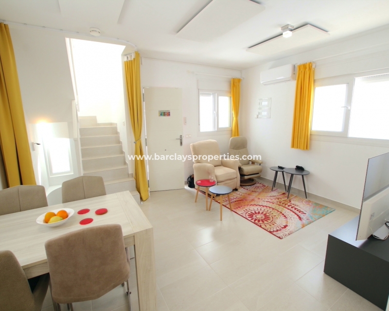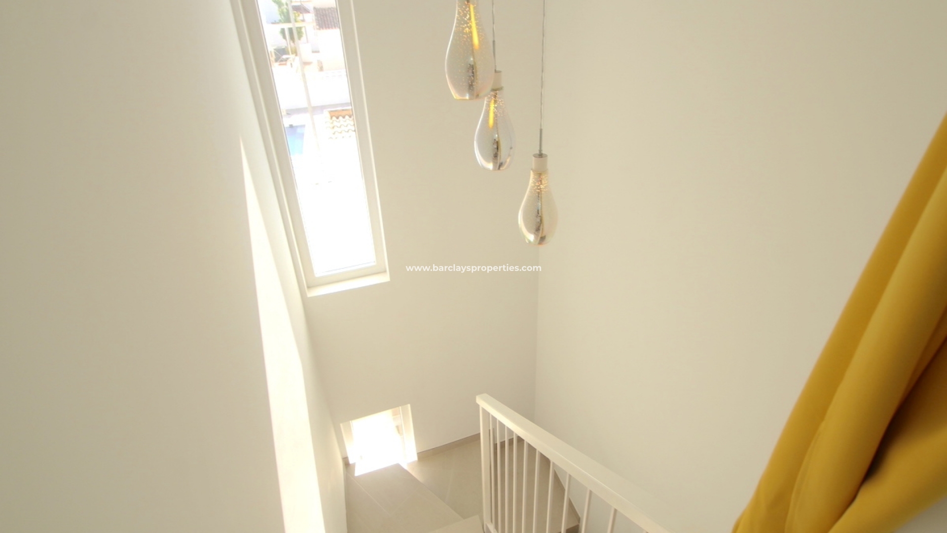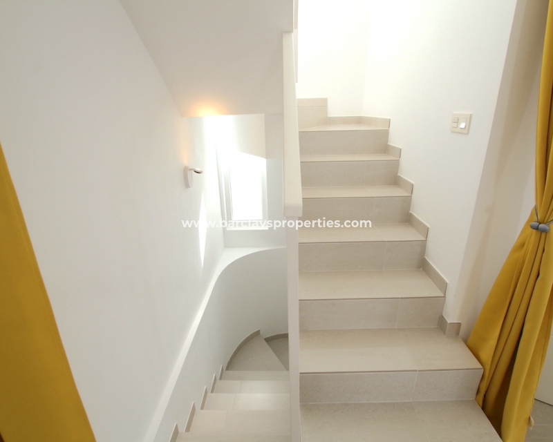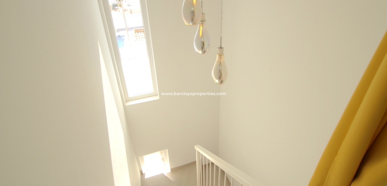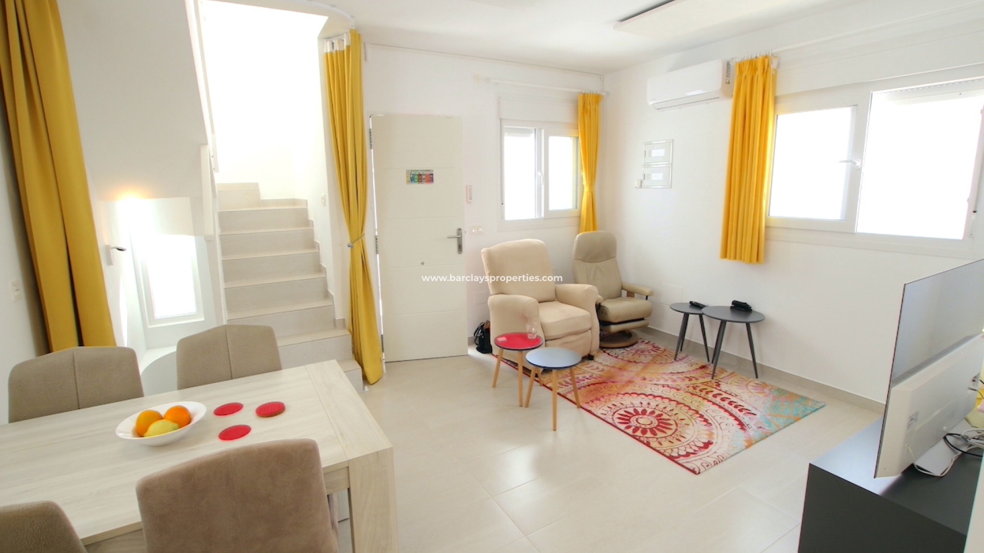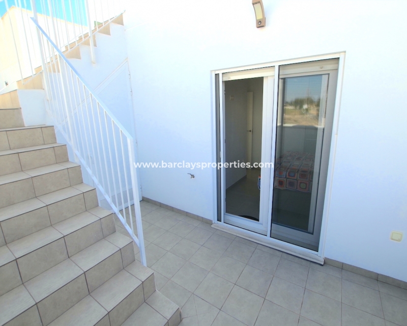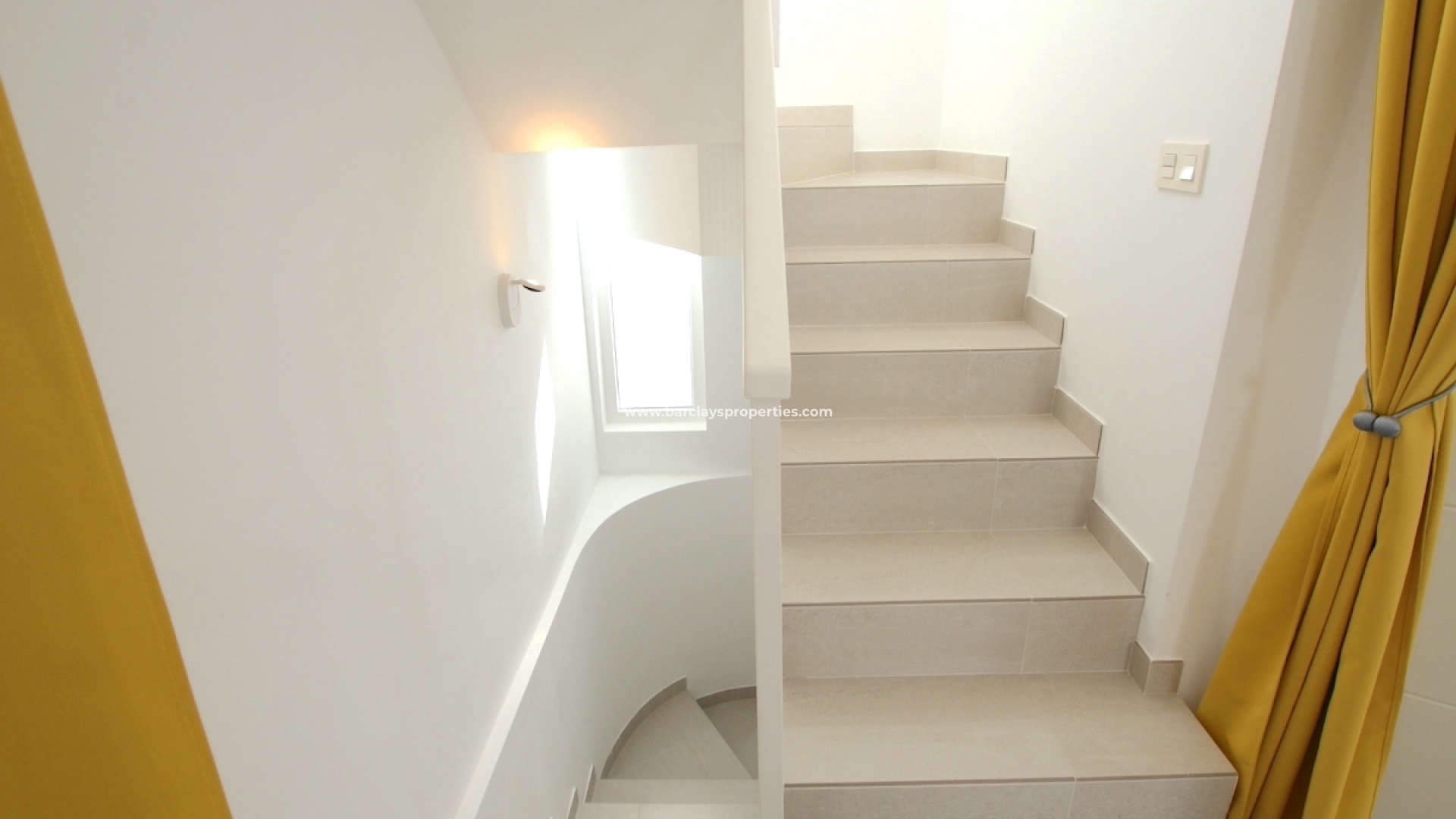 Binnen beslaat de villa drie verdiepingen, met een open indeling op de begane grond die een ruime woon- en eetkamer, een moderne keuken, een tweepersoons slaapkamer en een volledige badkamer omvat. Op de eerste verdieping bevinden zich nog twee tweepersoons slaapkamers, een extra badkamer, en een achterste slaapkamer met toegang tot een zonneterras en een wasruimte. Via de trap komt men op een groot solarium met uitzicht op het gemeenschappelijke zwembad en het omliggende platteland—de perfecte plek om te zonnebaden of in de avond te ontspannen.