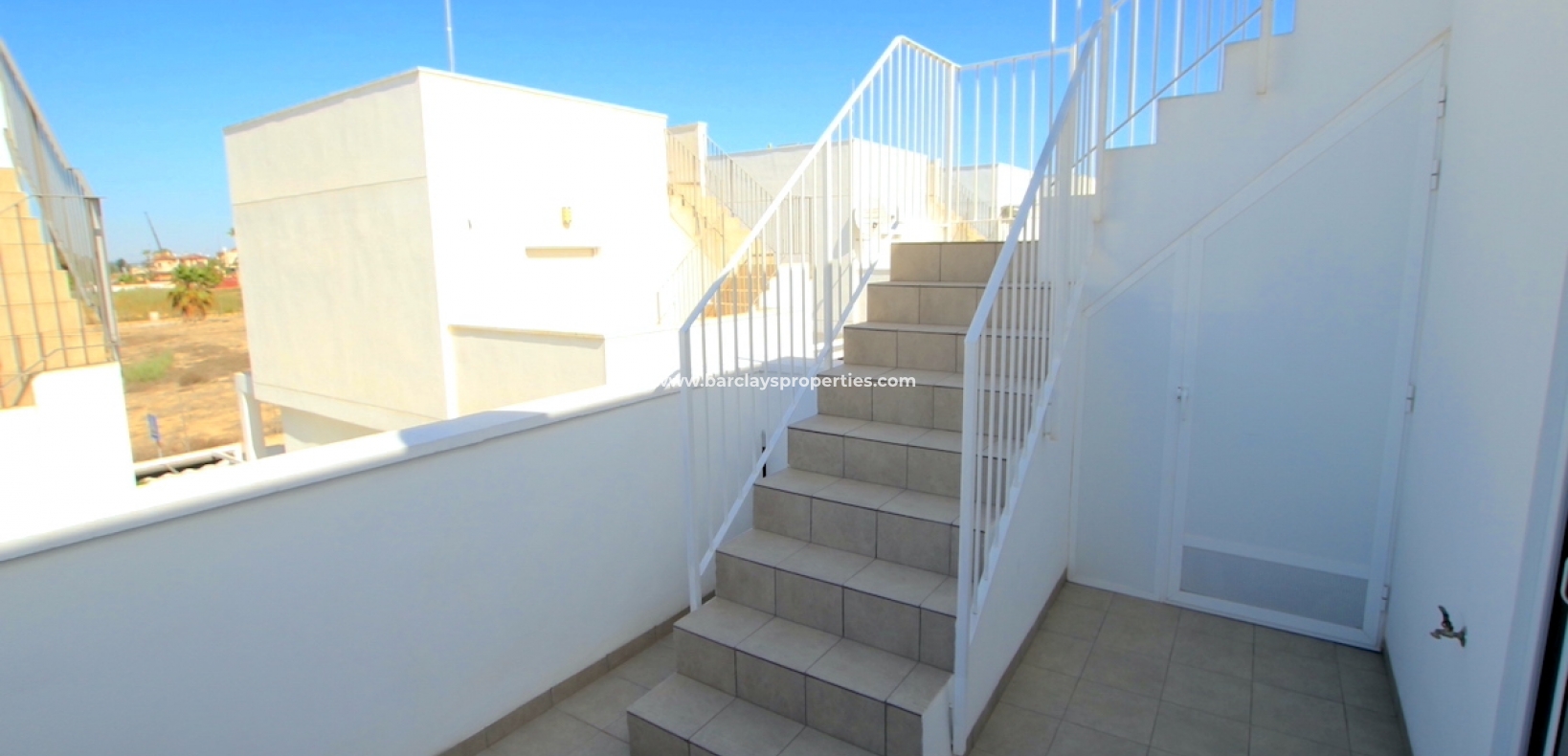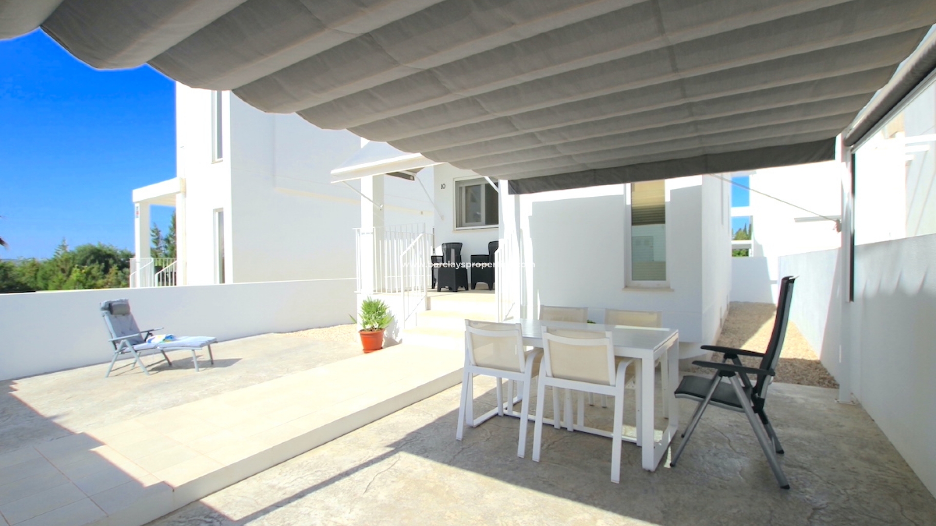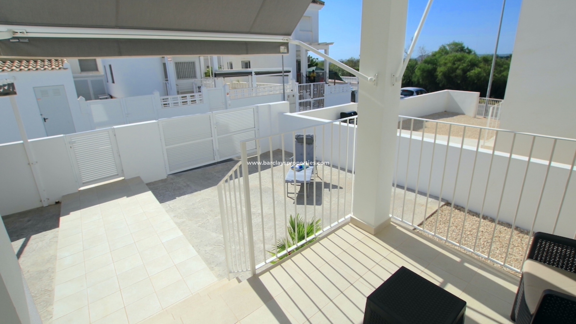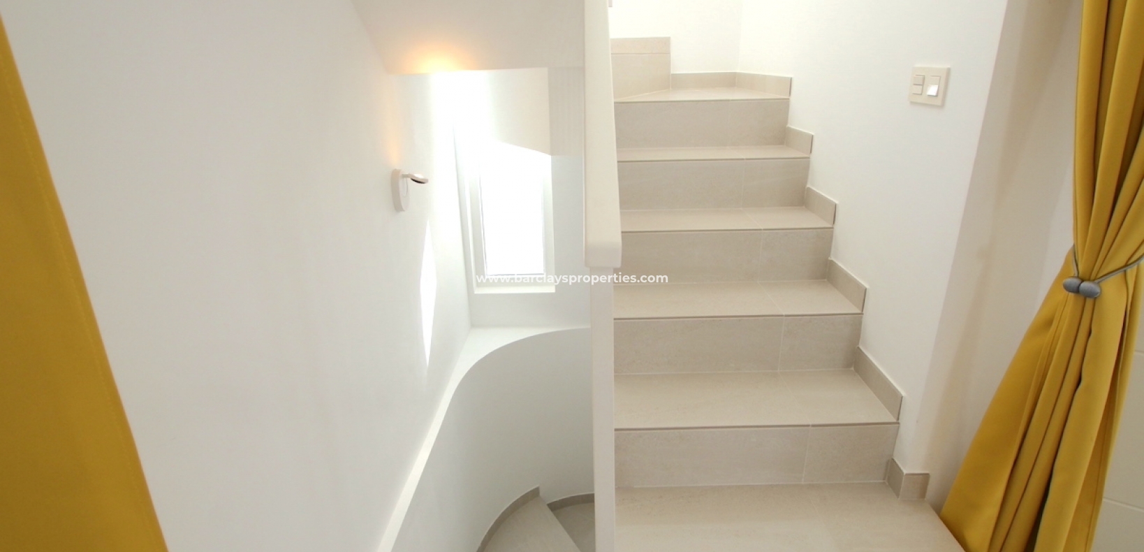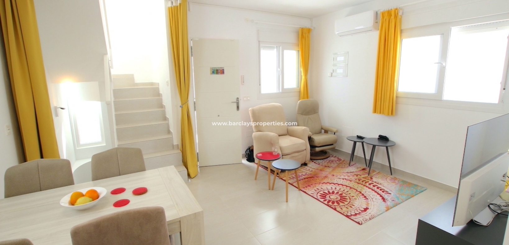 Binnen beslaat de villa drie verdiepingen, met een open indeling op de begane grond die een ruime woon- en eetkamer, een moderne keuken, een tweepersoons slaapkamer en een volledige badkamer omvat. Op de eerste verdieping bevinden zich nog twee tweepersoons slaapkamers, een extra badkamer, en een achterste slaapkamer met toegang tot een zonneterras en een wasruimte. Via de trap komt men op een groot solarium met uitzicht op het gemeenschappelijke zwembad en het omliggende platteland—de perfecte plek om te zonnebaden of in de avond te ontspannen.