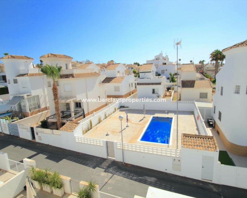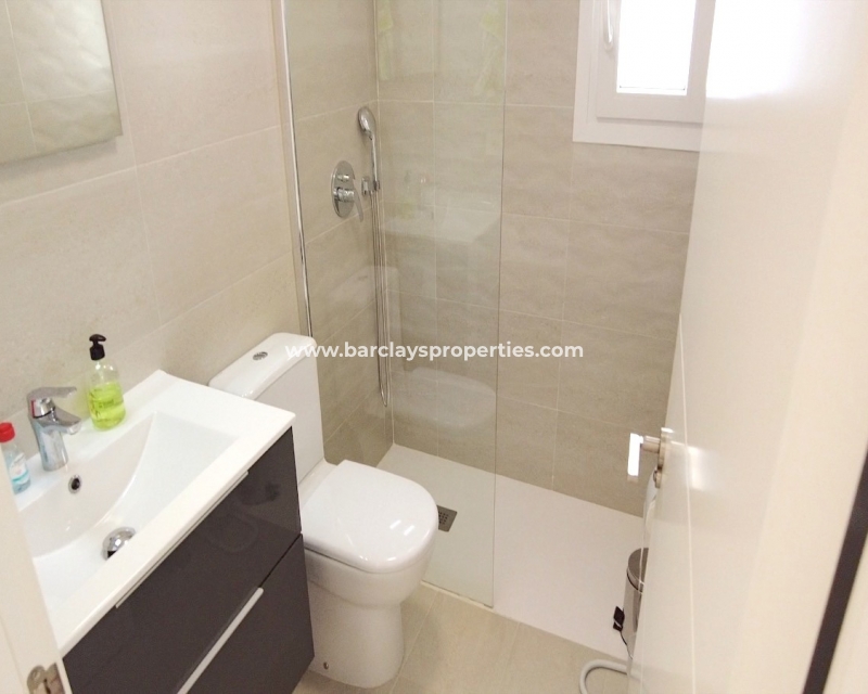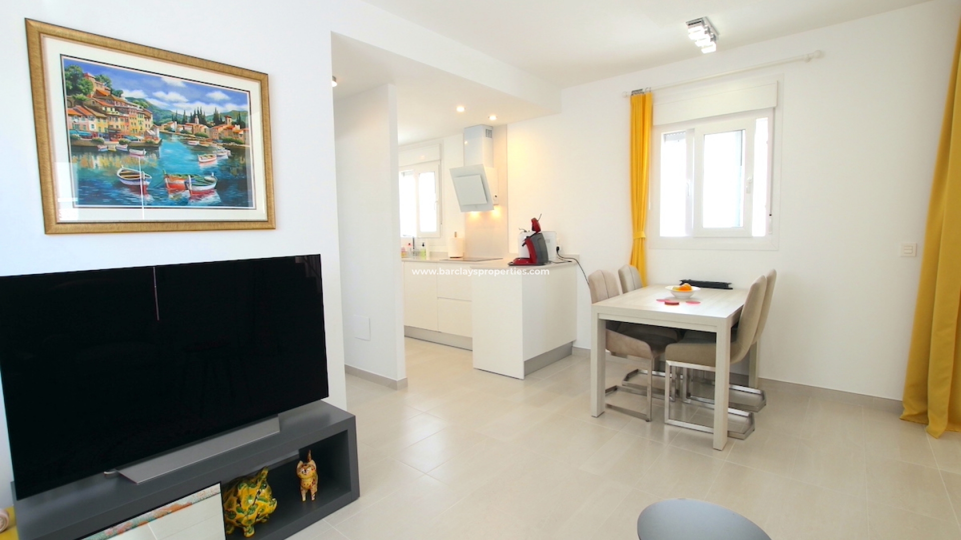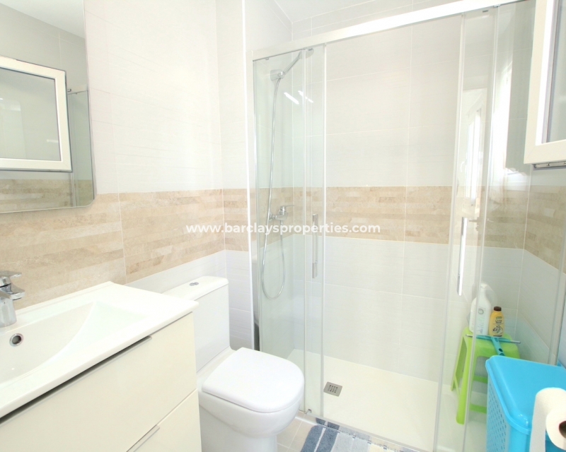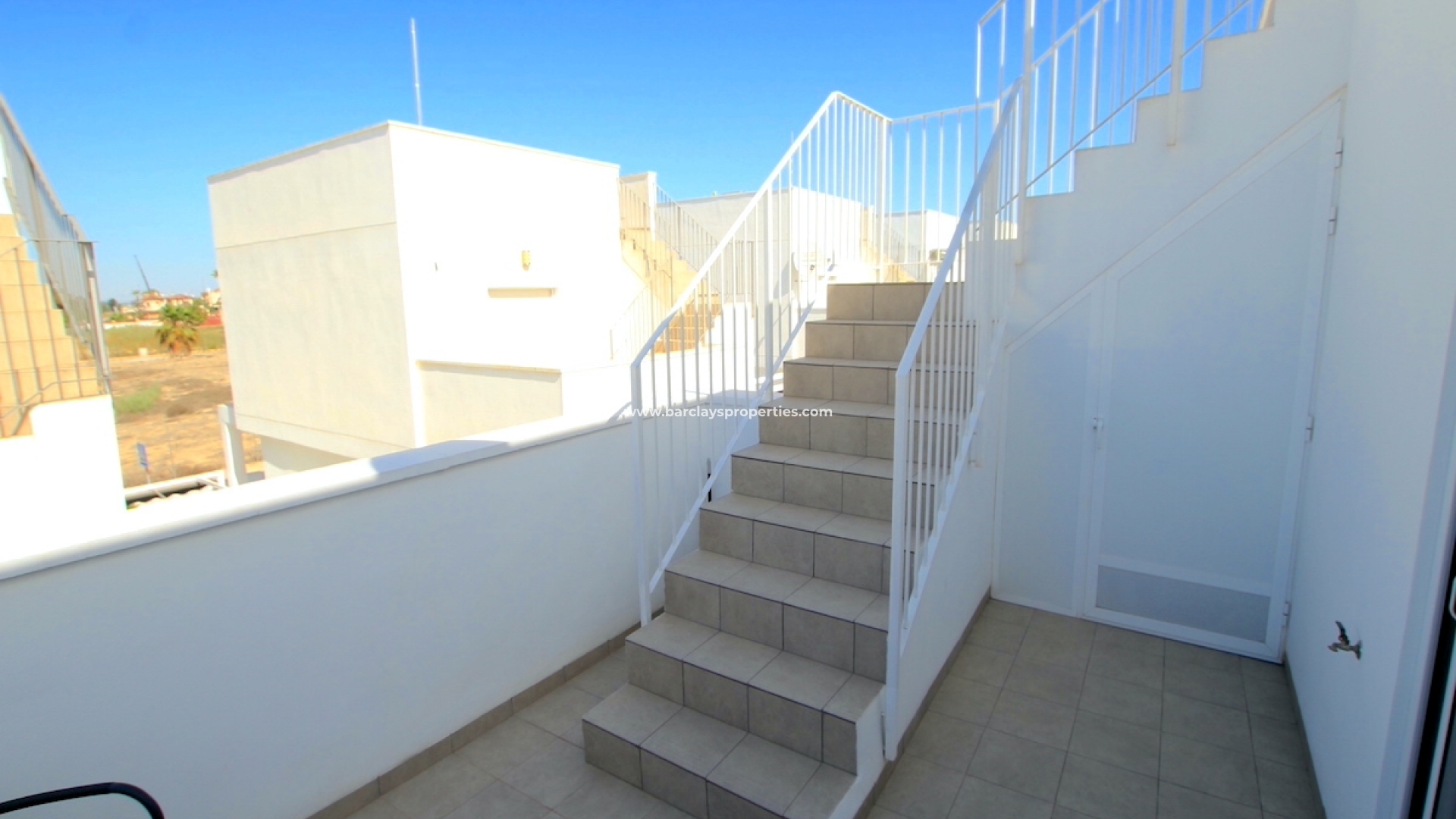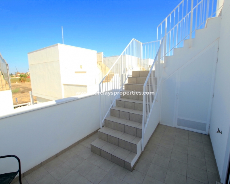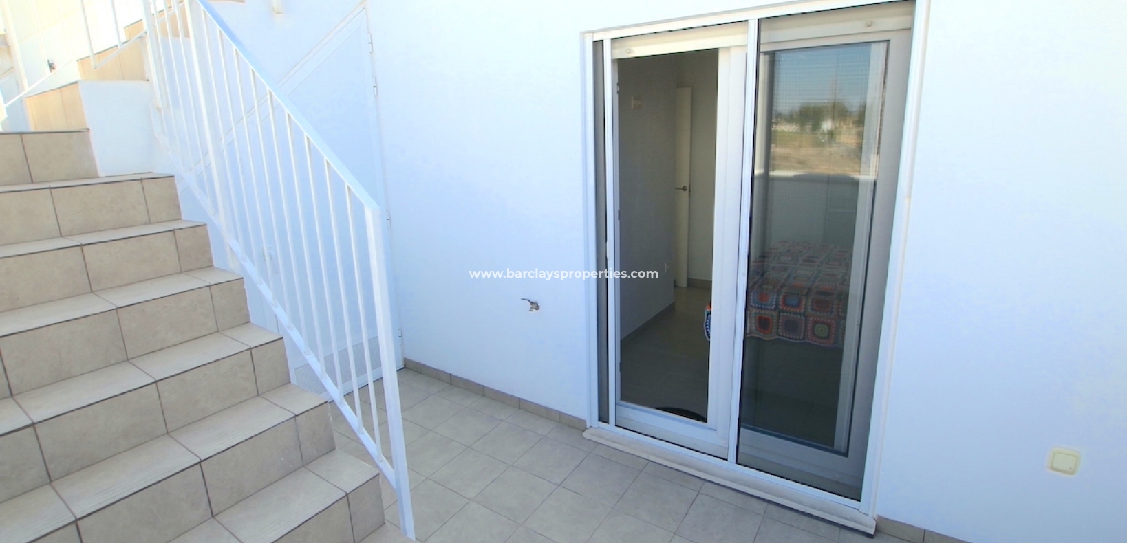 Binnen beslaat de villa drie verdiepingen, met een open indeling op de begane grond die een ruime woon- en eetkamer, een moderne keuken, een tweepersoons slaapkamer en een volledige badkamer omvat. Op de eerste verdieping bevinden zich nog twee tweepersoons slaapkamers, een extra badkamer, en een achterste slaapkamer met toegang tot een zonneterras en een wasruimte. Via de trap komt men op een groot solarium met uitzicht op het gemeenschappelijke zwembad en het omliggende platteland—de perfecte plek om te zonnebaden of in de avond te ontspannen.