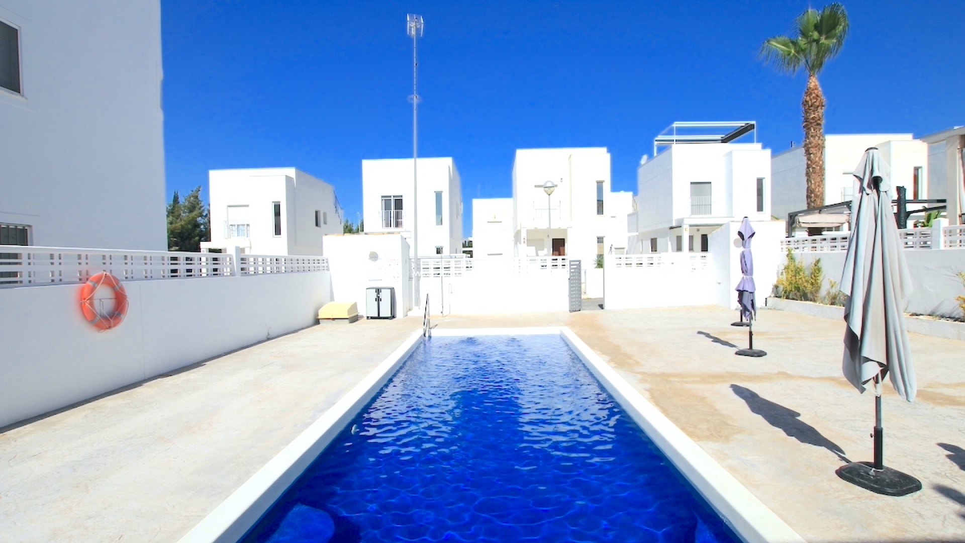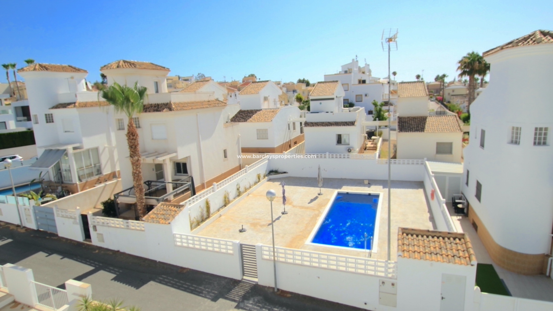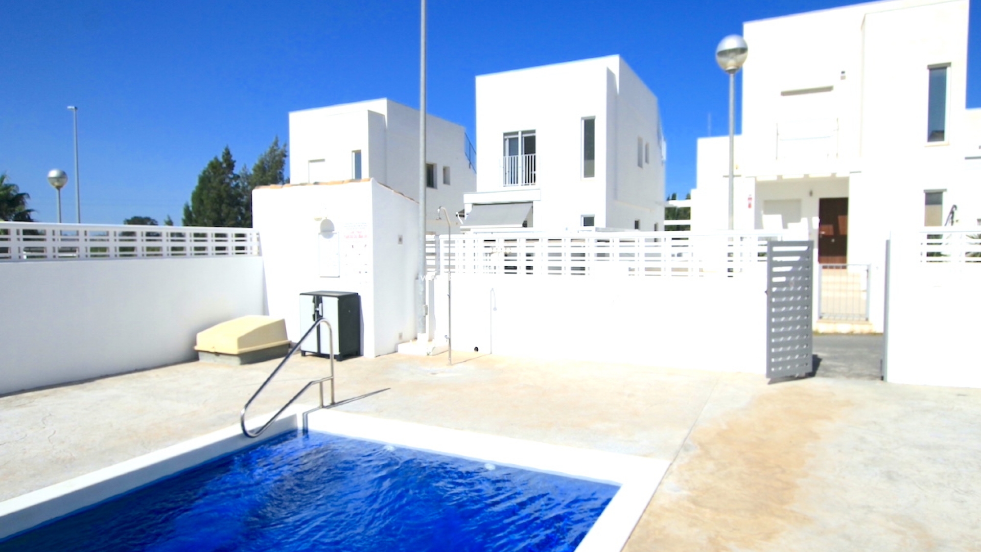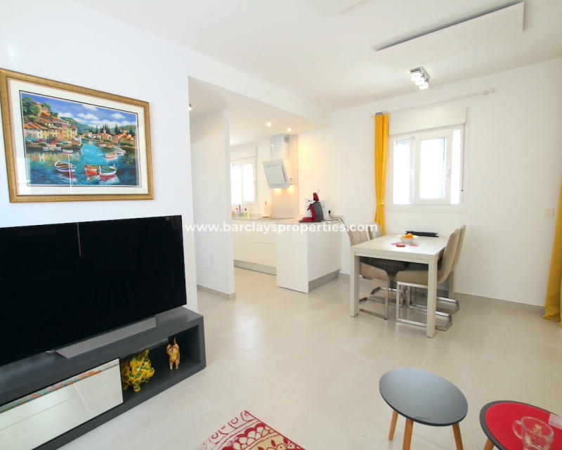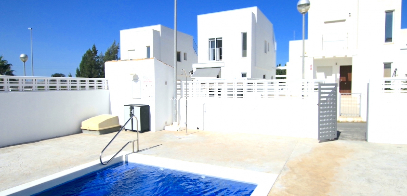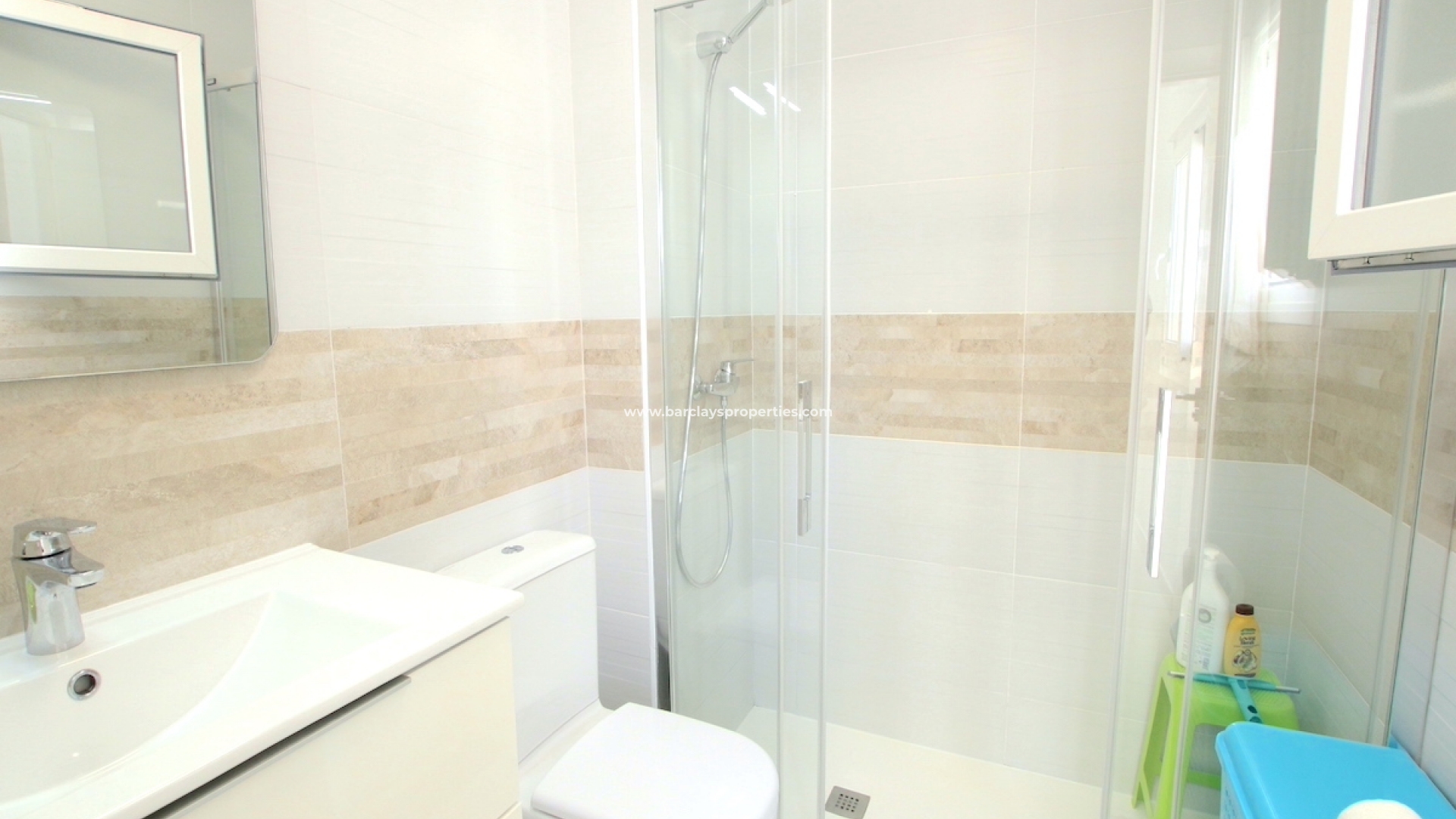 Binnen beslaat de villa drie verdiepingen, met een open indeling op de begane grond die een ruime woon- en eetkamer, een moderne keuken, een tweepersoons slaapkamer en een volledige badkamer omvat. Op de eerste verdieping bevinden zich nog twee tweepersoons slaapkamers, een extra badkamer, en een achterste slaapkamer met toegang tot een zonneterras en een wasruimte. Via de trap komt men op een groot solarium met uitzicht op het gemeenschappelijke zwembad en het omliggende platteland—de perfecte plek om te zonnebaden of in de avond te ontspannen.