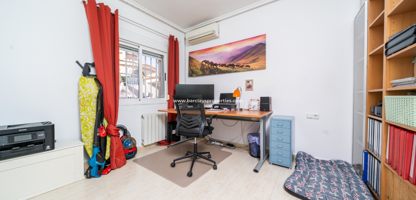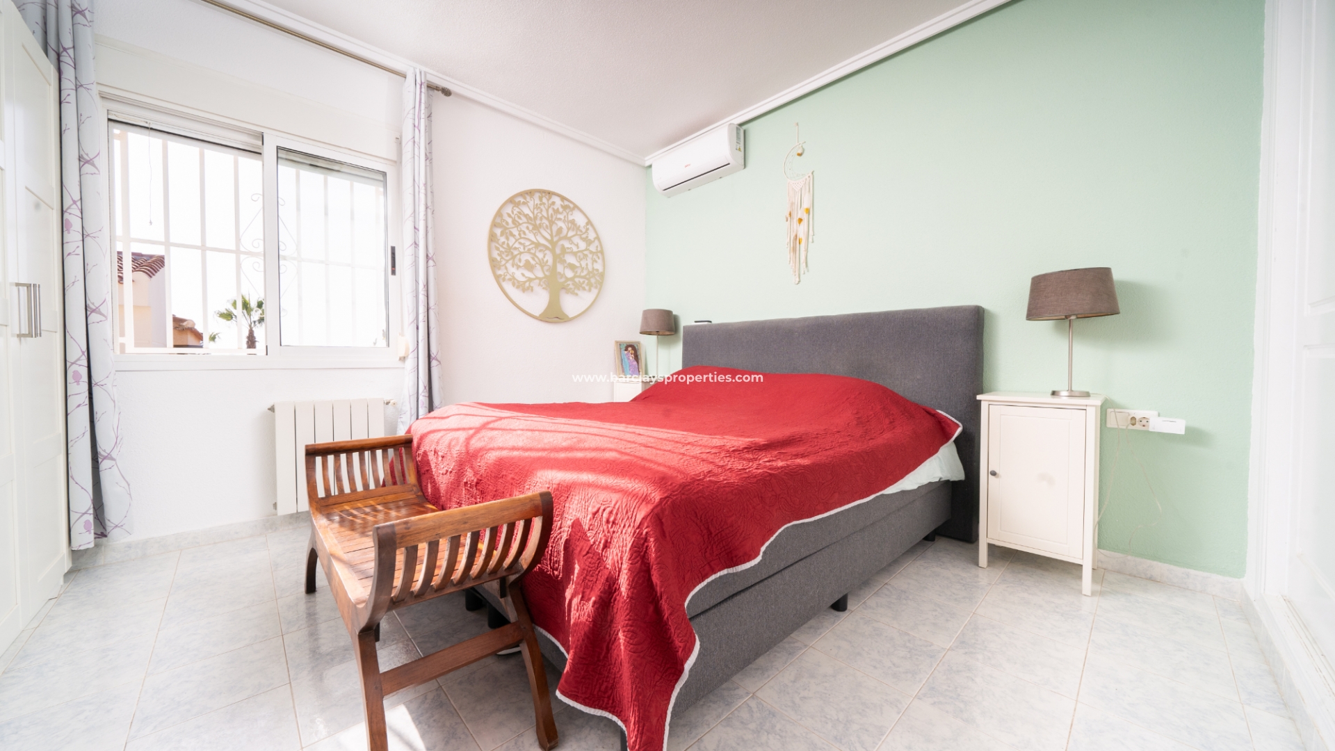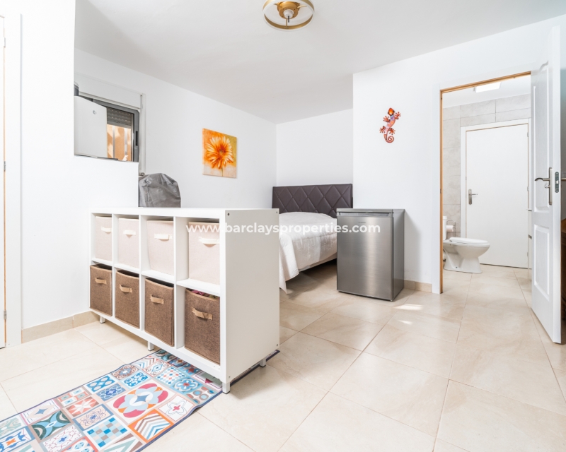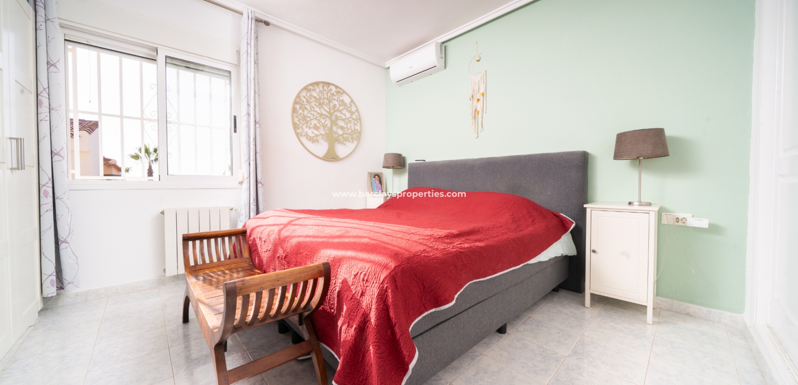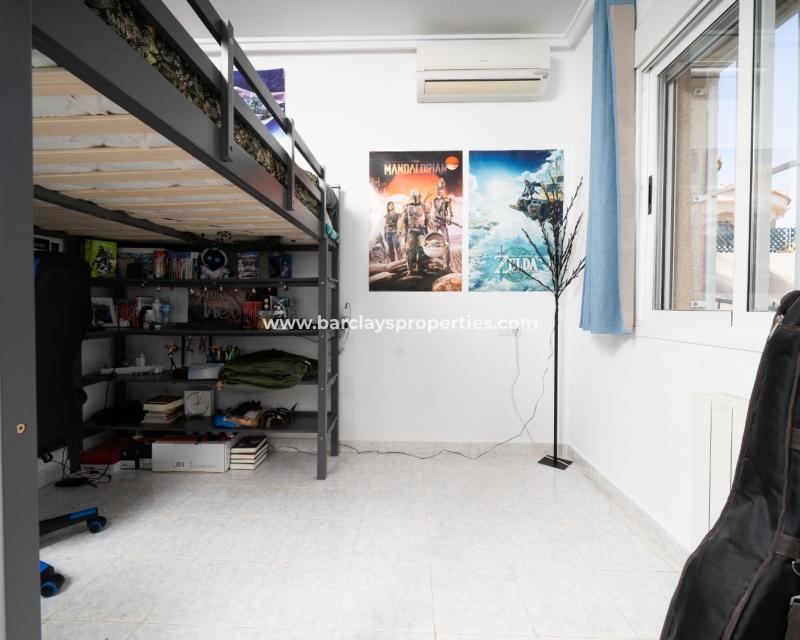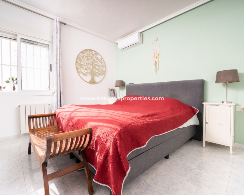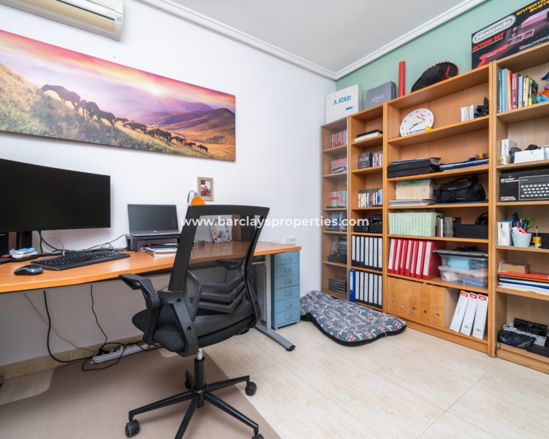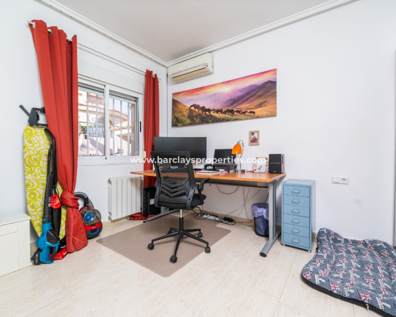 De hoofdslaapkamer is een ruime tweepersoonskamer met een en-suite badkamer, inclusief douche, bidet en dubbele wastafels. Een tweede tweepersoonsslaapkamer beschikt over airconditioning en een ingebouwde kledingkast, terwijl de derde slaapkamer, momenteel gebruikt als kantoor, ook voorzien is van airconditioning en ingebouwde opbergruimte. De hoofd badkamer heeft een bad, wastafelmeubel en toilet.