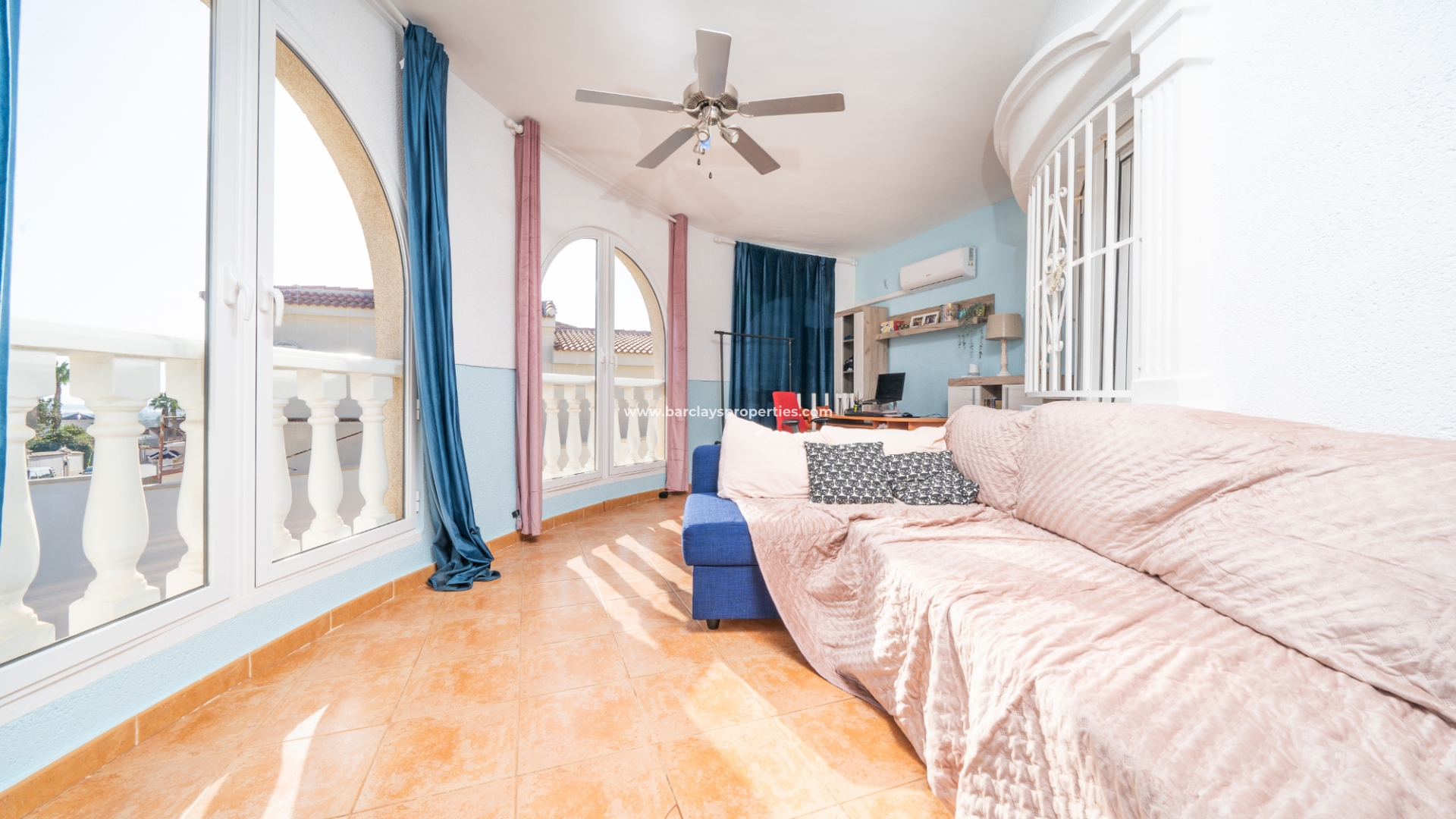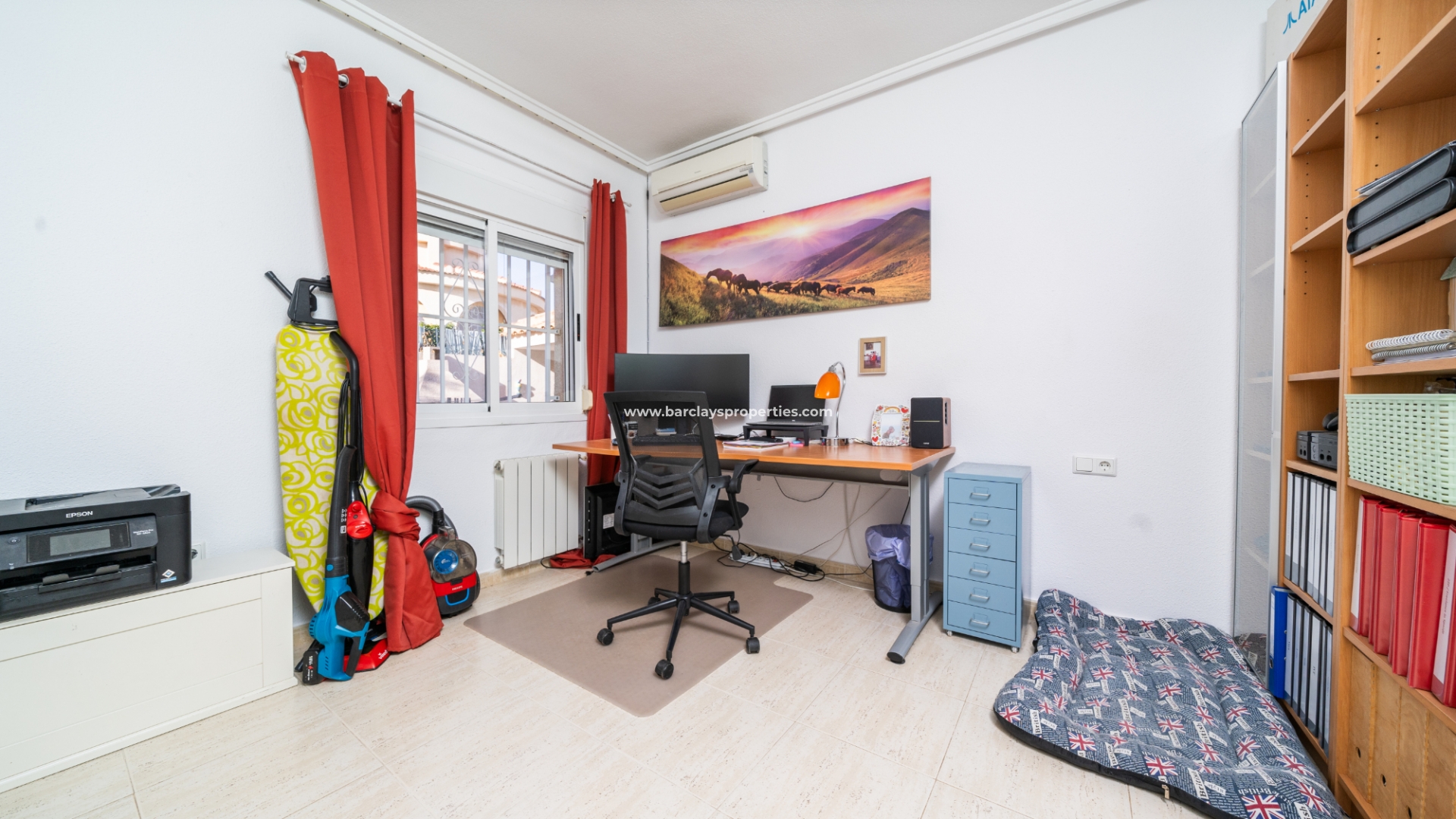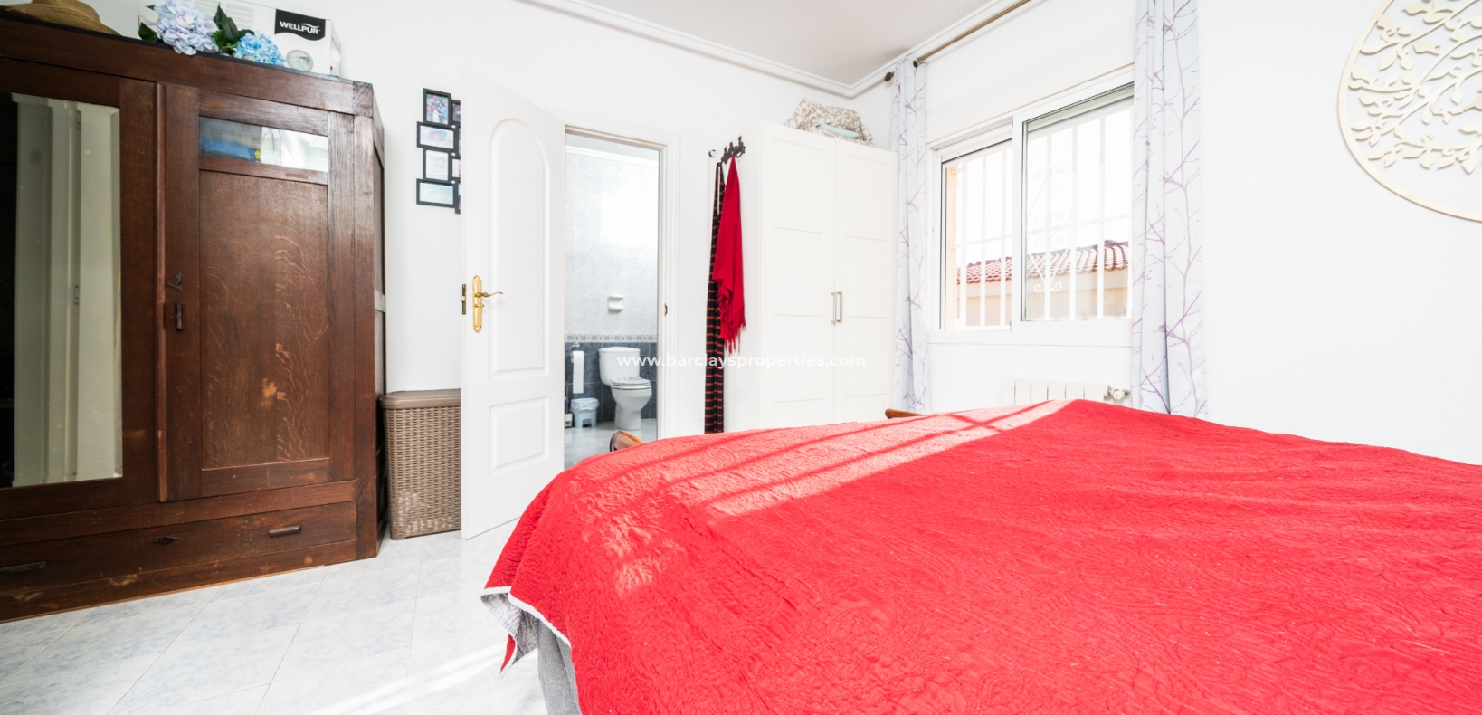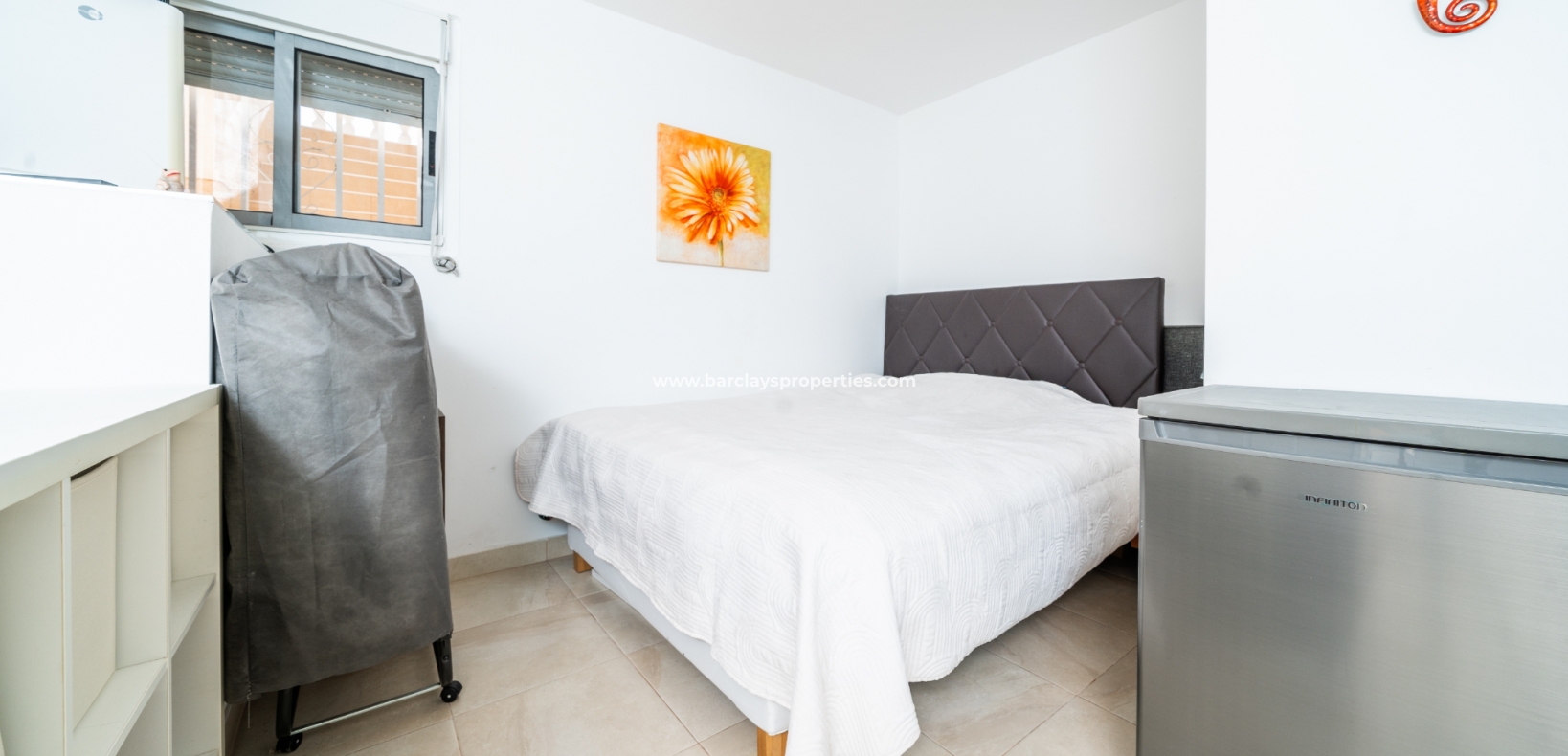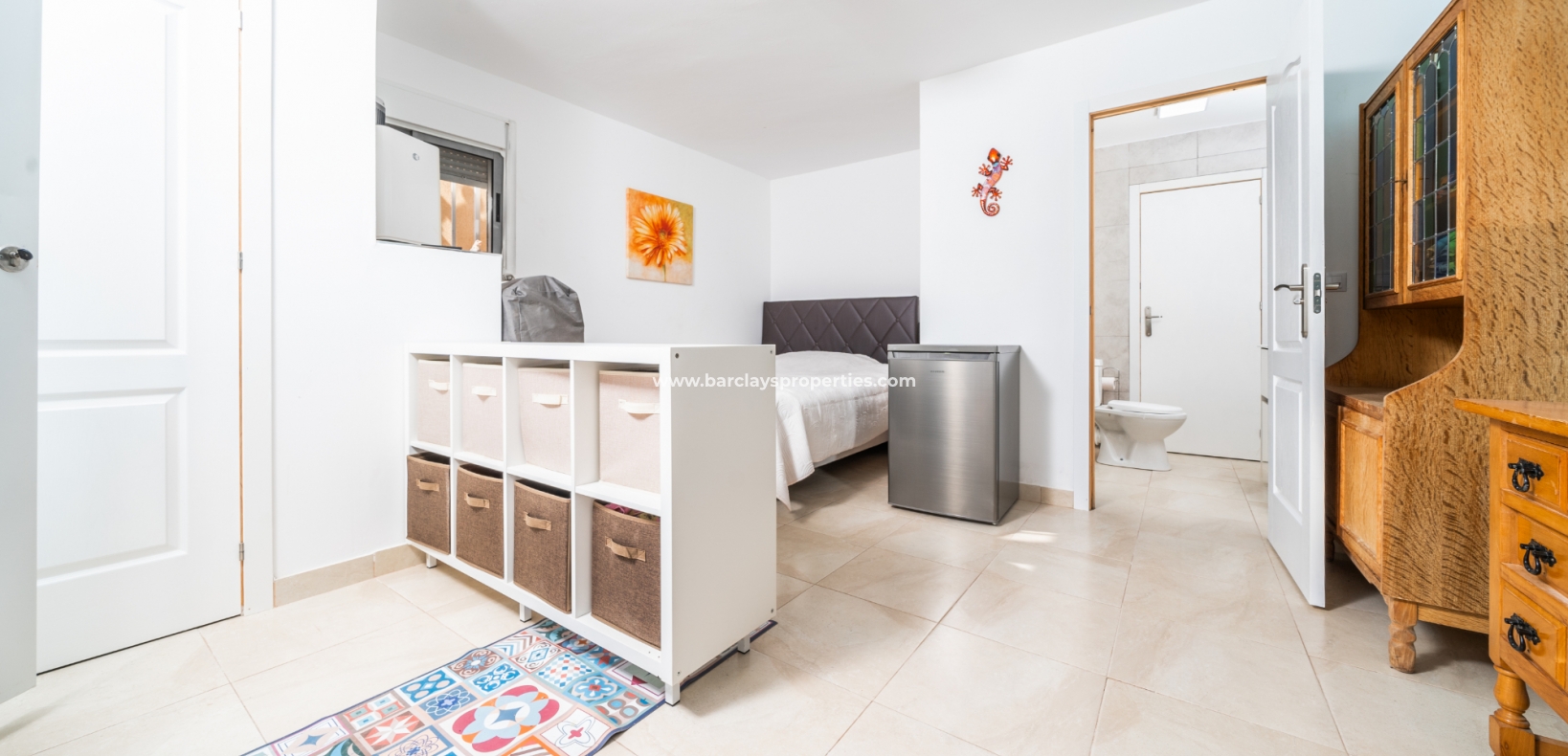 De hoofdslaapkamer is een ruime tweepersoonskamer met een en-suite badkamer, inclusief douche, bidet en dubbele wastafels. Een tweede tweepersoonsslaapkamer beschikt over airconditioning en een ingebouwde kledingkast, terwijl de derde slaapkamer, momenteel gebruikt als kantoor, ook voorzien is van airconditioning en ingebouwde opbergruimte. De hoofd badkamer heeft een bad, wastafelmeubel en toilet.