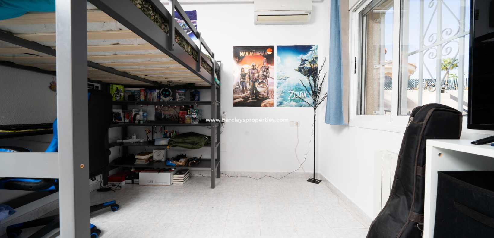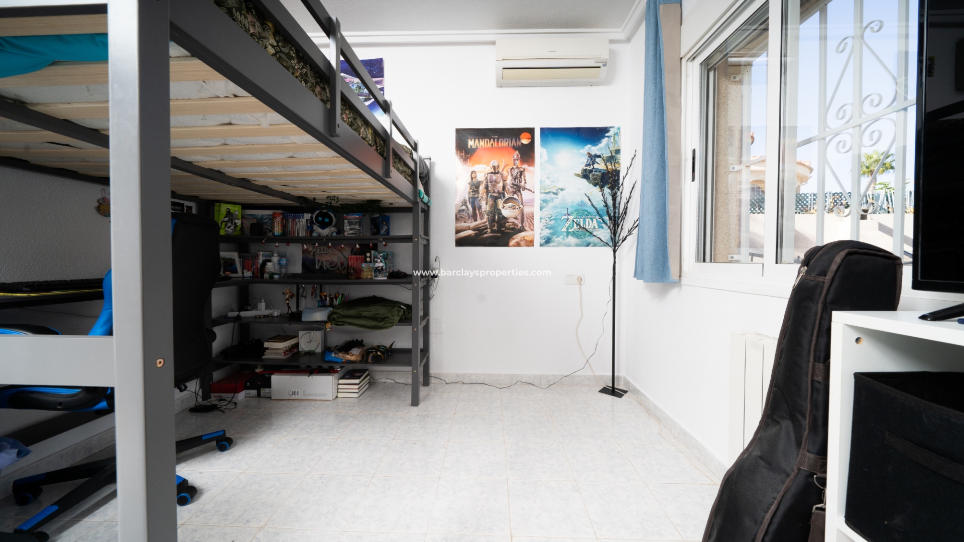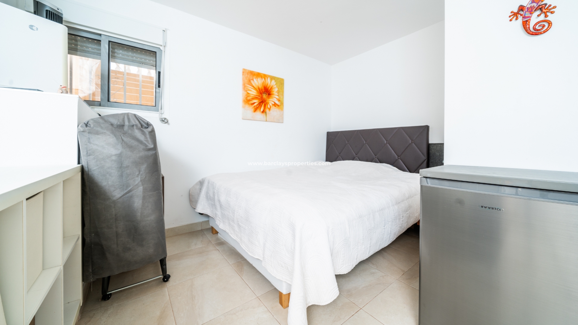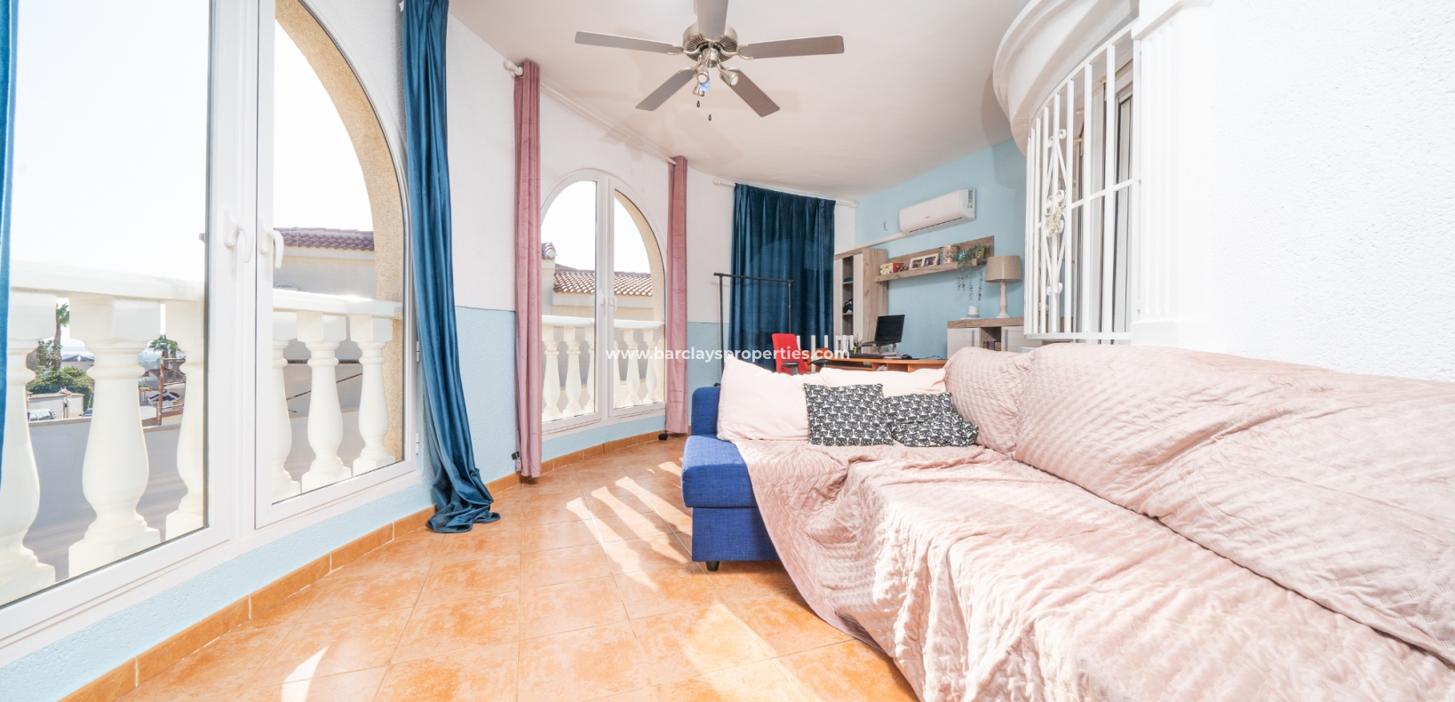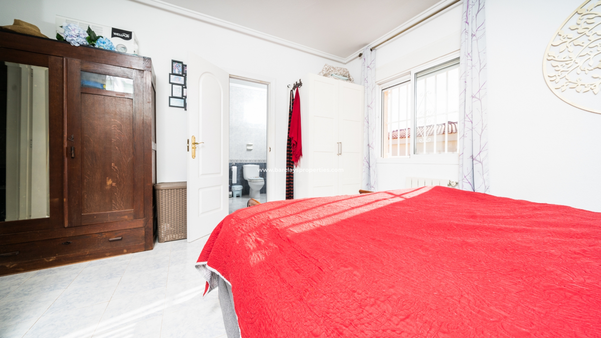 De hoofdslaapkamer is een ruime tweepersoonskamer met een en-suite badkamer, inclusief douche, bidet en dubbele wastafels. Een tweede tweepersoonsslaapkamer beschikt over airconditioning en een ingebouwde kledingkast, terwijl de derde slaapkamer, momenteel gebruikt als kantoor, ook voorzien is van airconditioning en ingebouwde opbergruimte. De hoofd badkamer heeft een bad, wastafelmeubel en toilet.