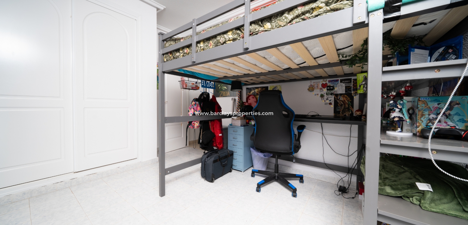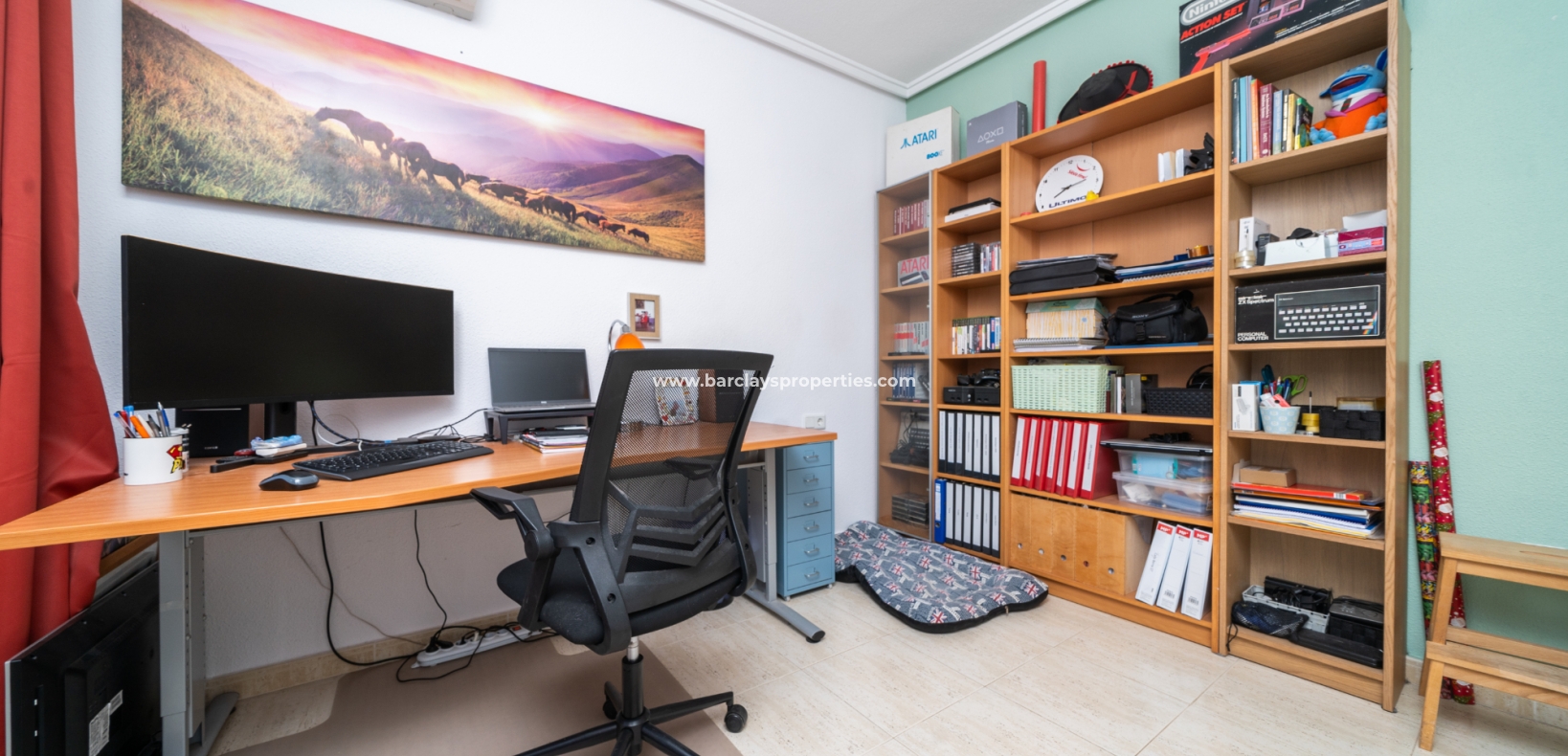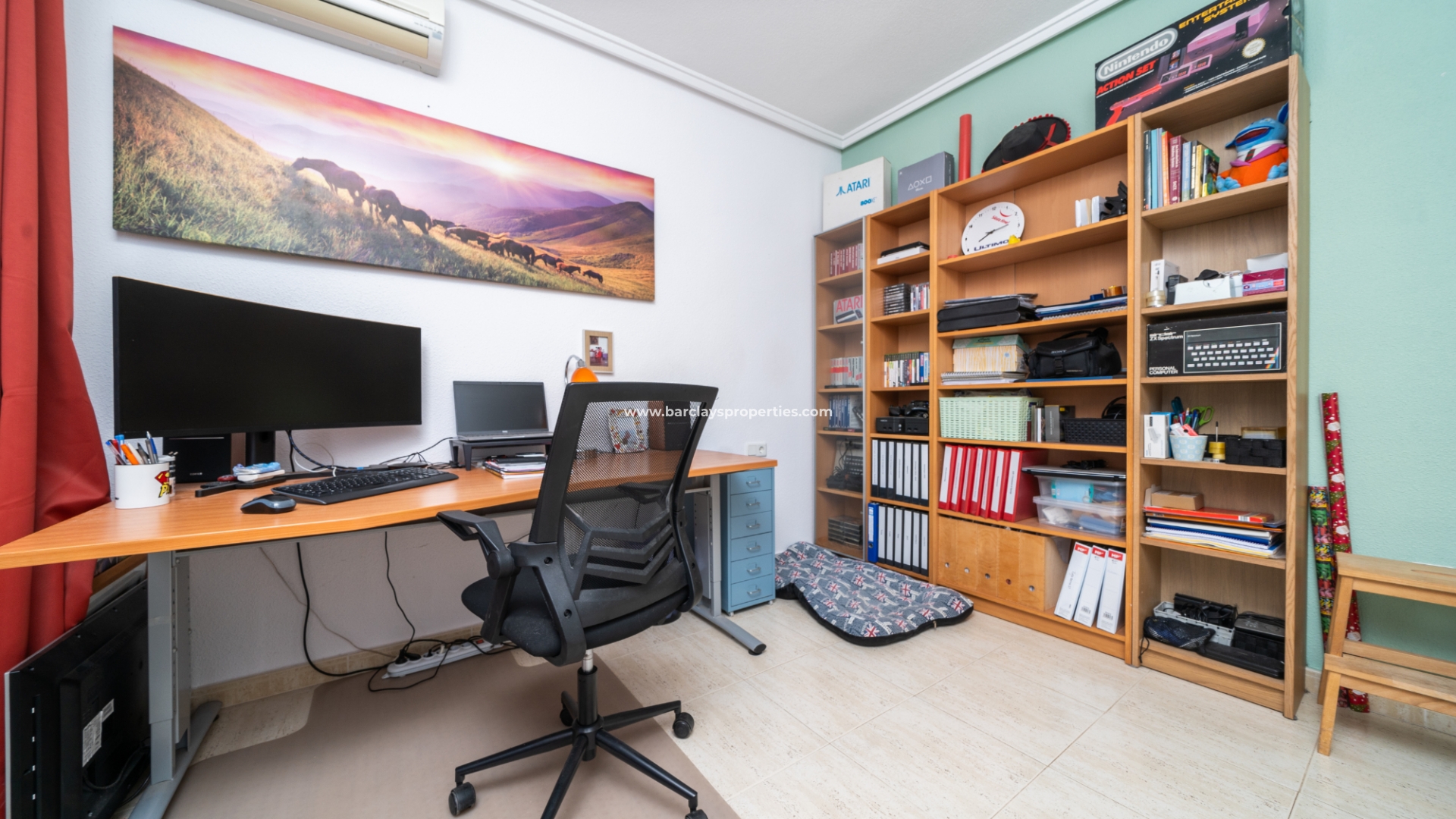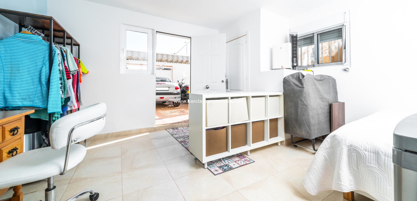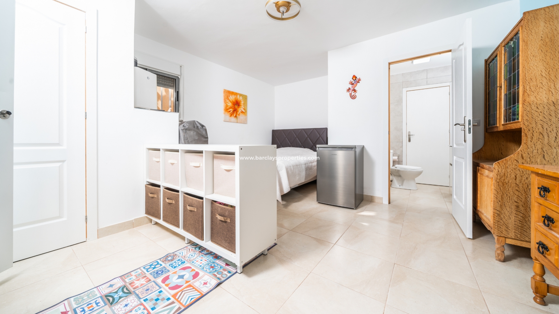 De hoofdslaapkamer is een ruime tweepersoonskamer met een en-suite badkamer, inclusief douche, bidet en dubbele wastafels. Een tweede tweepersoonsslaapkamer beschikt over airconditioning en een ingebouwde kledingkast, terwijl de derde slaapkamer, momenteel gebruikt als kantoor, ook voorzien is van airconditioning en ingebouwde opbergruimte. De hoofd badkamer heeft een bad, wastafelmeubel en toilet.