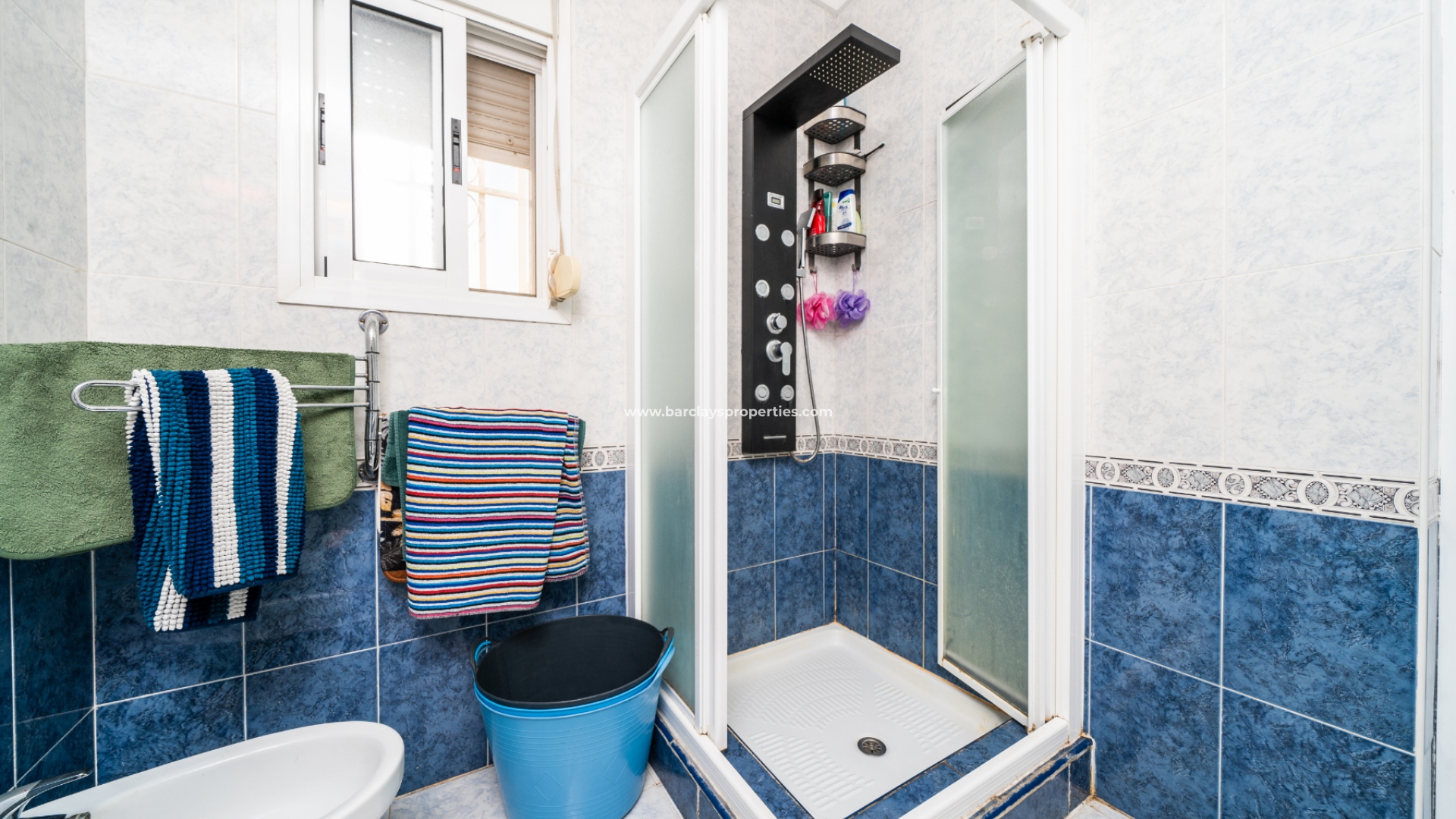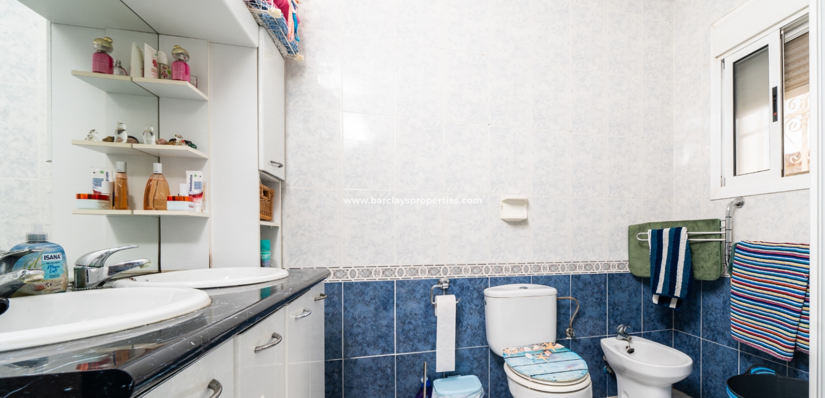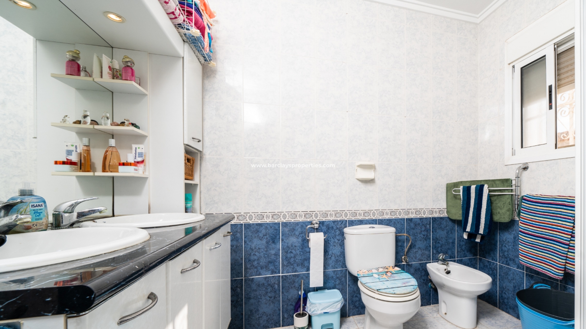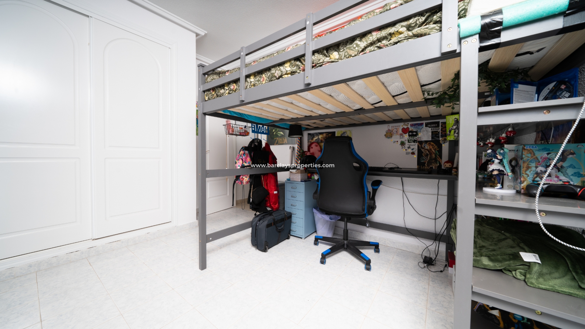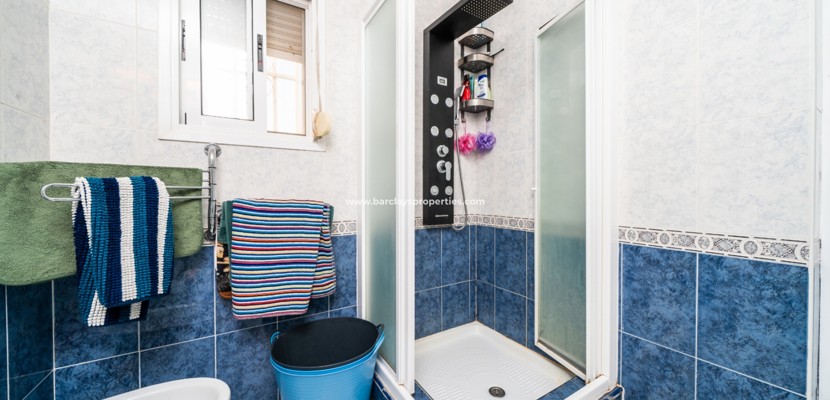 De hoofdslaapkamer is een ruime tweepersoonskamer met een en-suite badkamer, inclusief douche, bidet en dubbele wastafels. Een tweede tweepersoonsslaapkamer beschikt over airconditioning en een ingebouwde kledingkast, terwijl de derde slaapkamer, momenteel gebruikt als kantoor, ook voorzien is van airconditioning en ingebouwde opbergruimte. De hoofd badkamer heeft een bad, wastafelmeubel en toilet.