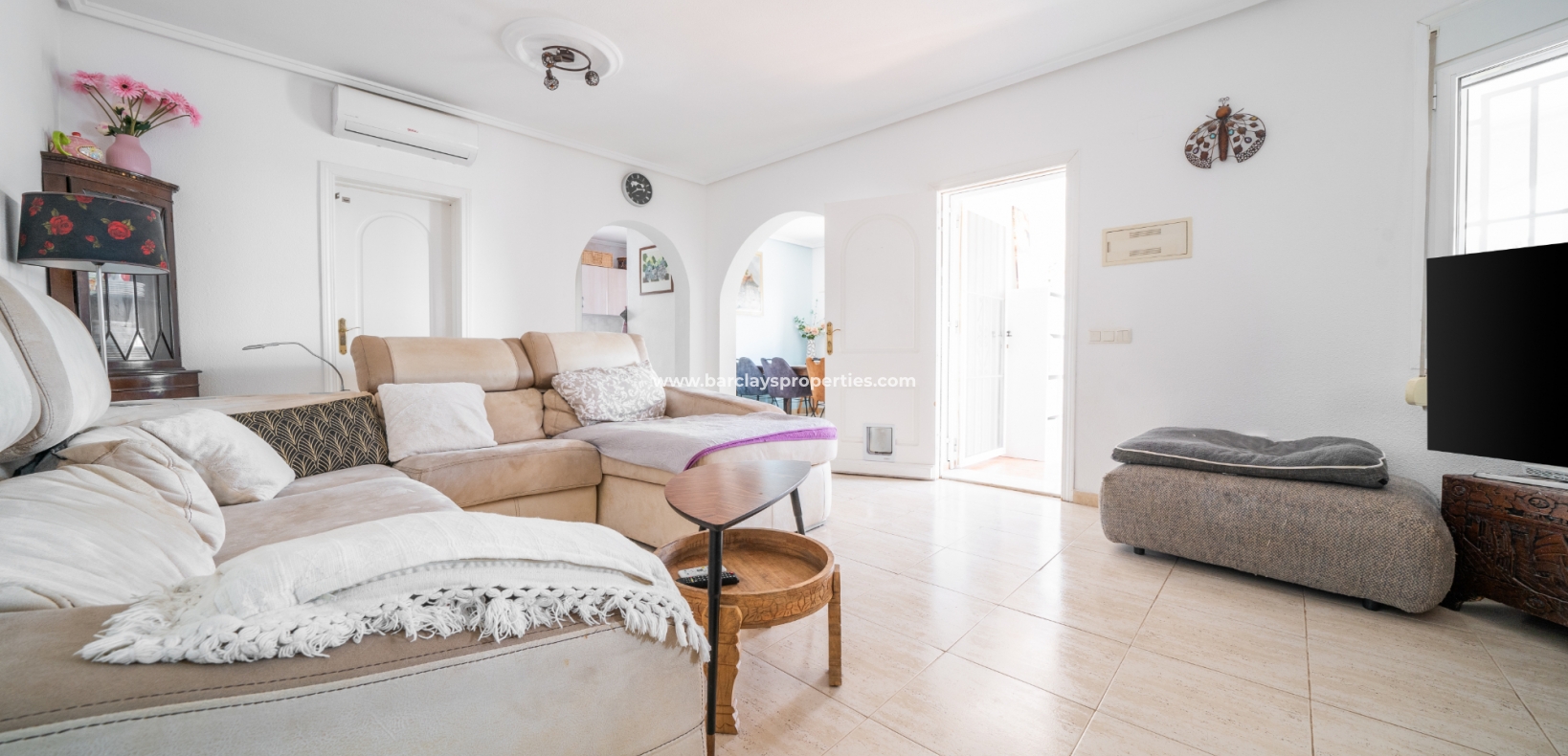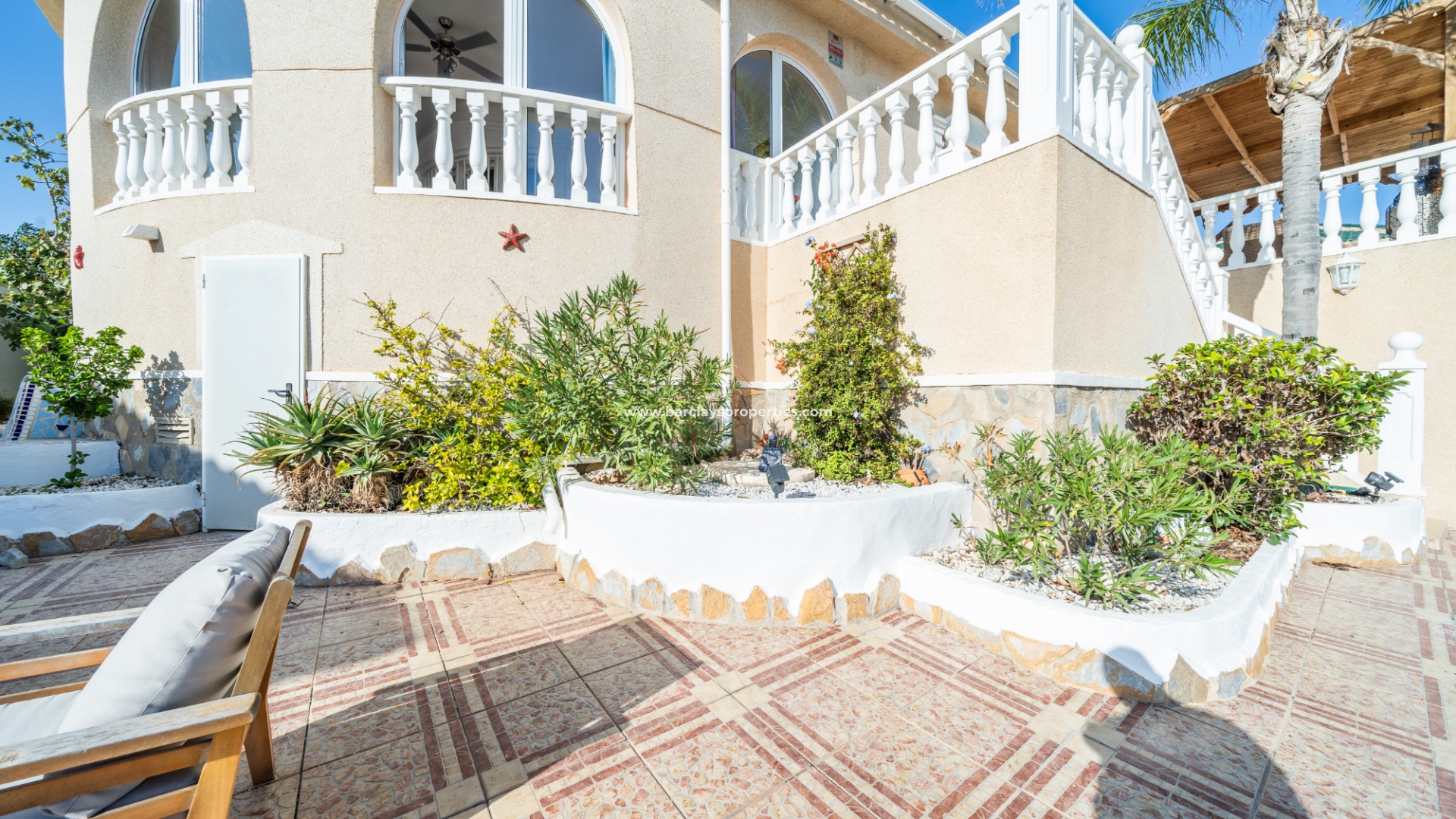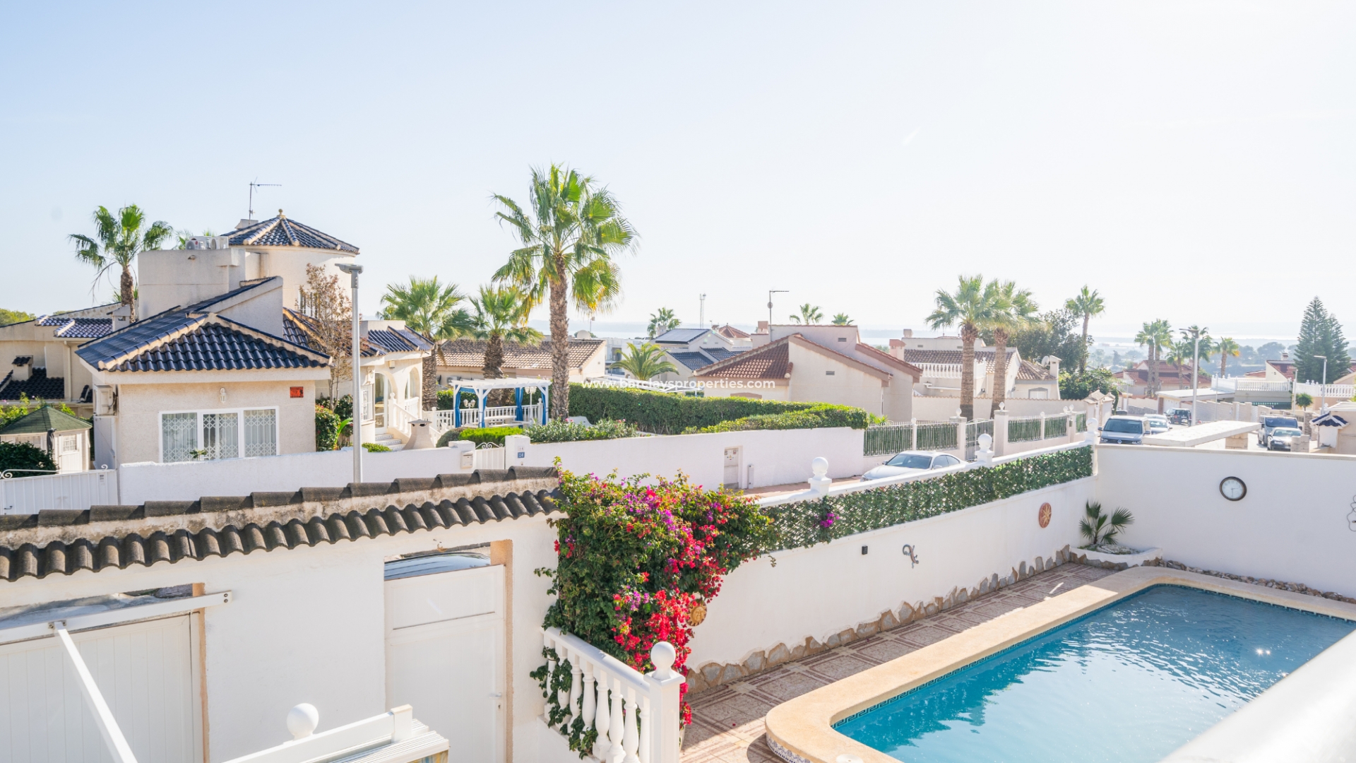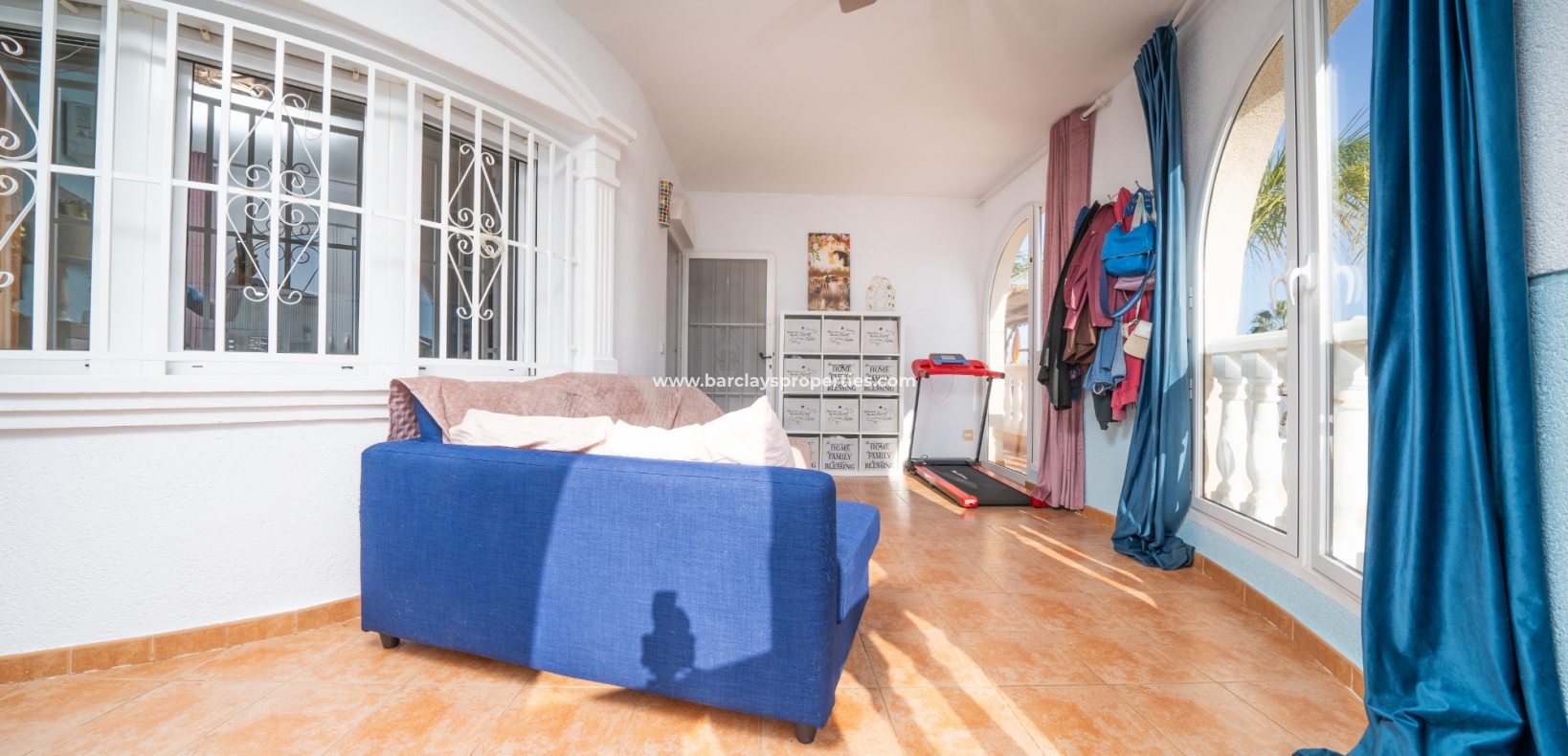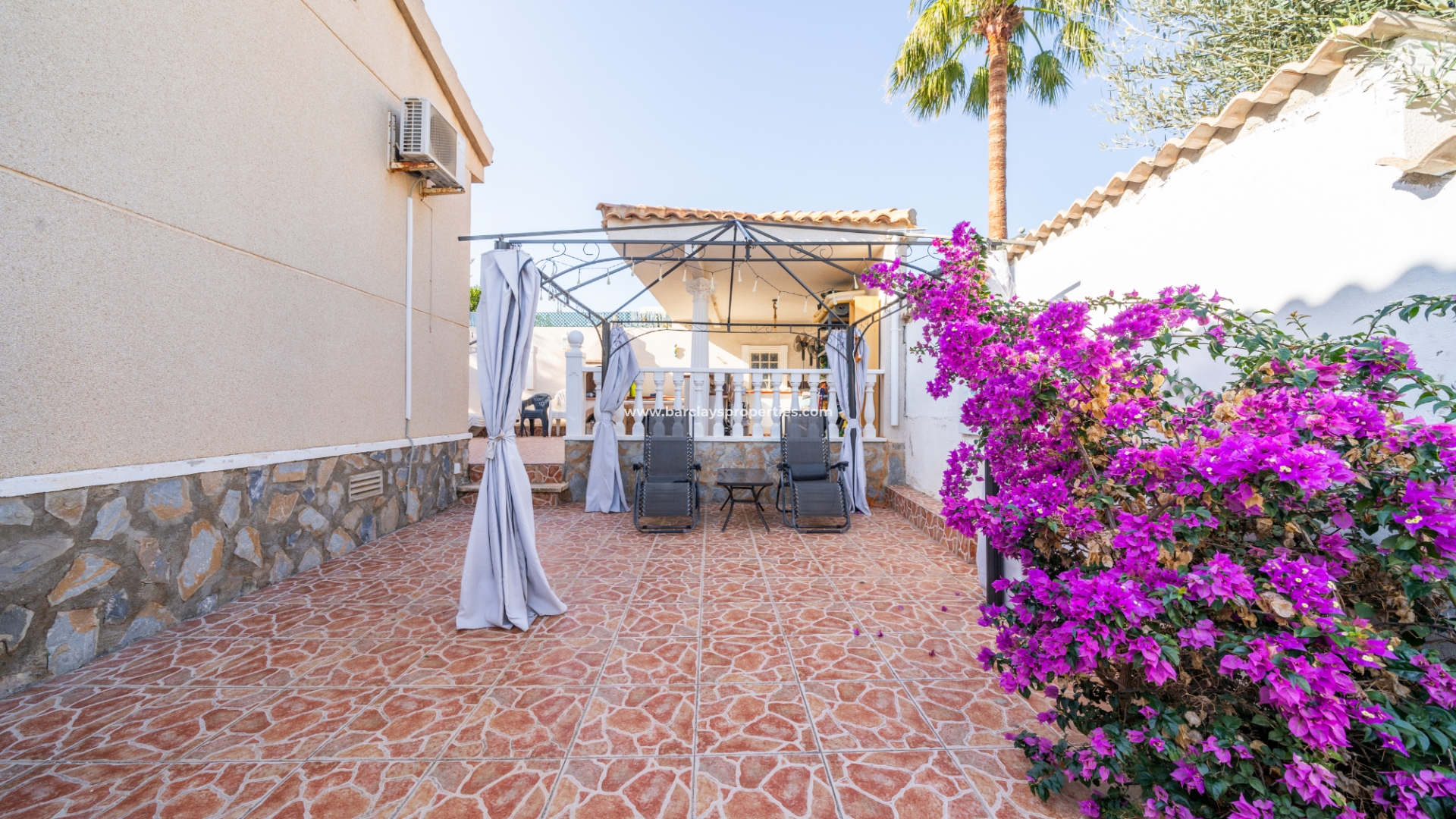 De hoofdslaapkamer is een ruime tweepersoonskamer met een en-suite badkamer, inclusief douche, bidet en dubbele wastafels. Een tweede tweepersoonsslaapkamer beschikt over airconditioning en een ingebouwde kledingkast, terwijl de derde slaapkamer, momenteel gebruikt als kantoor, ook voorzien is van airconditioning en ingebouwde opbergruimte. De hoofd badkamer heeft een bad, wastafelmeubel en toilet.