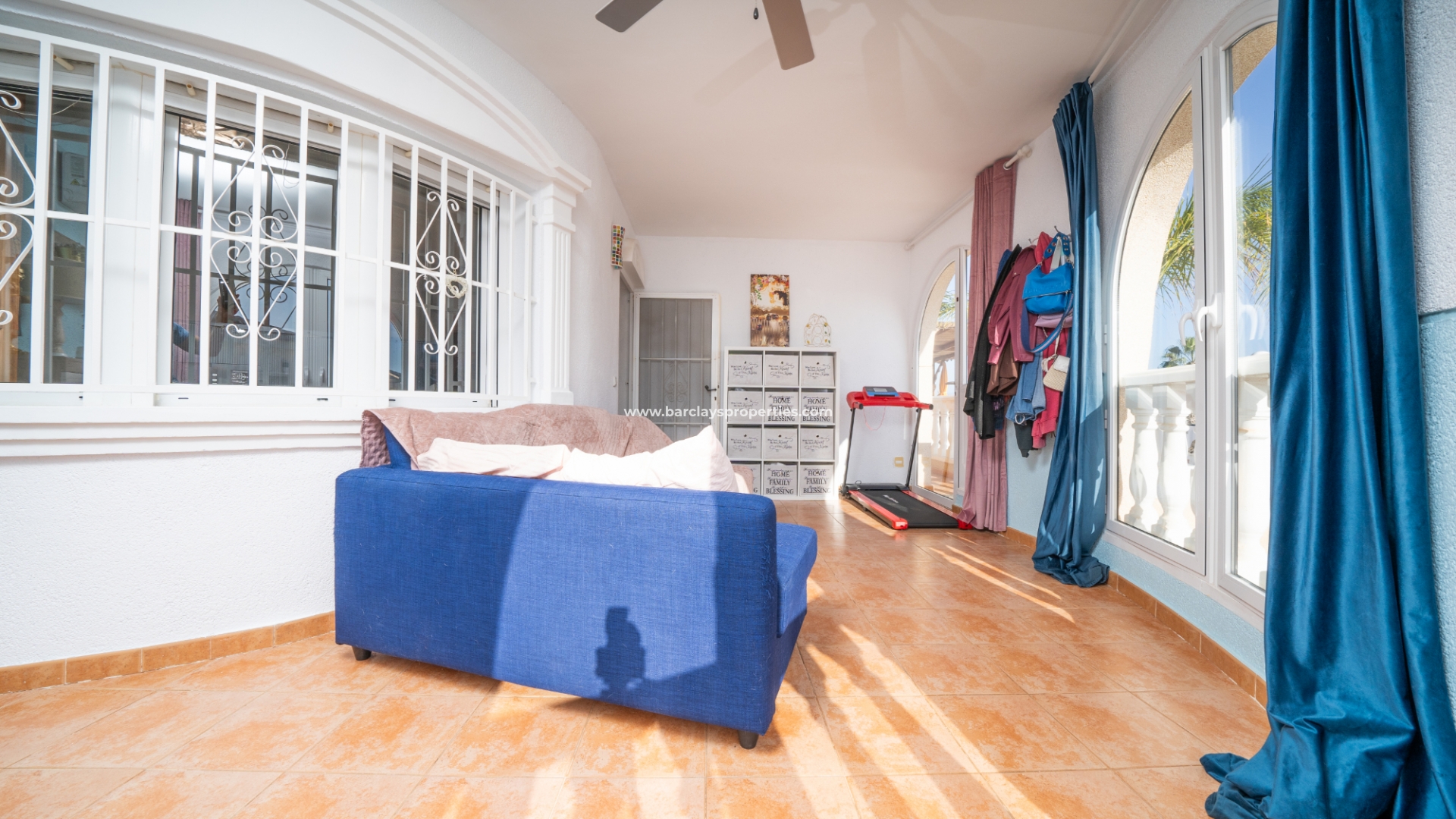Een ruime glazen veranda met plafondventilator en airconditioning biedt een prachtig uitzicht en extra ontspanningsruimte.