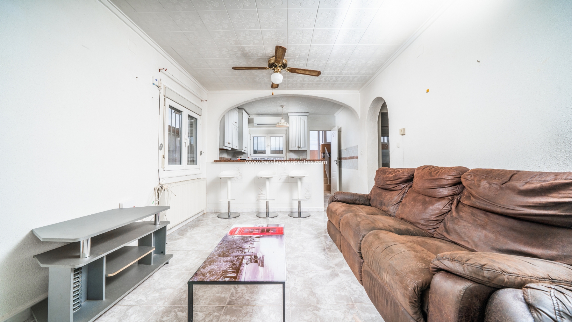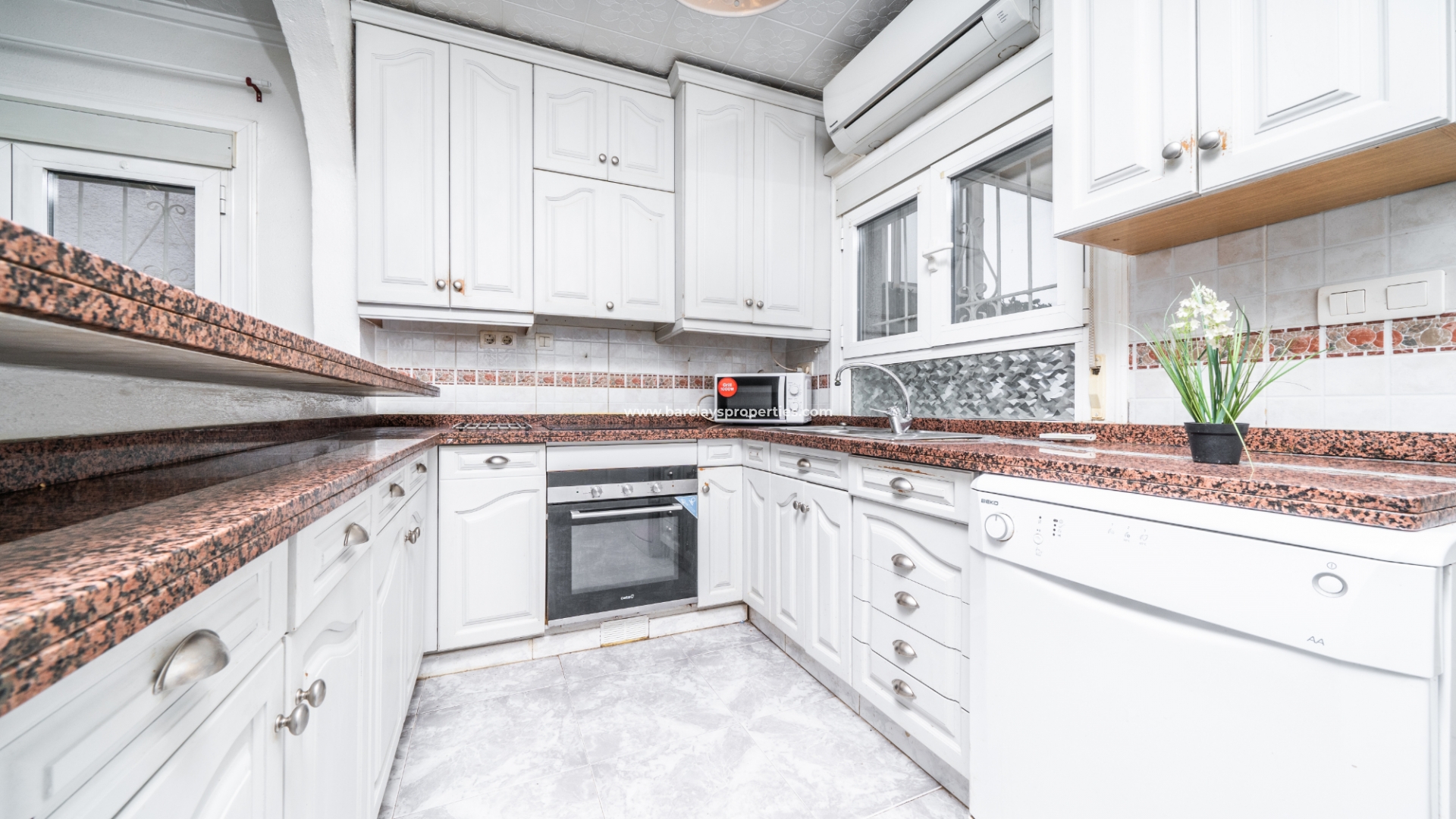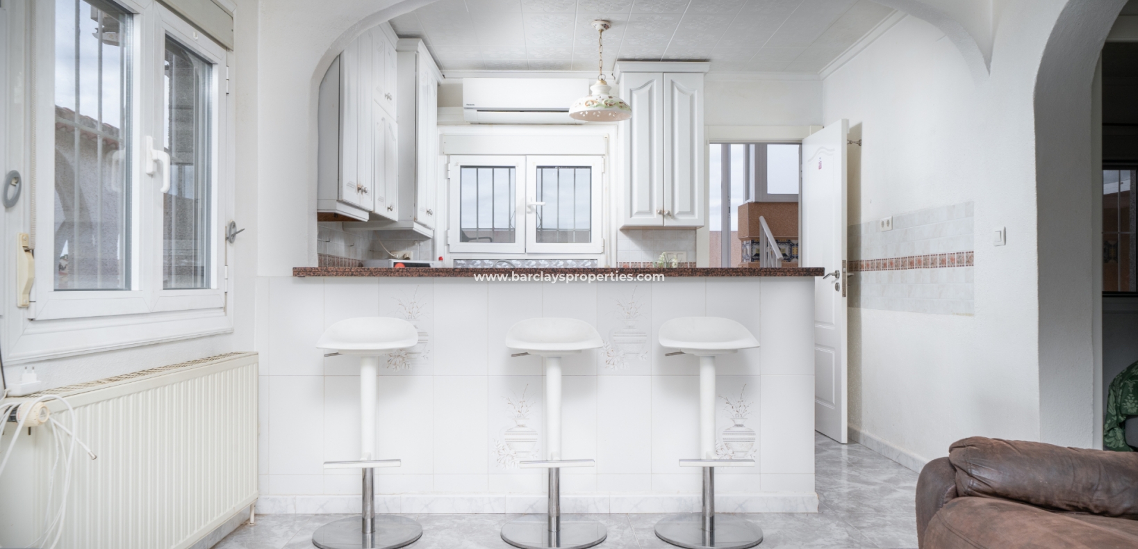De ingang leidt naar een schaduwrijke veranda, perfect om van zonnige dagen te genieten. Binnen is er een uitnodigend zitgedeelte dat overgaat in een lichte woonkamer met plafondventilator en een eetkamer die grenst aan de open, vernieuwde, frisse witte volledig uitgeruste keuken. De keuken is voorzien van airconditioning voor extra comfort.