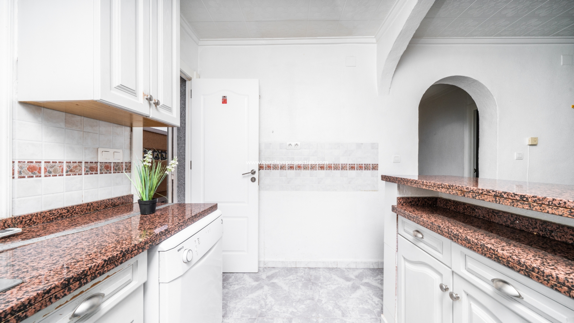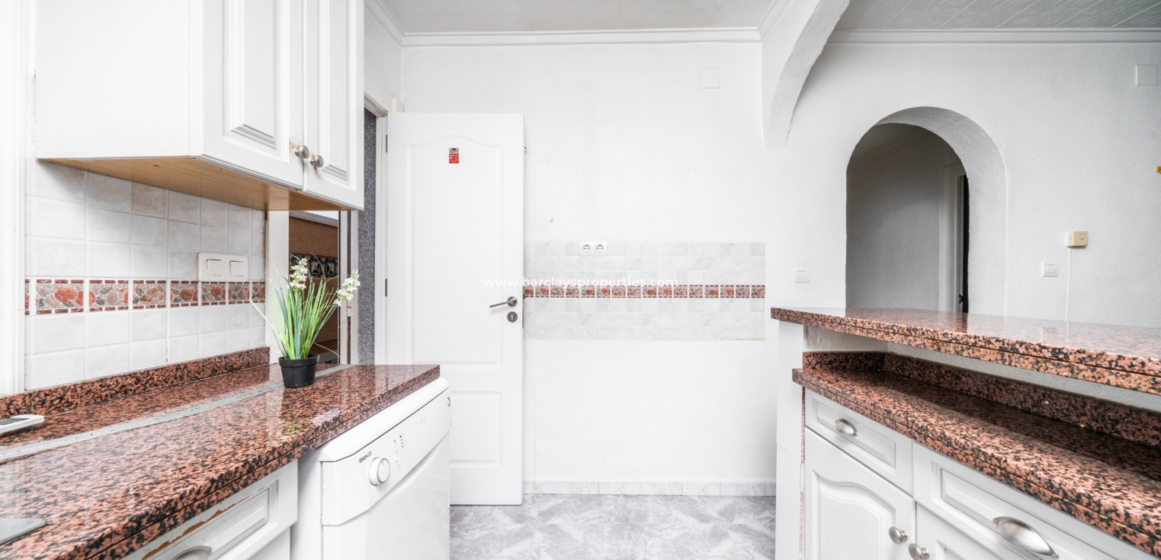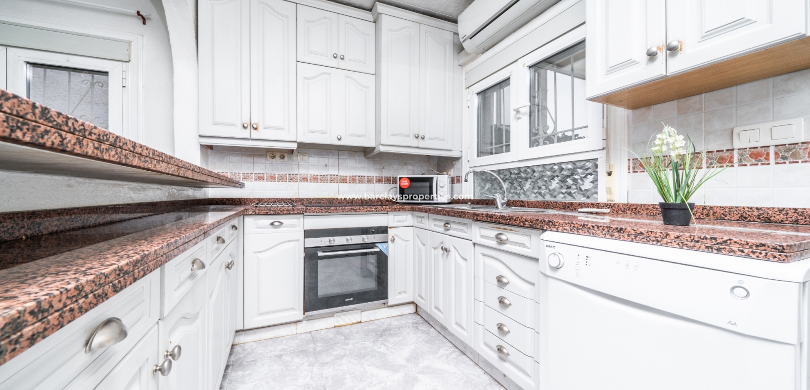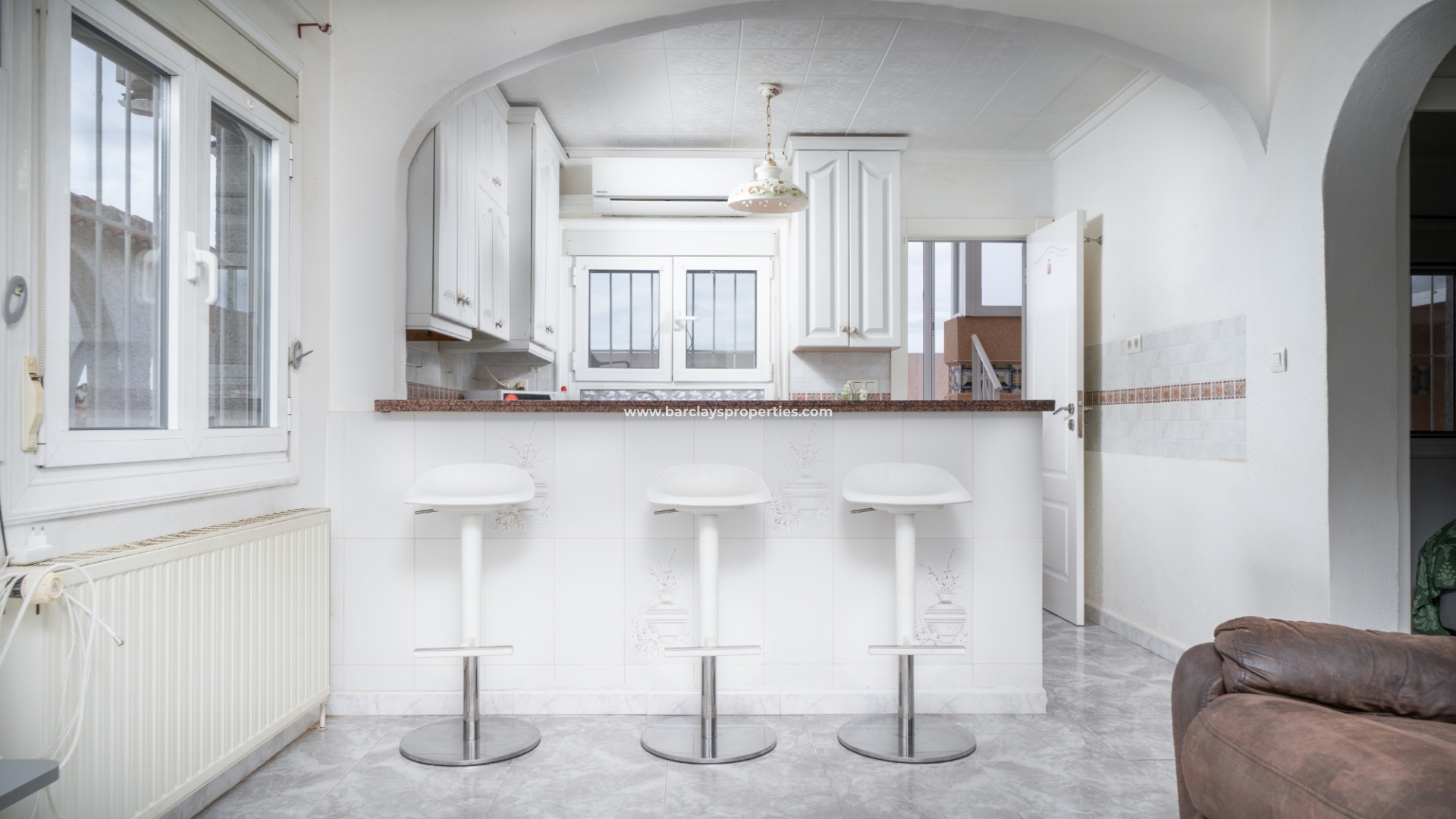De ingang leidt naar een schaduwrijke veranda, perfect om van zonnige dagen te genieten. Binnen is er een uitnodigend zitgedeelte dat overgaat in een lichte woonkamer met plafondventilator en een eetkamer die grenst aan de open, vernieuwde, frisse witte volledig uitgeruste keuken. De keuken is voorzien van airconditioning voor extra comfort.