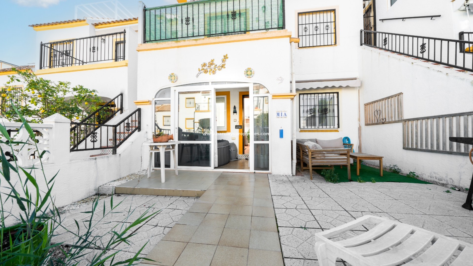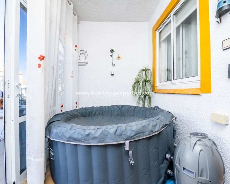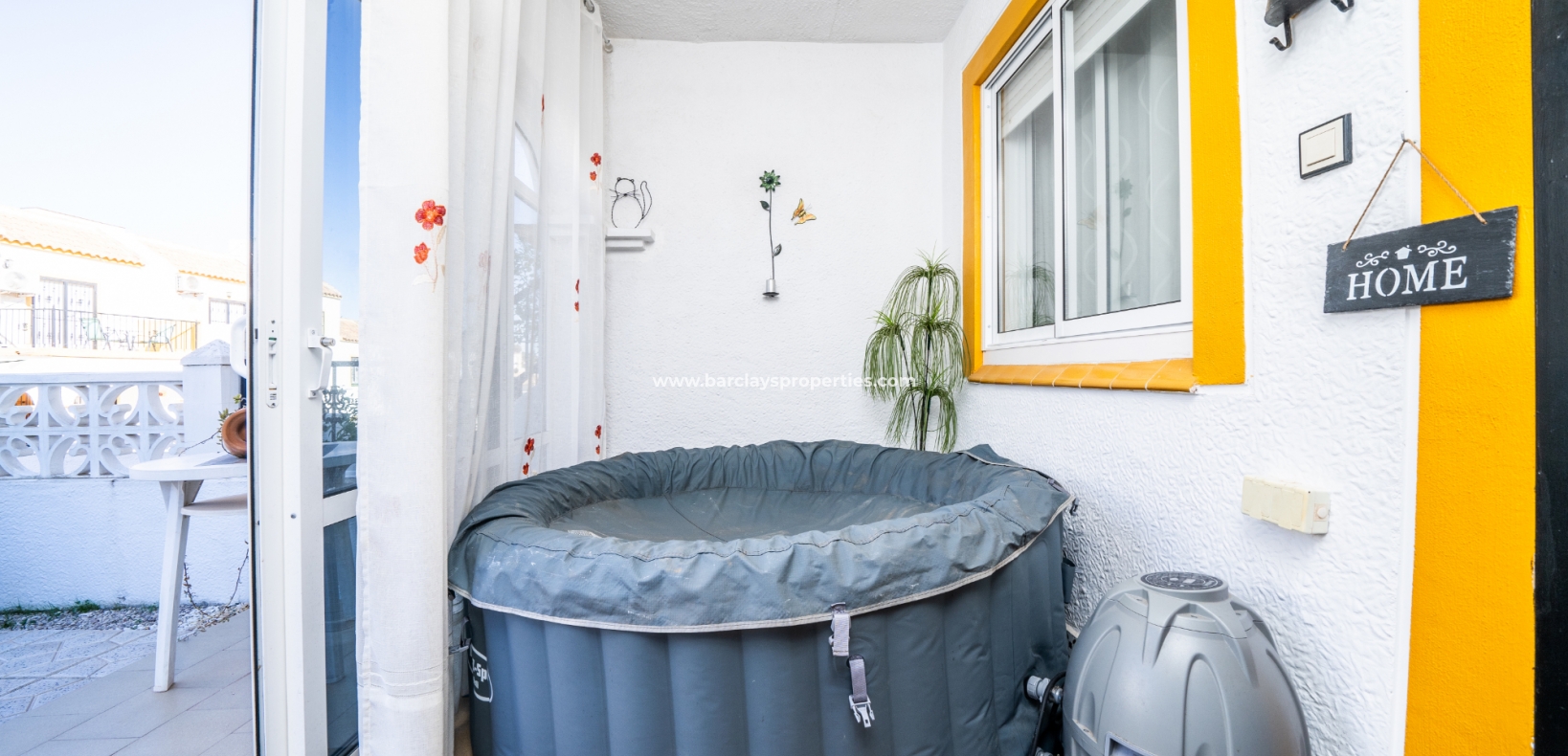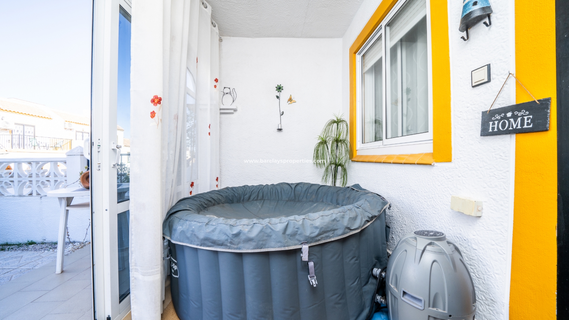 Het pand beschikt over een voorterras met zonnescherm en een afgesloten porch met jacuzzi, wat gezellige ruimtes creëert om te ontspannen en tot rust te komen. Aan de achterkant bevindt zich een kleine patio die verder gebruikswaarde toevoegt aan de ruimte.