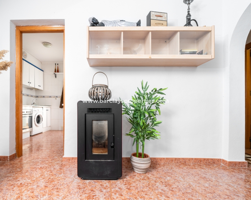 Binnen, de woonkamer met eetkamer is uitgerust ➡️ met een pelletkachel, die warmte biedt tijdens de koelere maanden. De keuken is volledig elektrisch en is verbonden met de achterpatio, waardoor extra gemak wordt geboden.
