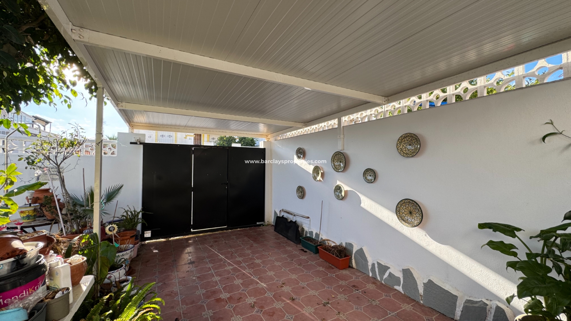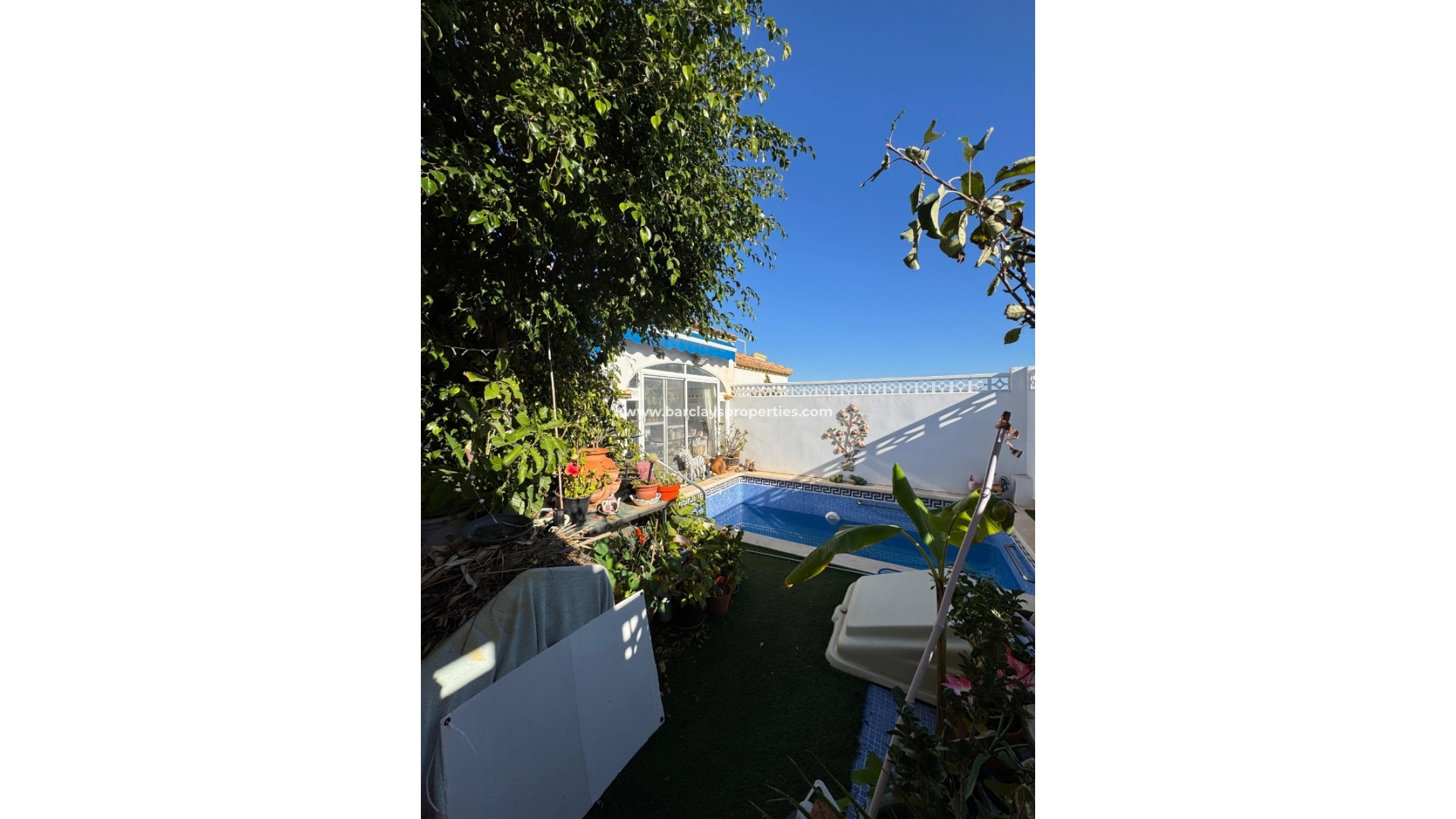 De woning heeft 3 slaapkamers en 2 badkamers en biedt privacy, met hoge muren rondom de voortuin, waar het privézwembad zich bevindt, aangevuld met kunstgras. Parkeren is mogelijk op het perceel, met een carport om uw voertuig het hele jaar door te beschermen.