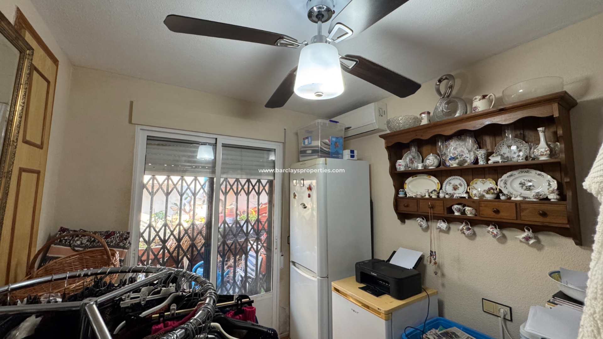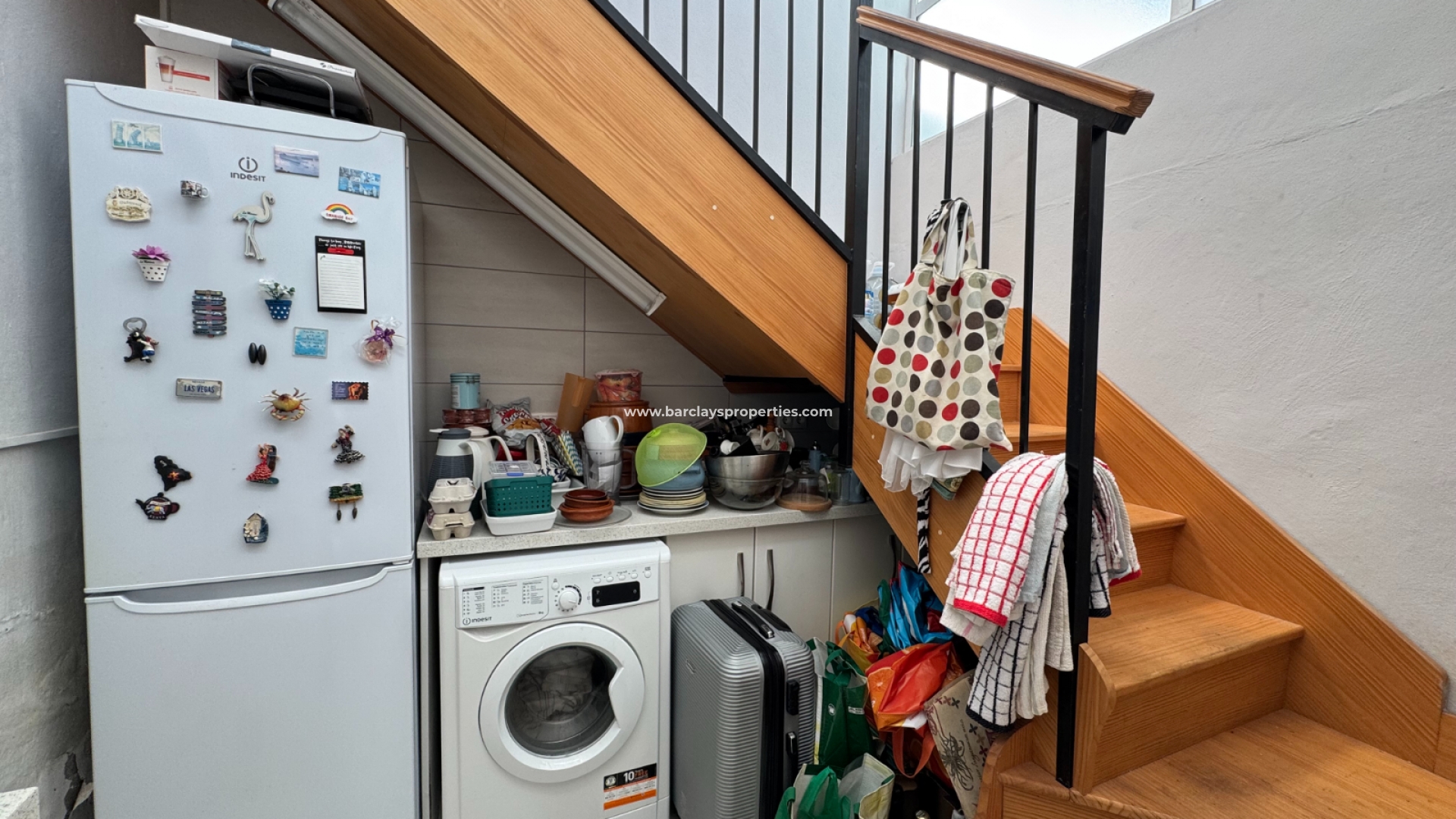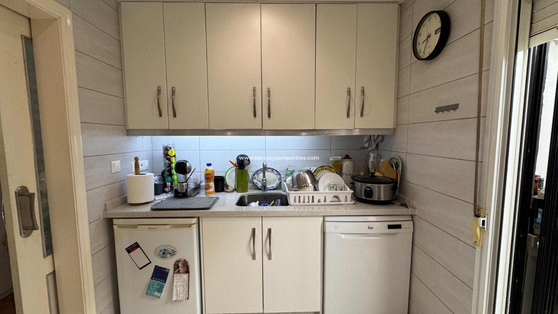 Een afgesloten veranda met plafondventilator kijkt uit over het zwembadgebied en biedt toegang tot het interieur van de woning. Binnen is de woonkamer voorzien van airconditioning en een plafondventilator, wat zorgt voor comfort het hele jaar door. De aparte keuken is gerenoveerd met een frisse witte uitstraling en moderne apparatuur. De aangrenzende bijkeuken biedt extra opbergruimte en herbergt momenteel een wasmachine, een koelkast en een elektrische waterverwarmer. Via een trap komt u in de serre, die uitkomt op een ruim dakterras met een prachtig uitzicht op het platteland.