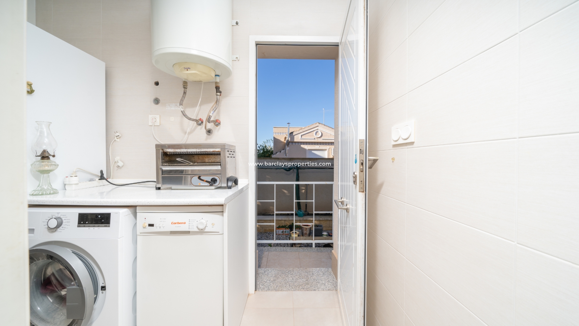 De uitnodigende woonkamer is licht en gezellig, met een open haard en elektrische rolluiken op de ramen. De aparte, volledig uitgeruste keuken is voorzien van een gaskookplaat en elektrische oven, en heeft een bijkeuken met een wasmachine en boiler.