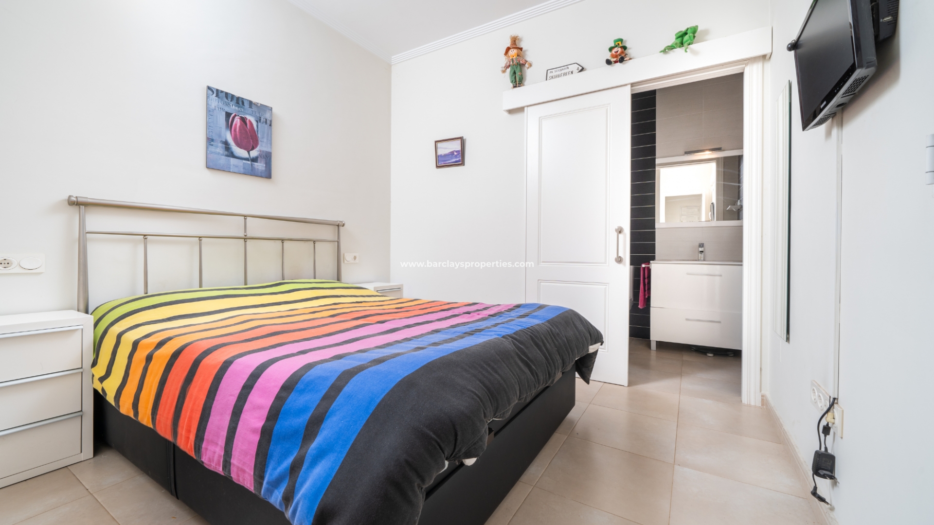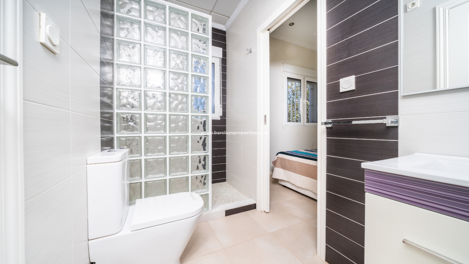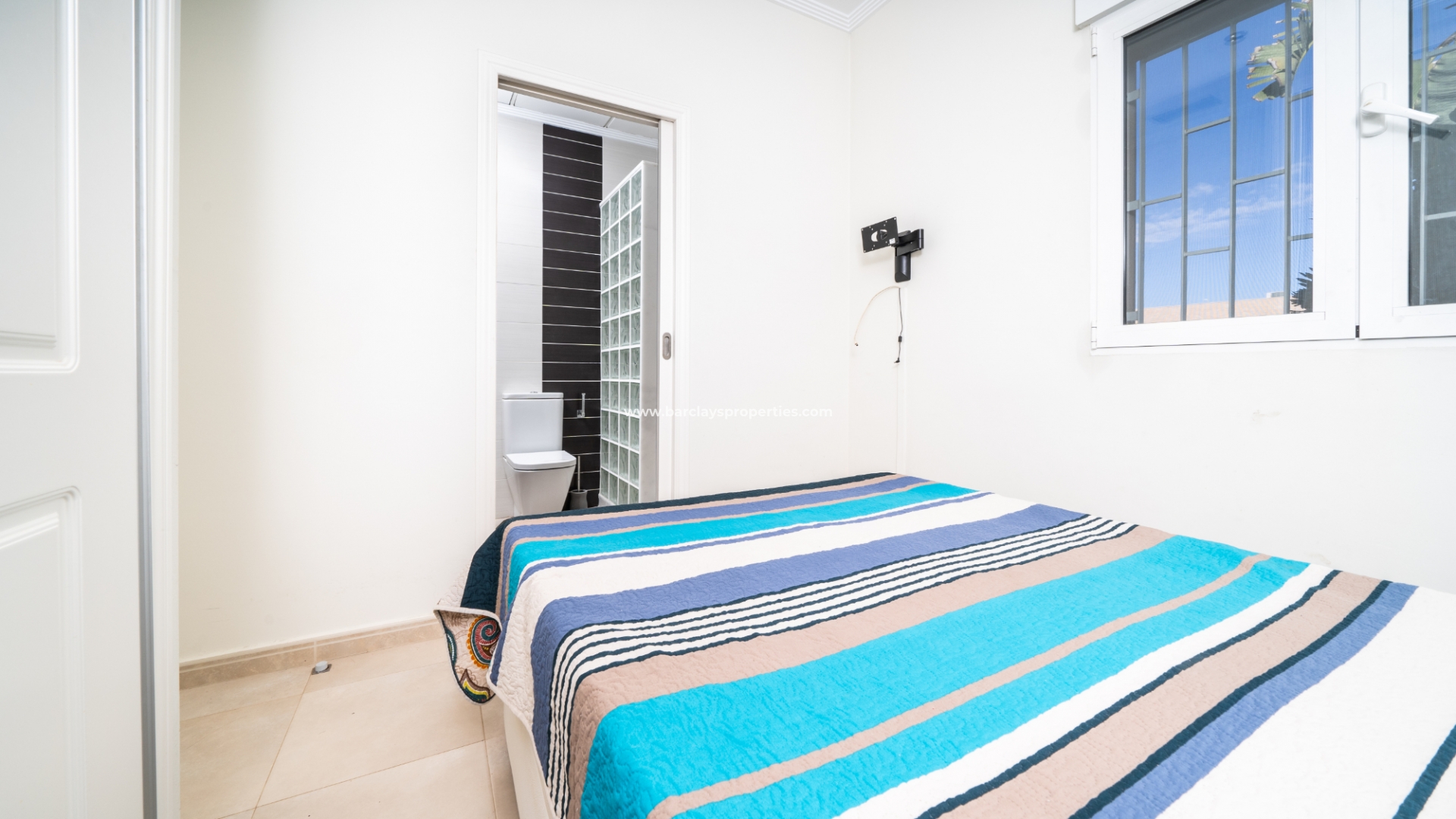 De villa beschikt over twee ruime tweepersoons slaapkamers, elk met ingebouwde kasten en een ensuite badkamer. De master slaapkamer heeft een inloopdouche, bidet en wastafel, terwijl de ensuite badkamer van de tweede slaapkamer een douche en wastafel heeft.