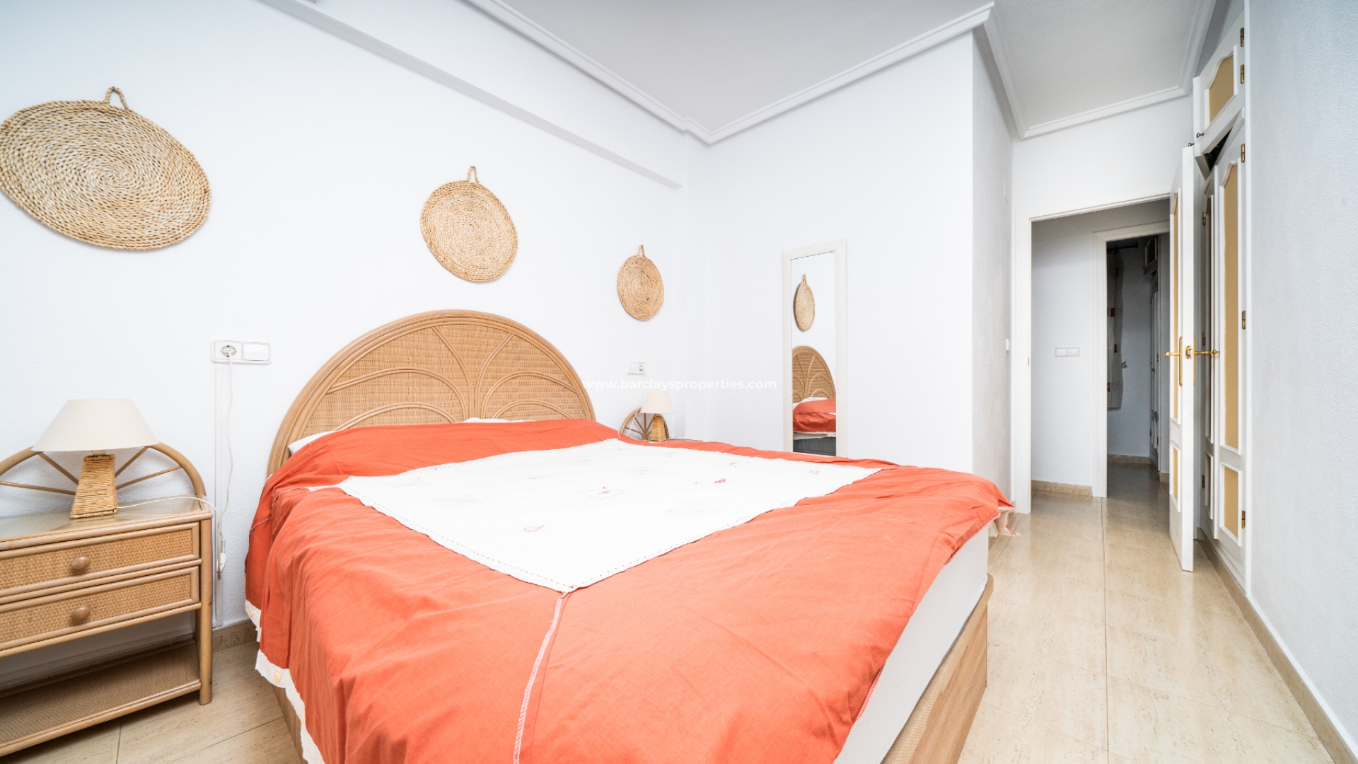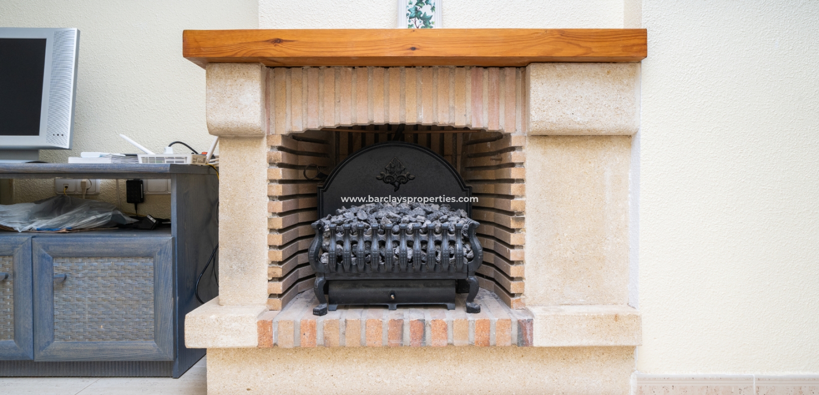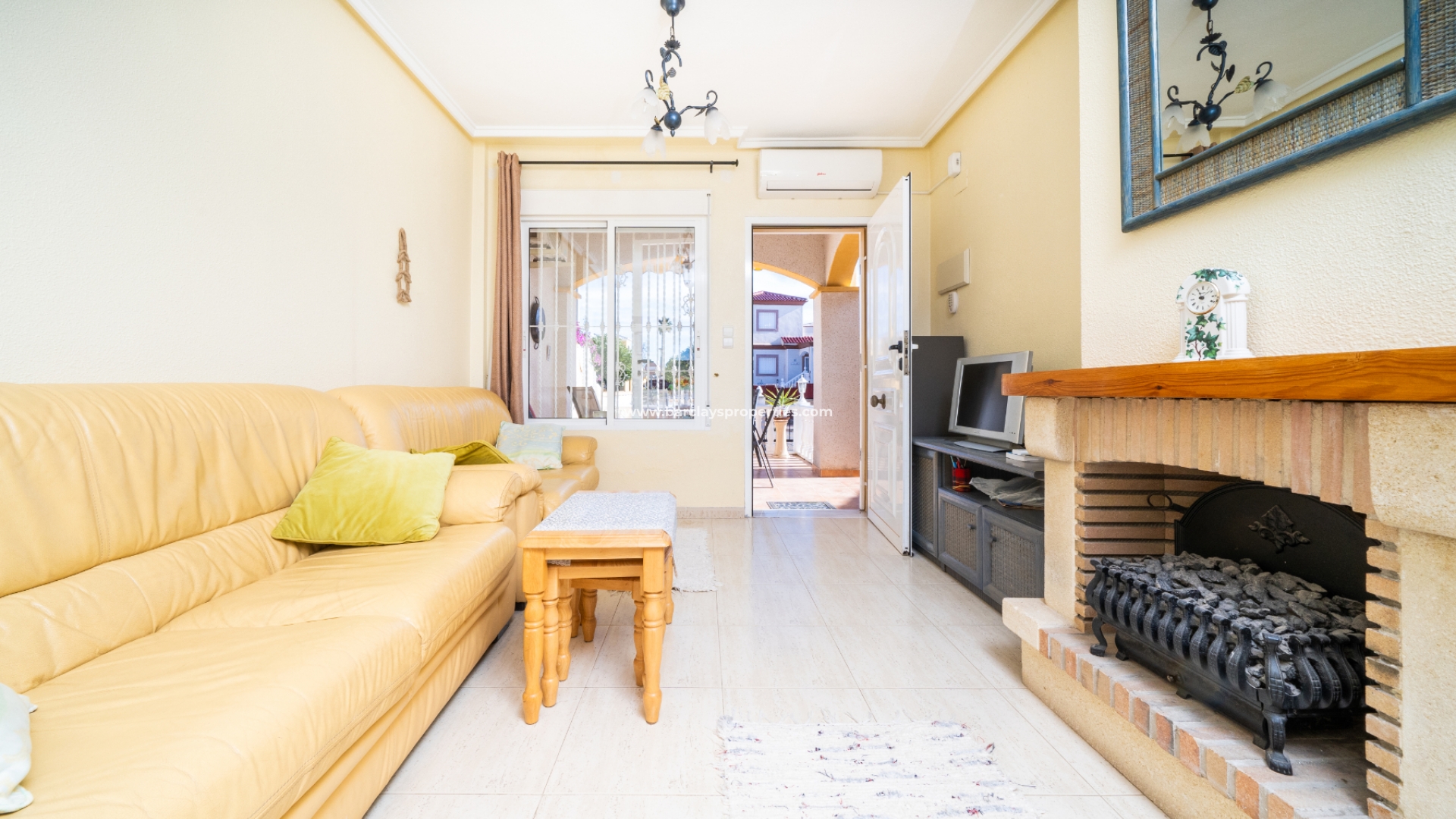 Een mooie overdekte voorterras met zitgedeelte en zonwering leidt naar het interieur van de woning en de uitnodigende woonkamer met eethoek, open haard en airconditioning voor comfort het hele jaar door. Vanuit de hal komen we in een tweepersoonskamer met airconditioning en ingebouwde kasten, een kamer met twee bedden, plafondventilator en ingebouwde kast, en een badkamer met wanddouche, toilet en wastafel met spiegel. De onafhankelijke, ingerichte keuken heeft een toegangsd deur naar de achtertuin met zitgedeelte, zonwering, bijkeuken/bergruimte en direct toegang via de tuinpoort naar het gemeenschappelijk zwembad.