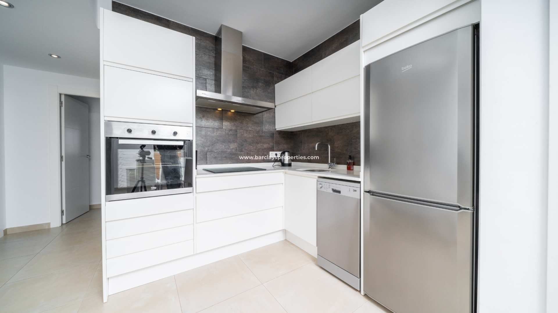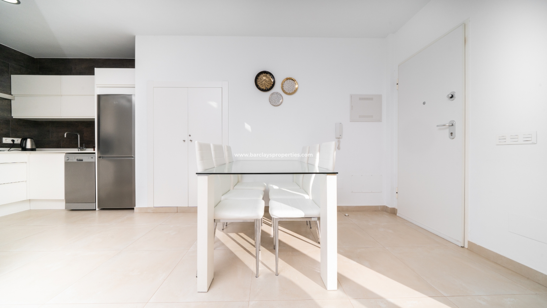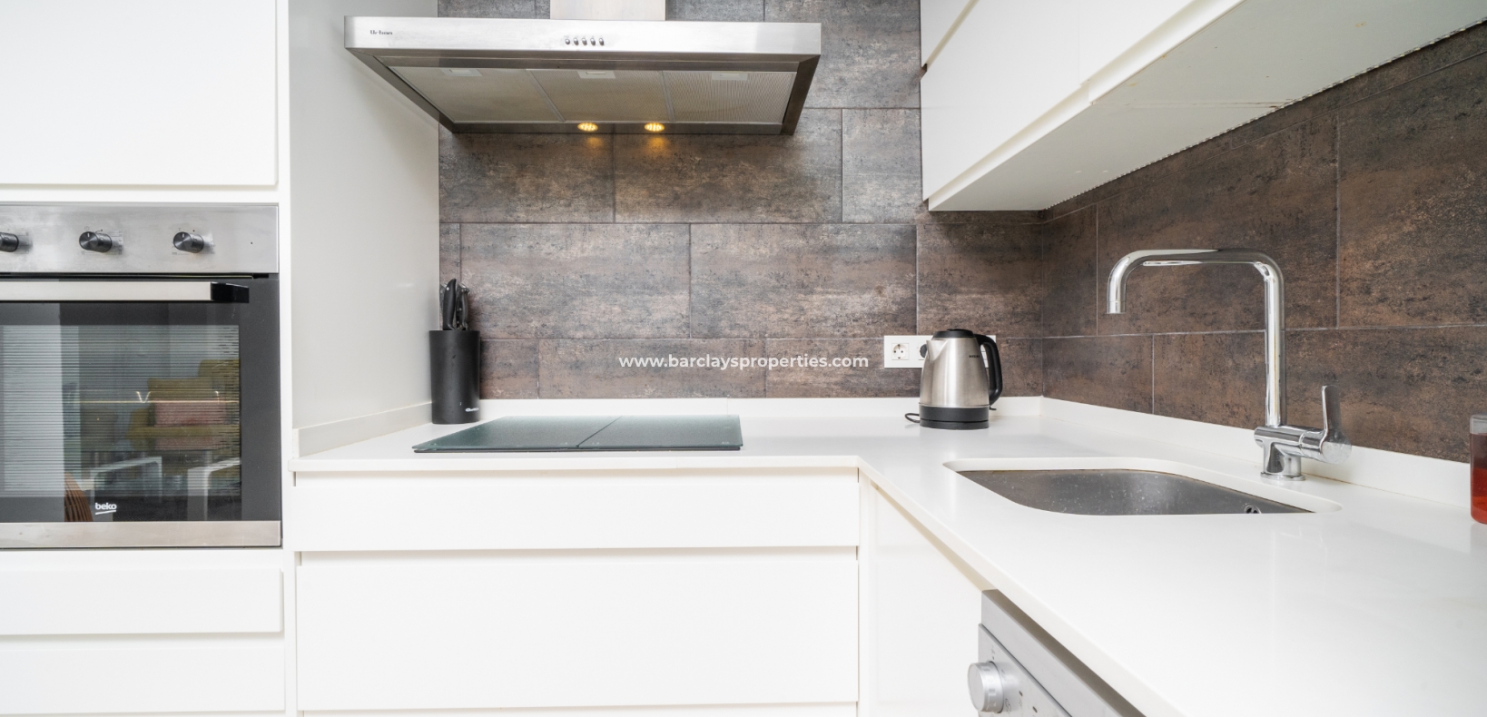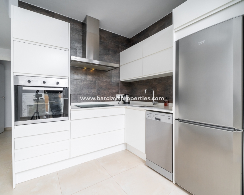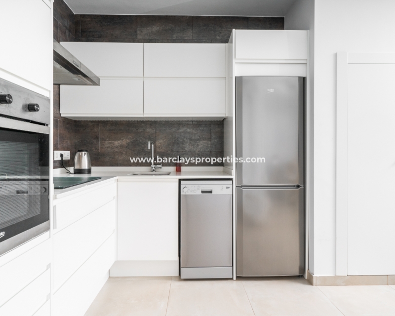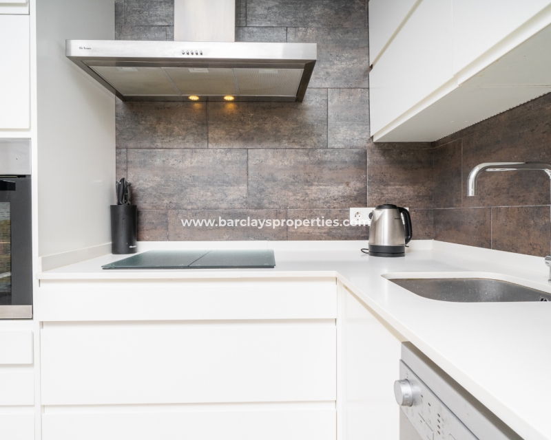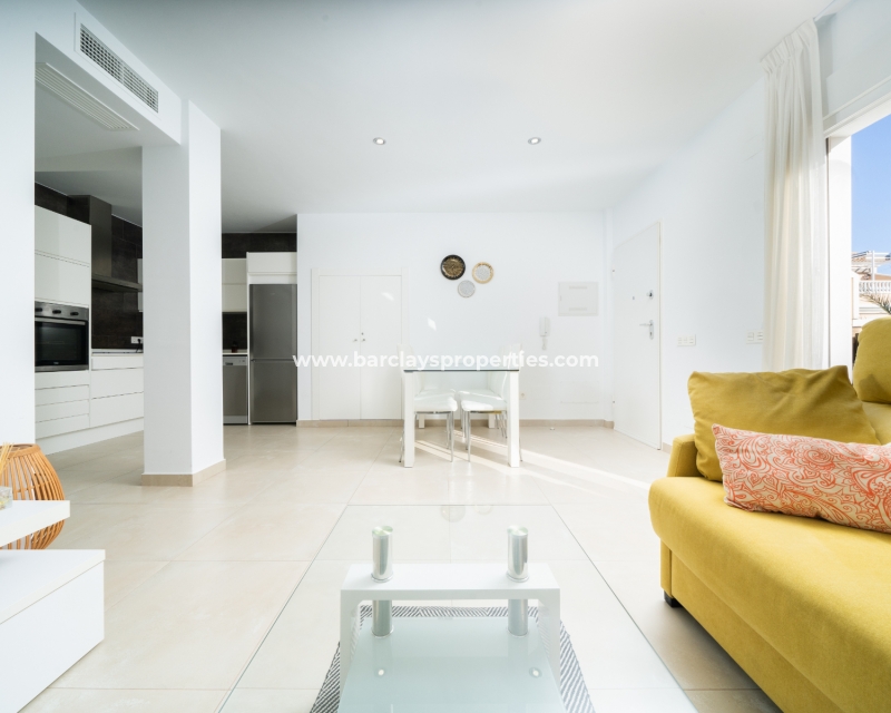 De lichte en luchtige woon-/eetkamer heeft openslaande deuren naar het zonneterras en loopt naadloos door naar de open, frisse witte keuken die is uitgerust met moderne voorzieningen, spotverlichting, een elektrische vaatwasser en een handige opbergruimte onder de trap die leidt naar het solarium. Een utility kast herbergt de wasmachine en boiler voor extra praktisch gebruik.