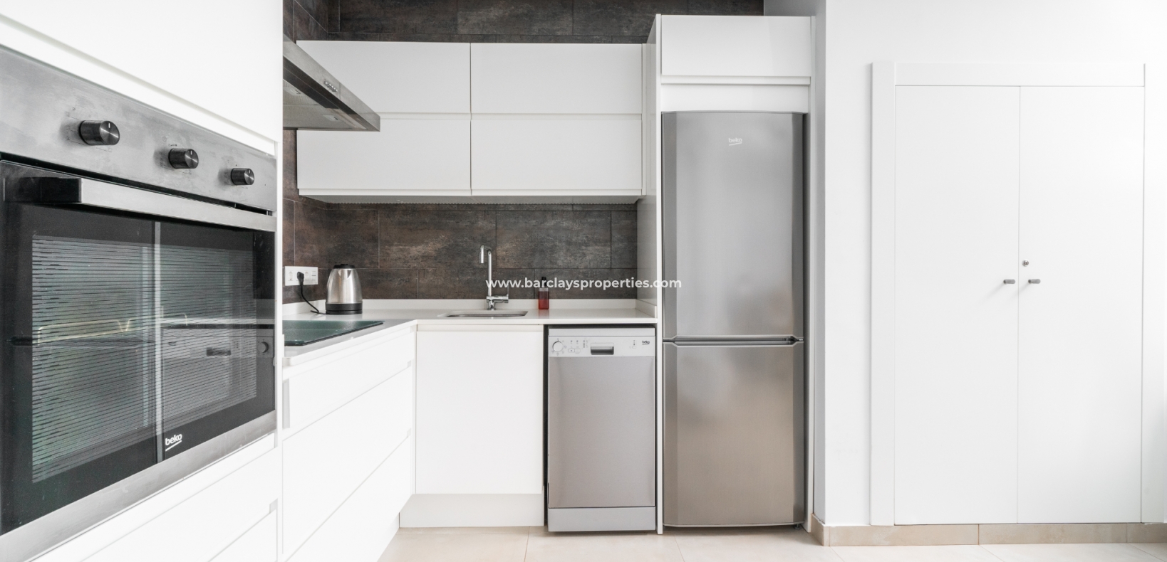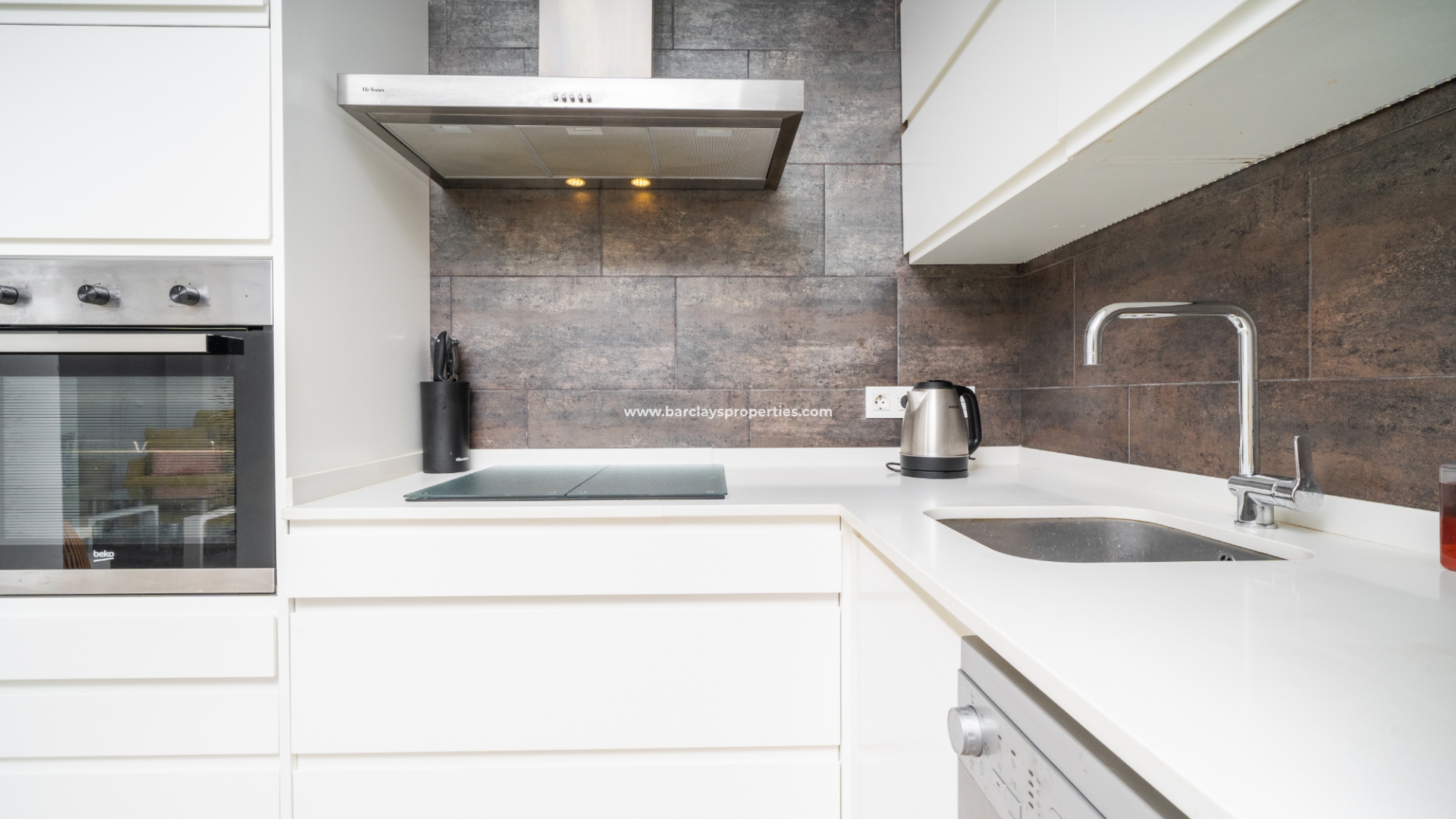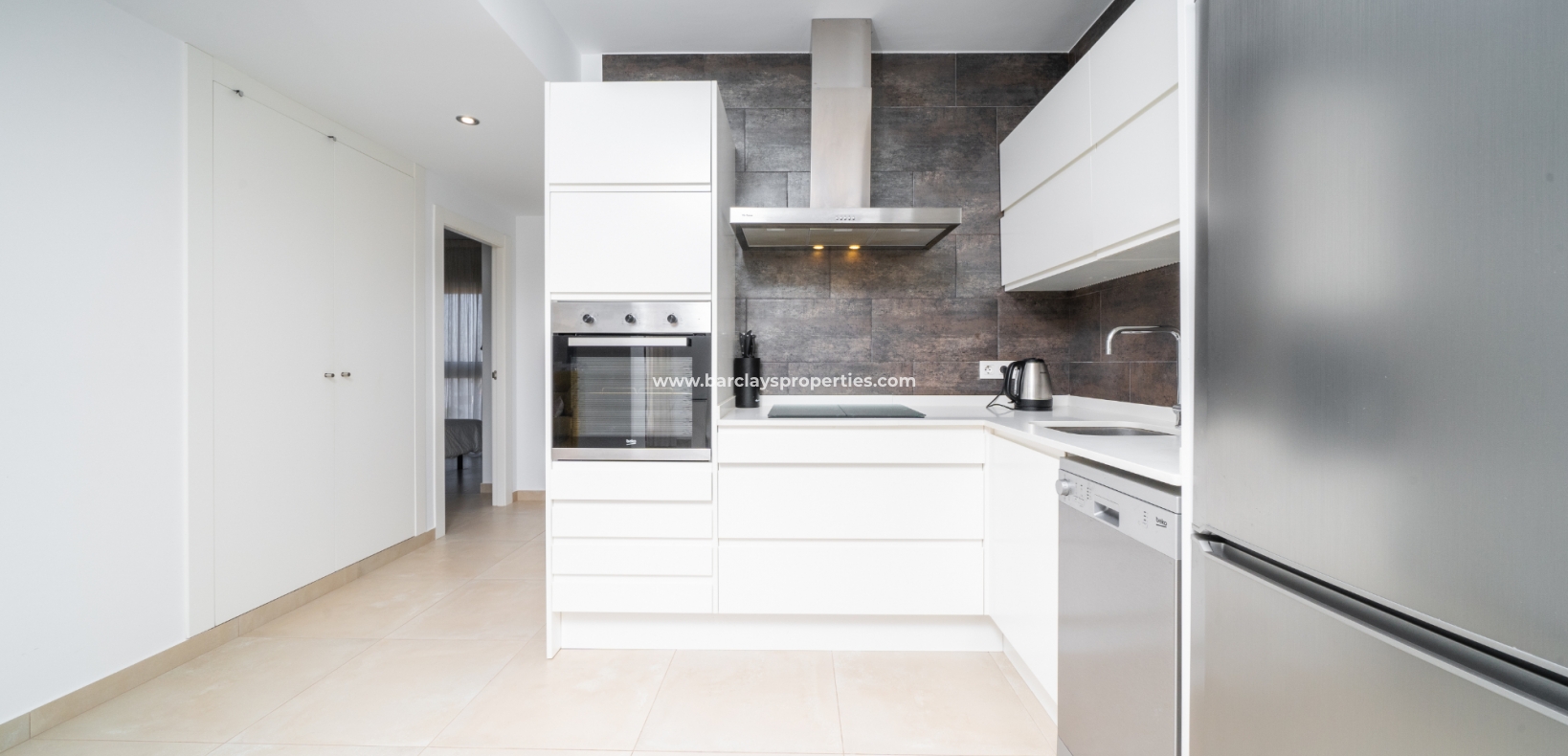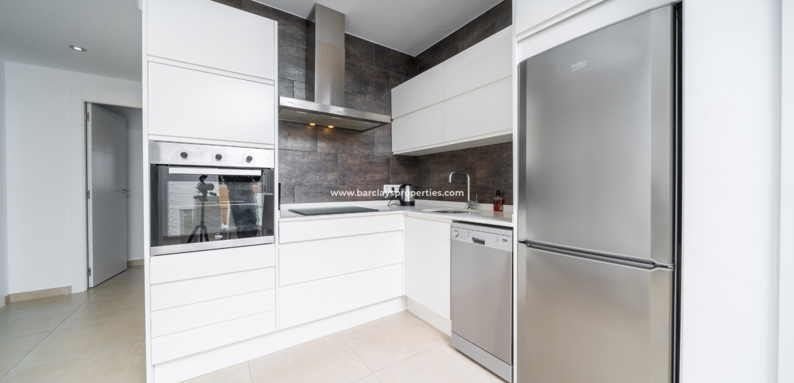 De lichte en luchtige woon-/eetkamer heeft openslaande deuren naar het zonneterras en loopt naadloos door naar de open, frisse witte keuken die is uitgerust met moderne voorzieningen, spotverlichting, een elektrische vaatwasser en een handige opbergruimte onder de trap die leidt naar het solarium. Een utility kast herbergt de wasmachine en boiler voor extra praktisch gebruik.