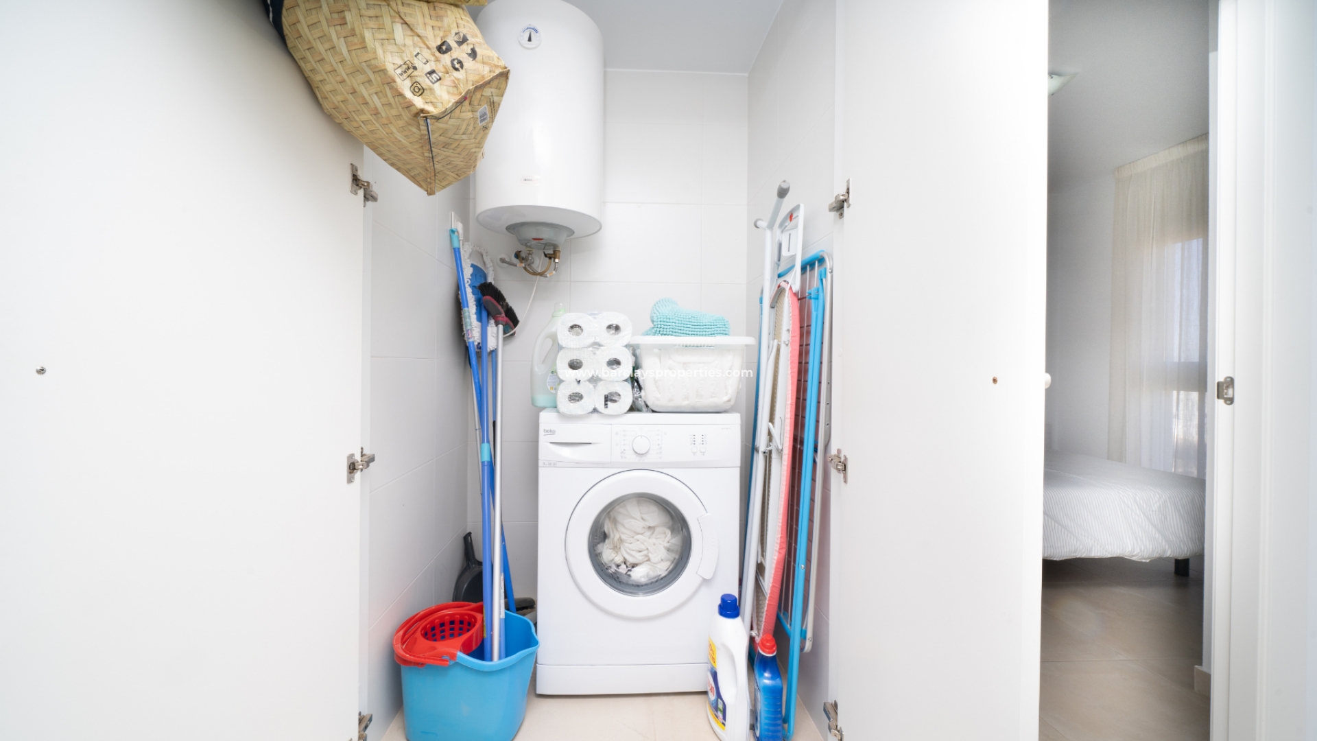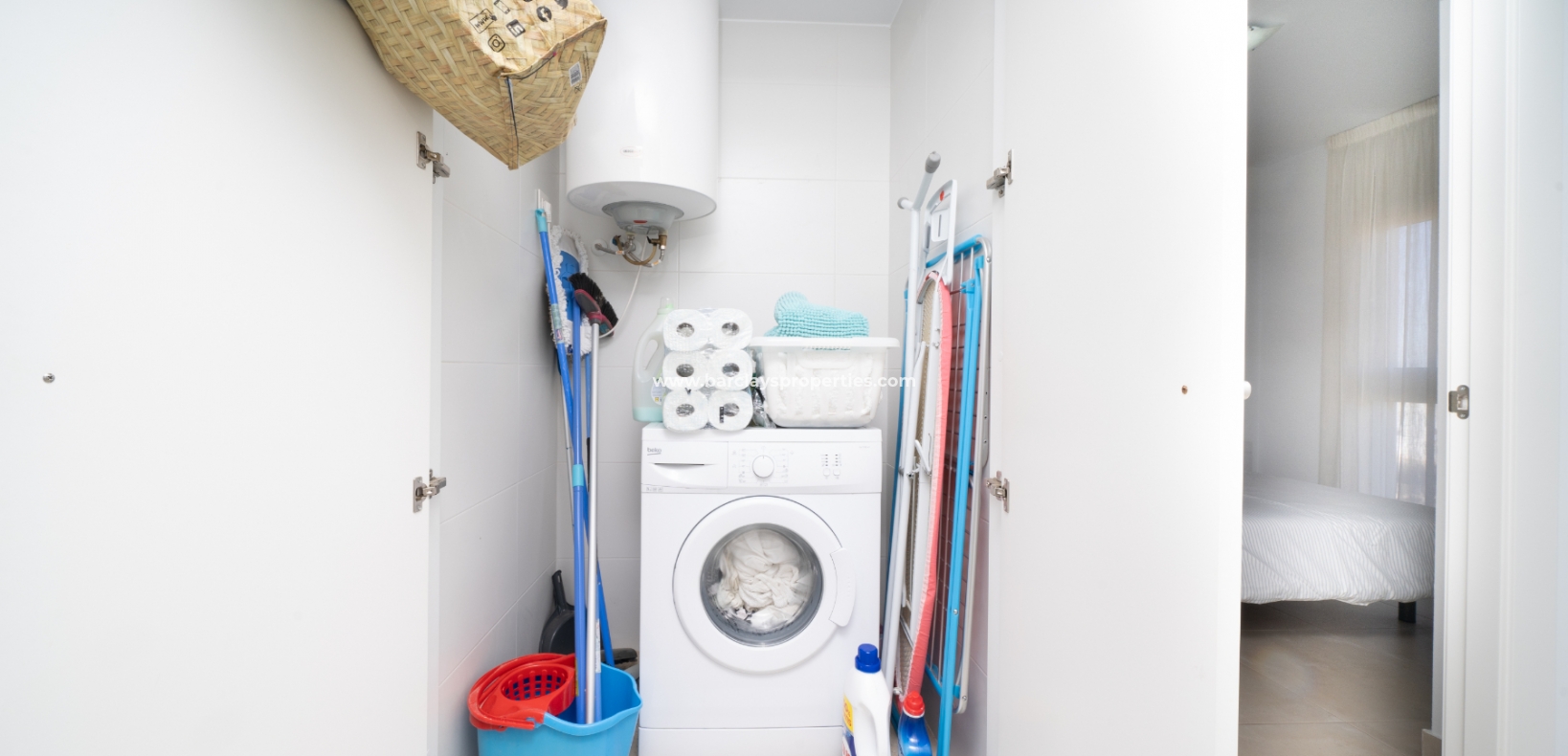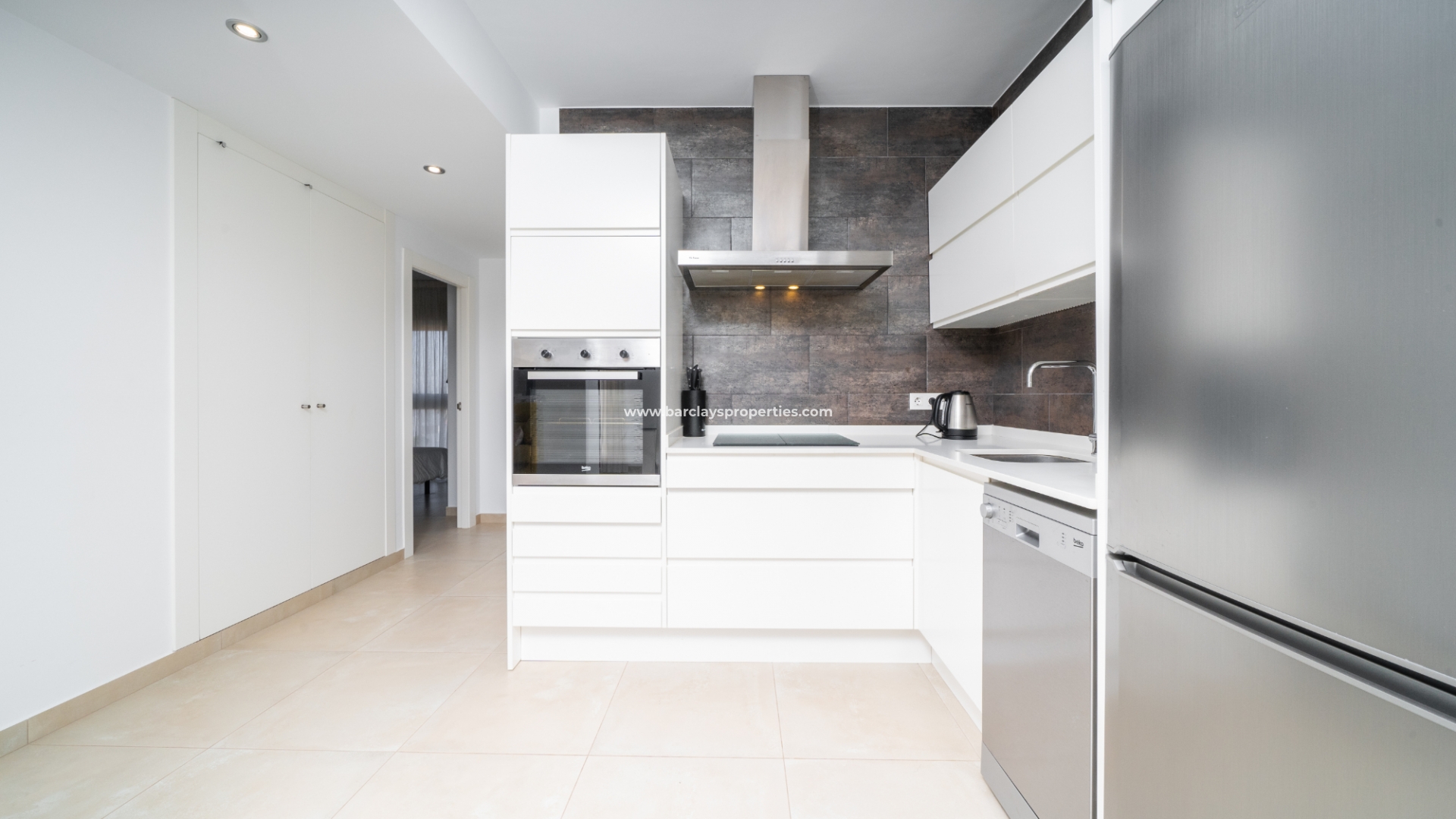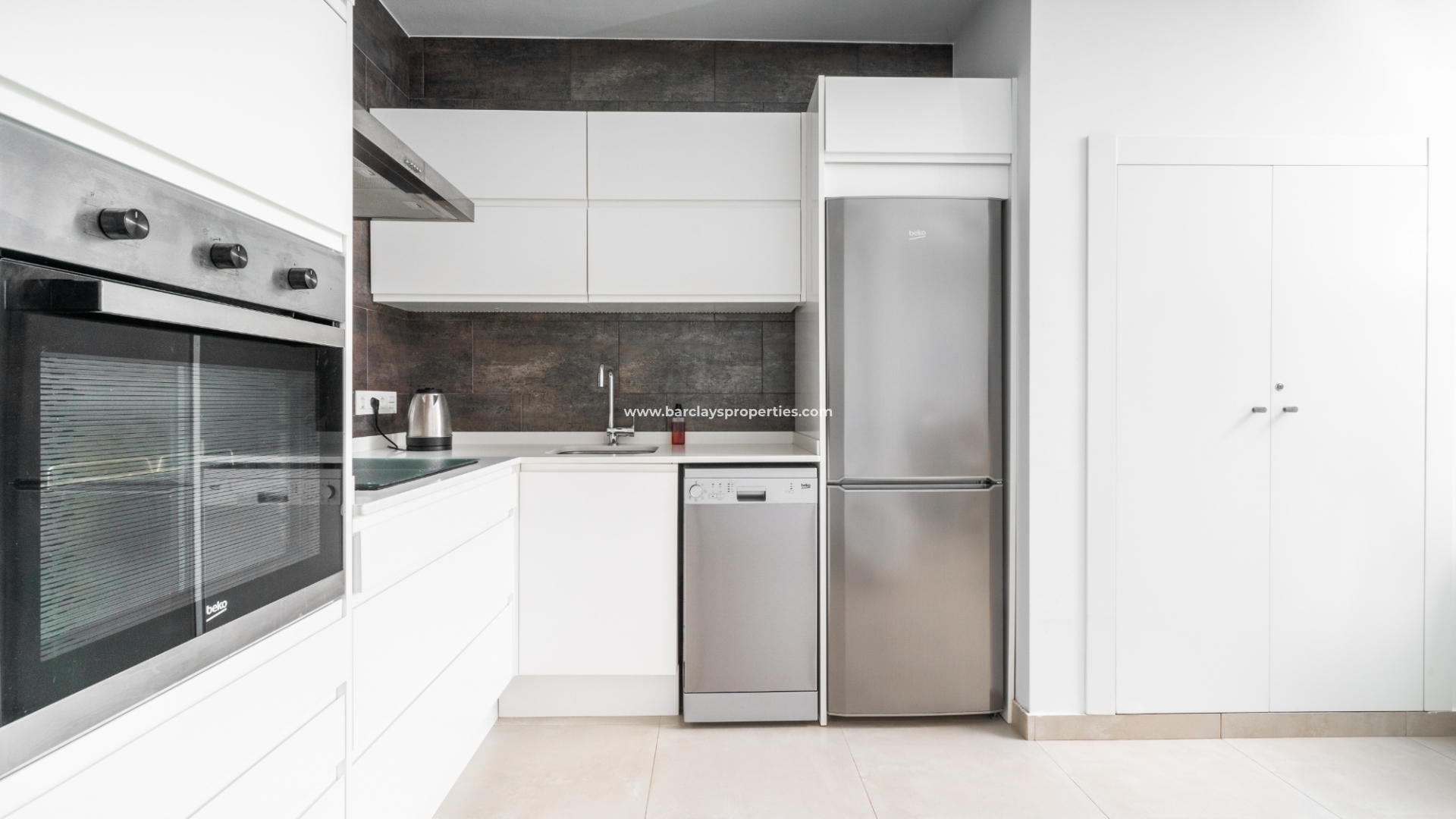 De lichte en luchtige woon-/eetkamer heeft openslaande deuren naar het zonneterras en loopt naadloos door naar de open, frisse witte keuken die is uitgerust met moderne voorzieningen, spotverlichting, een elektrische vaatwasser en een handige opbergruimte onder de trap die leidt naar het solarium. Een utility kast herbergt de wasmachine en boiler voor extra praktisch gebruik.