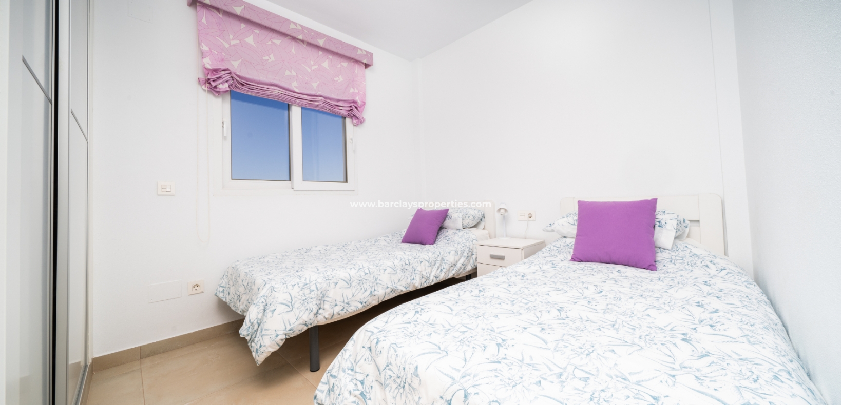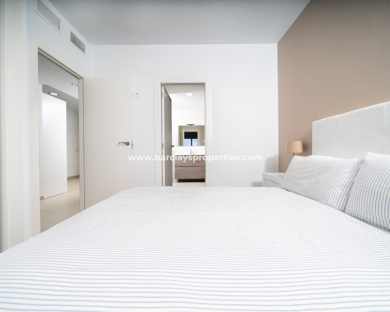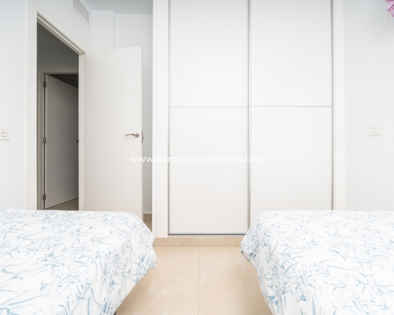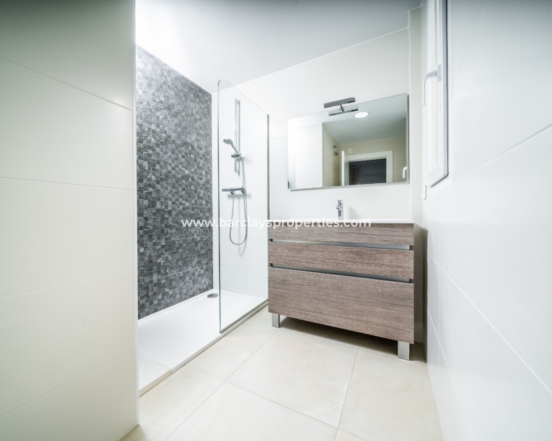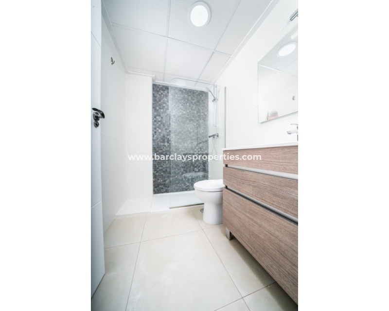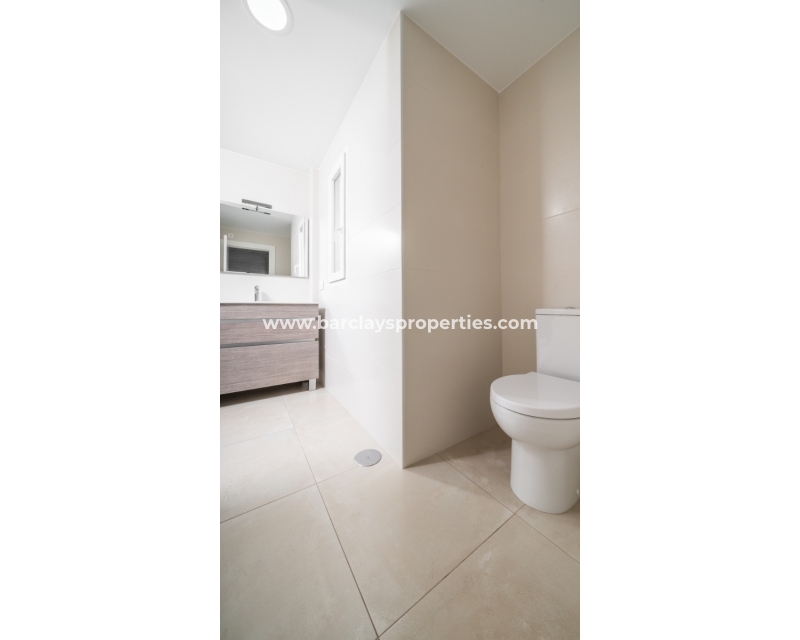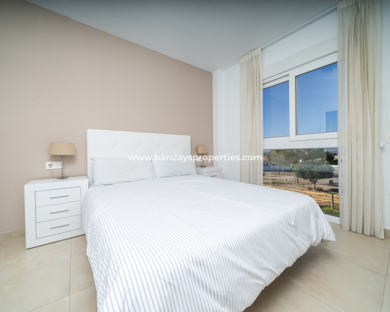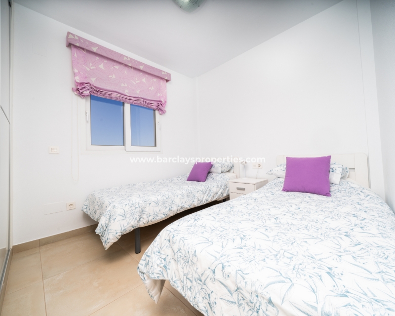 De master slaapkamer heeft ingebouwde kasten en een en-suite badkamer met een grote douche, wastafelmeubel en toilet. De tweede slaapkamer, ook met ingebouwde kasten, biedt een schilderachtig uitzicht op de bergen. Een tweede badkamer bevat een inloopdouche, wastafelmeubel en toilet.