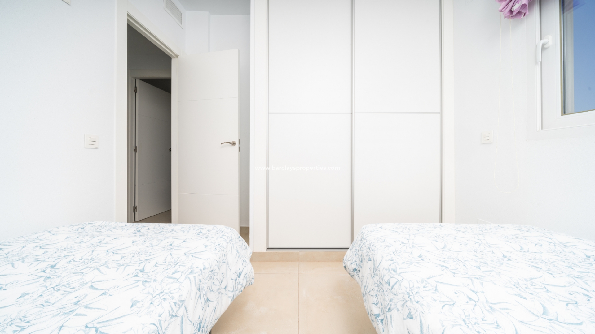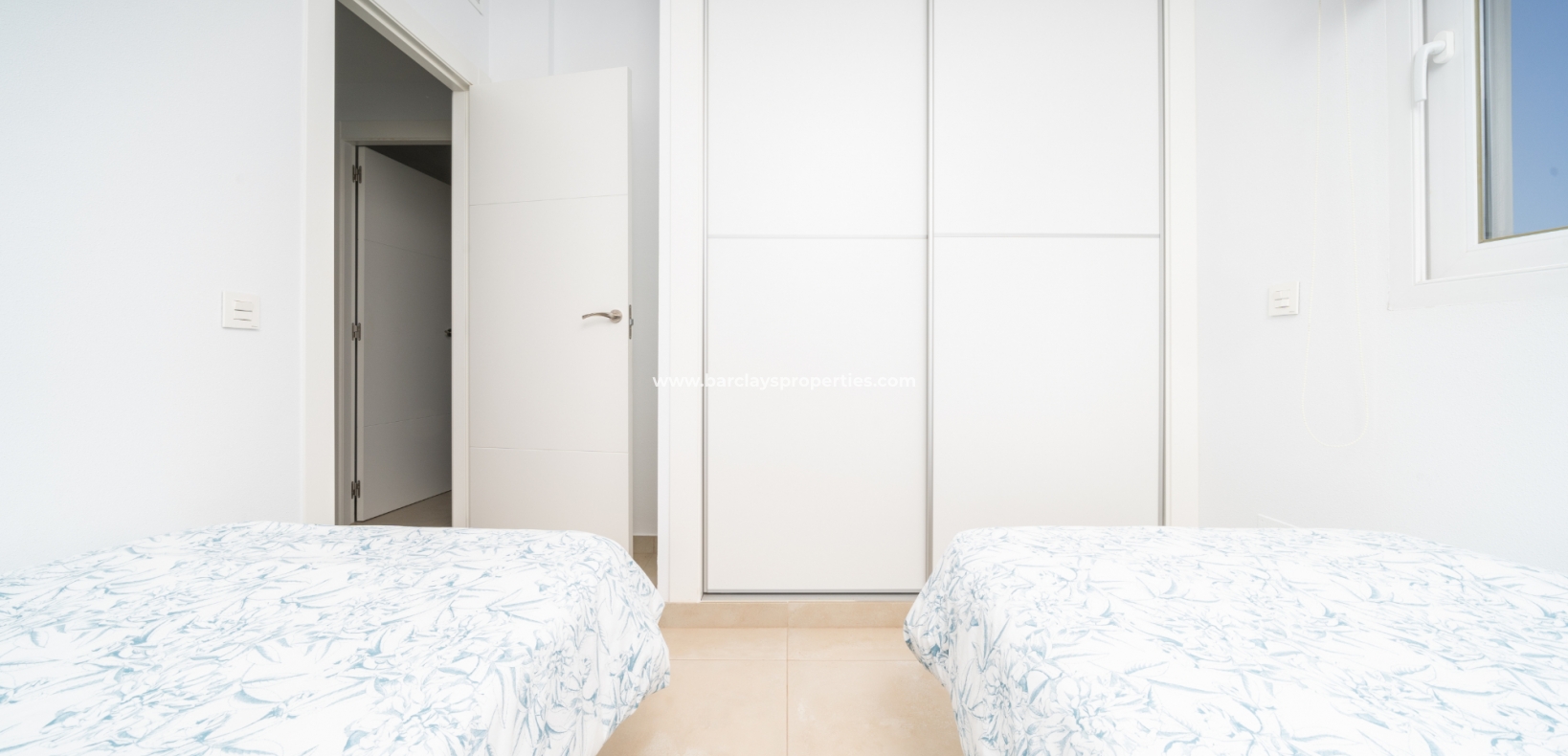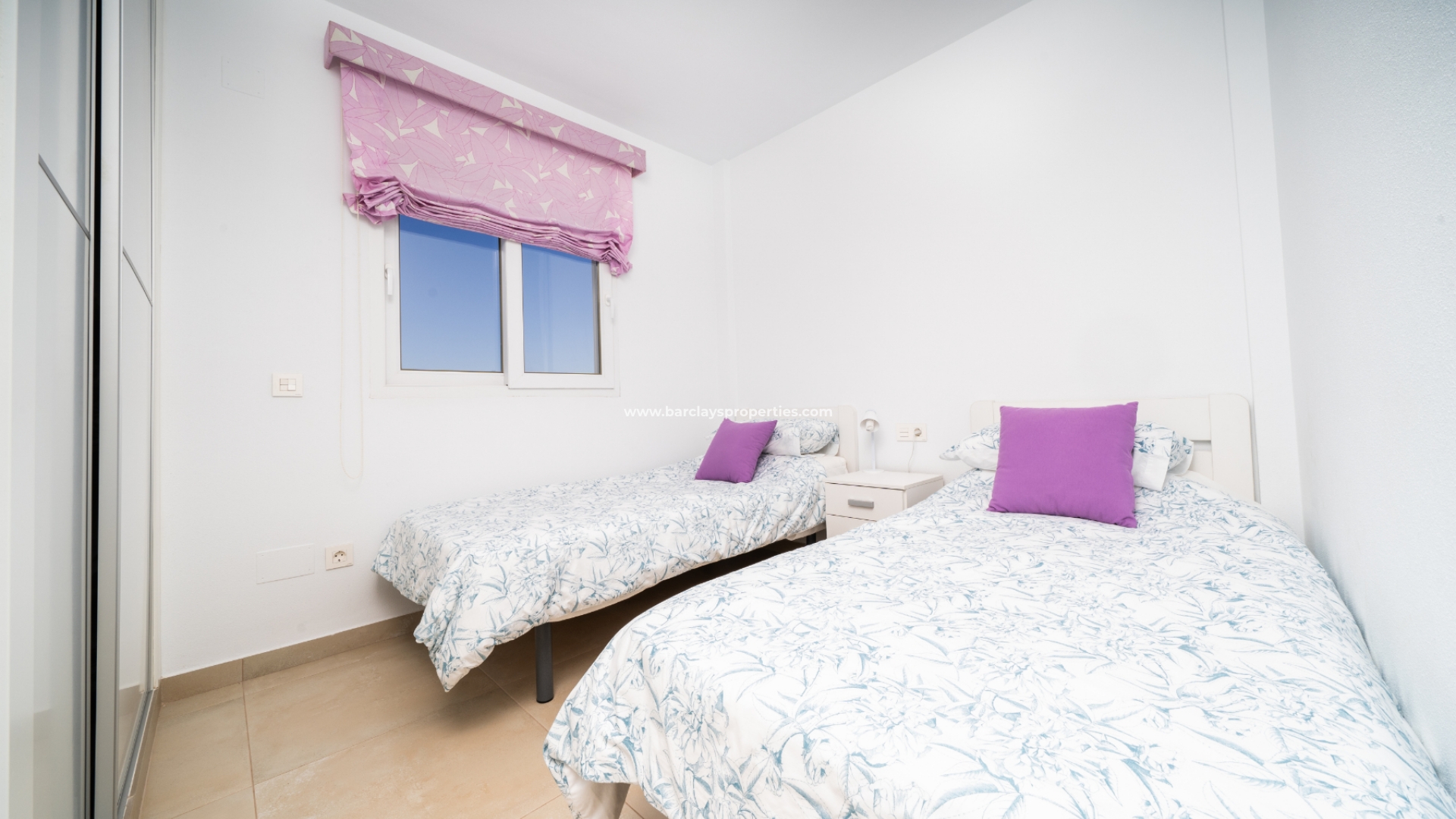 De master slaapkamer heeft ingebouwde kasten en een en-suite badkamer met een grote douche, wastafelmeubel en toilet. De tweede slaapkamer, ook met ingebouwde kasten, biedt een schilderachtig uitzicht op de bergen. Een tweede badkamer bevat een inloopdouche, wastafelmeubel en toilet.